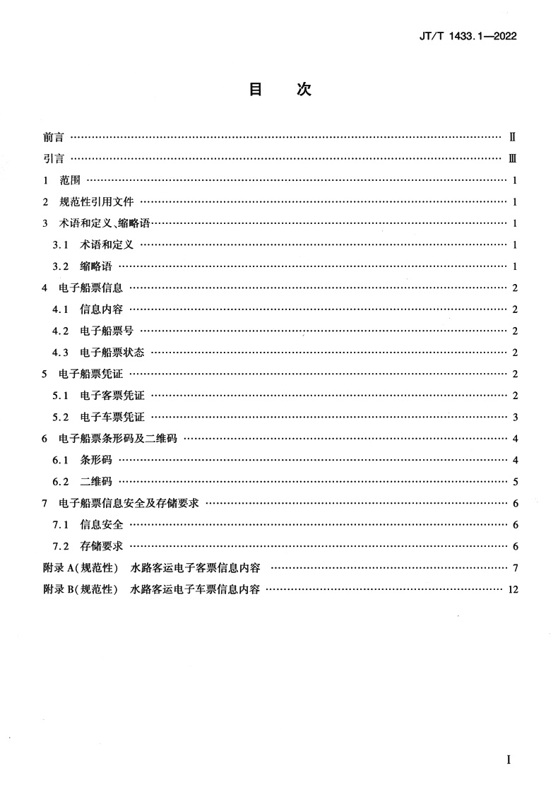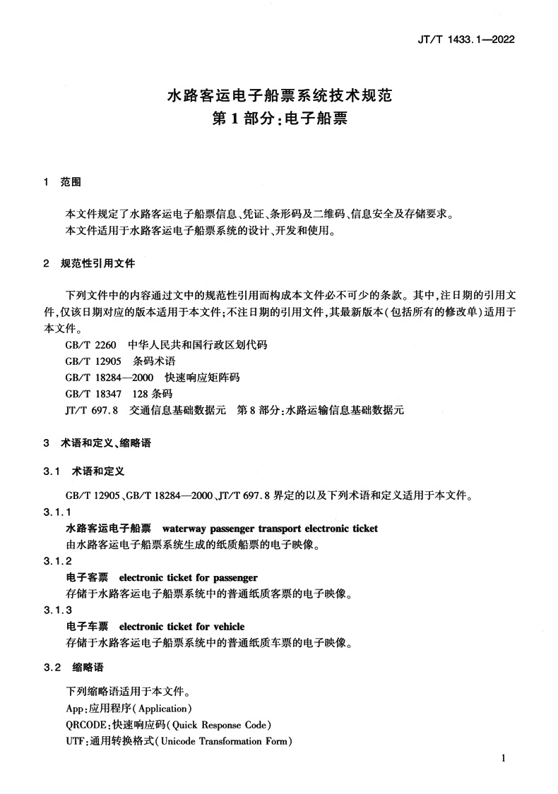 水路客运电子船票系统技术规范 第1部分:电子船票(JT/T 1433.1—2022)
