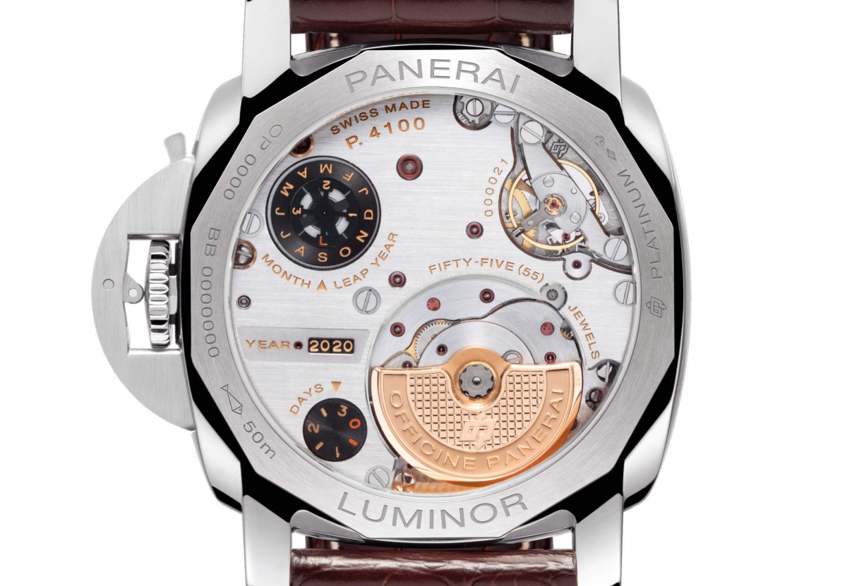 | 机芯 | 自动机械 P.4100自动上链机芯,完全由沛纳海研制,15 1/2法分(35.1毫米),厚7.0 毫米,55石,Glucydur®平衡摆轮,每小时振动28,800次(相当于4赫兹)。KIF Parechoc®防震装置。3日动力储存,两个发条盒,秒针归零装置。 | 表径 | 44 mm |
