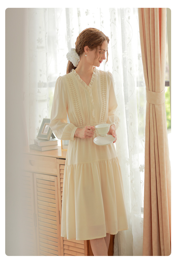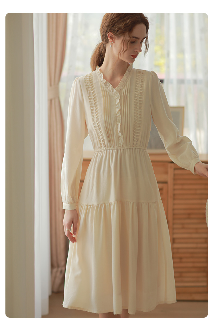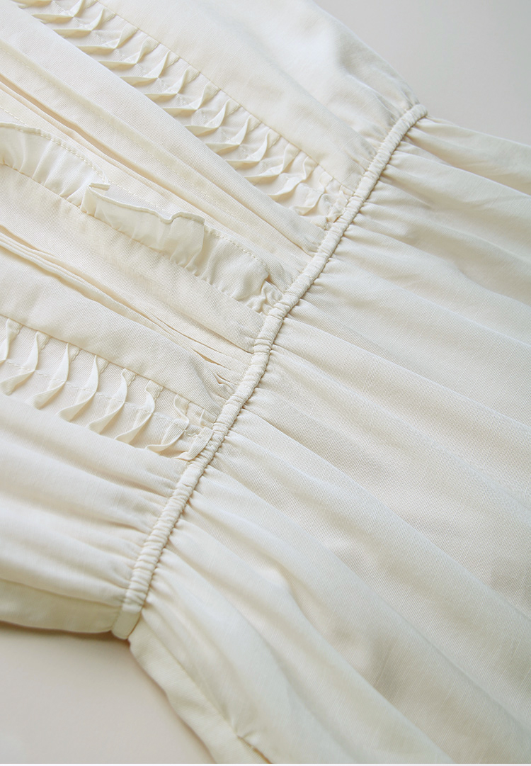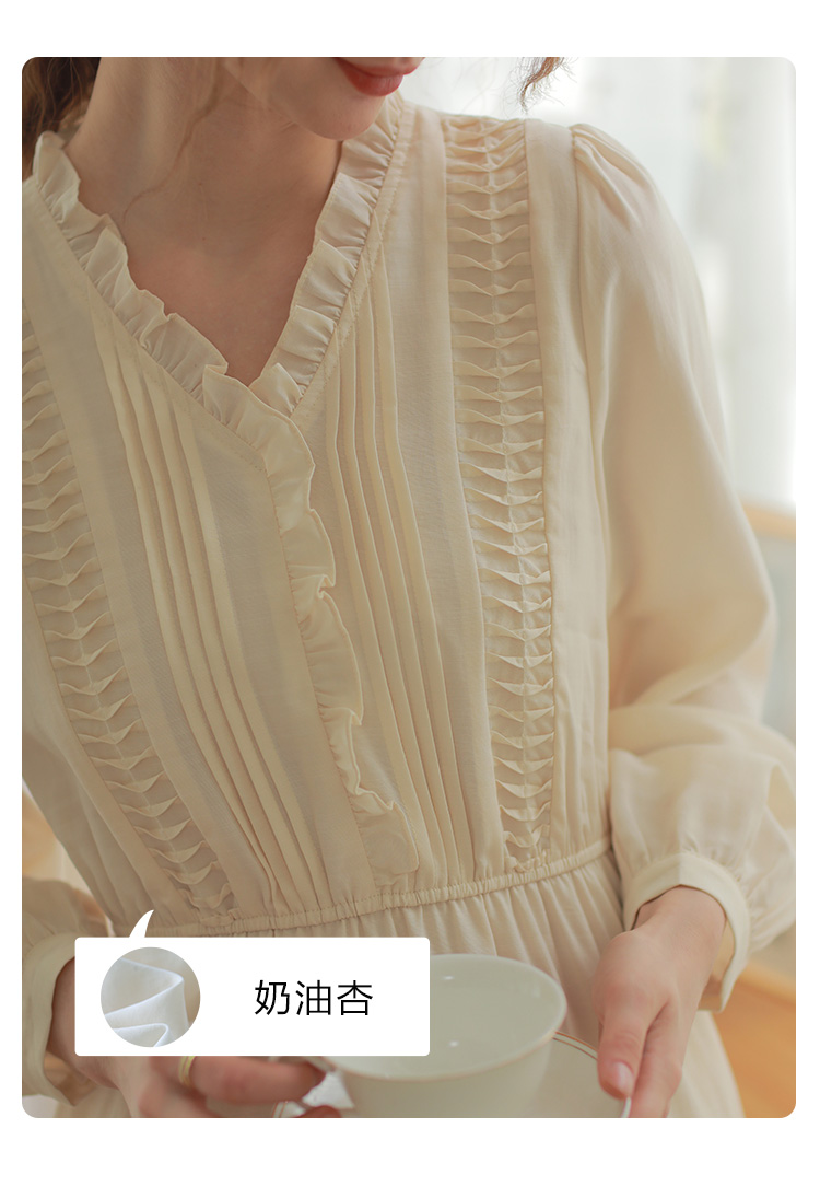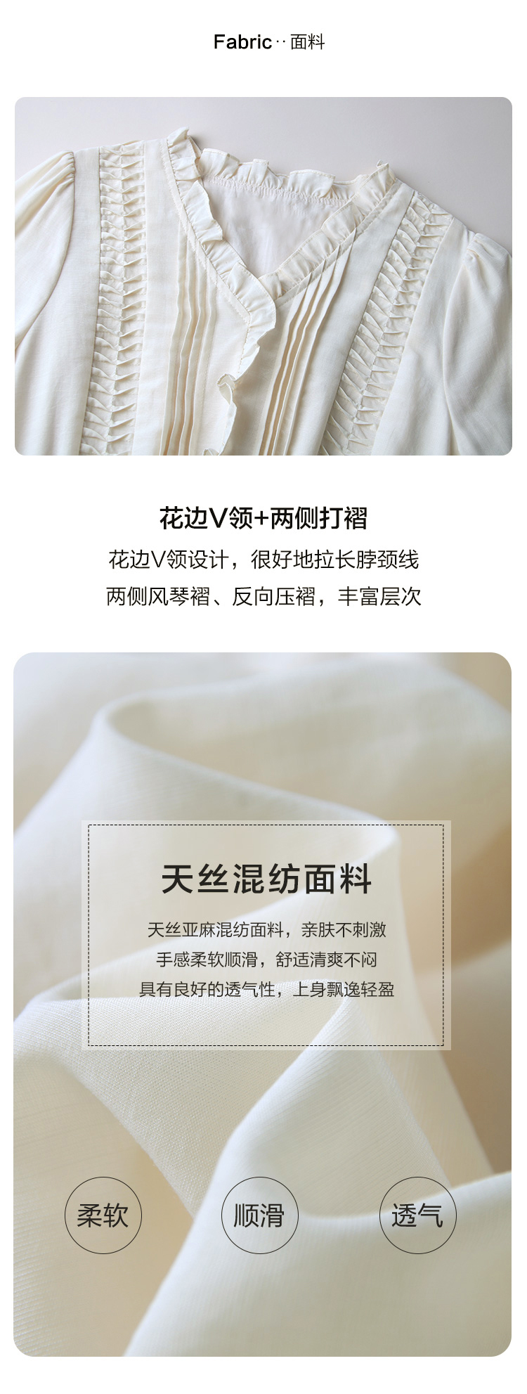 V领可以很好地拉长脖颈线条 对圆脸、方脸的姐妹们很友好 木耳边从领口顺延到假襟,温柔甜美 两侧风琴褶、反向压褶,丰富整体层次 |