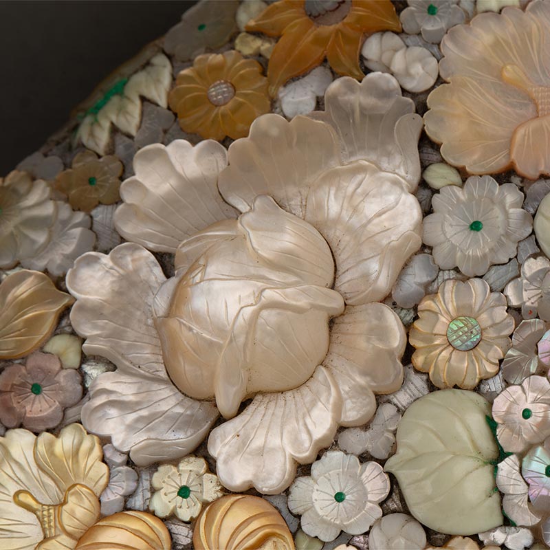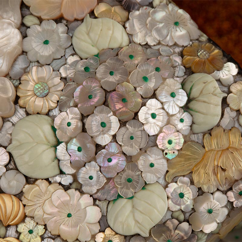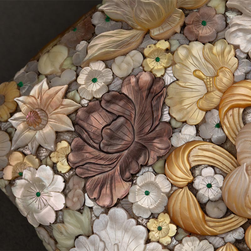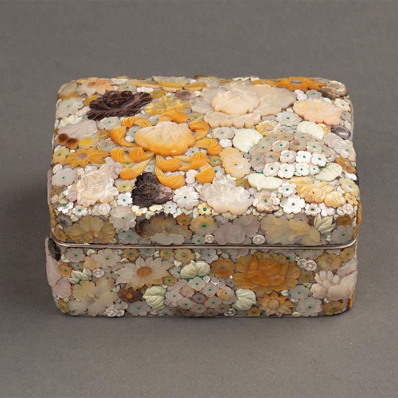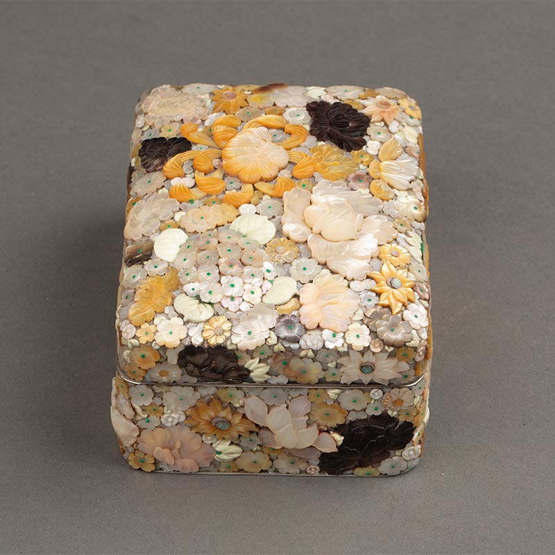 19世纪末20世纪初日本明治时期出品梨地莳绘装饰千花纹样款芝山镶嵌珍宝盒