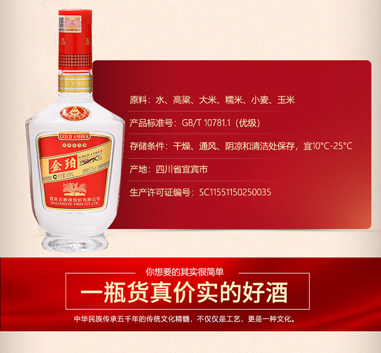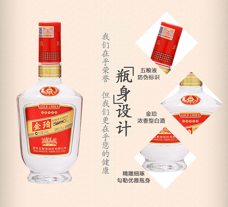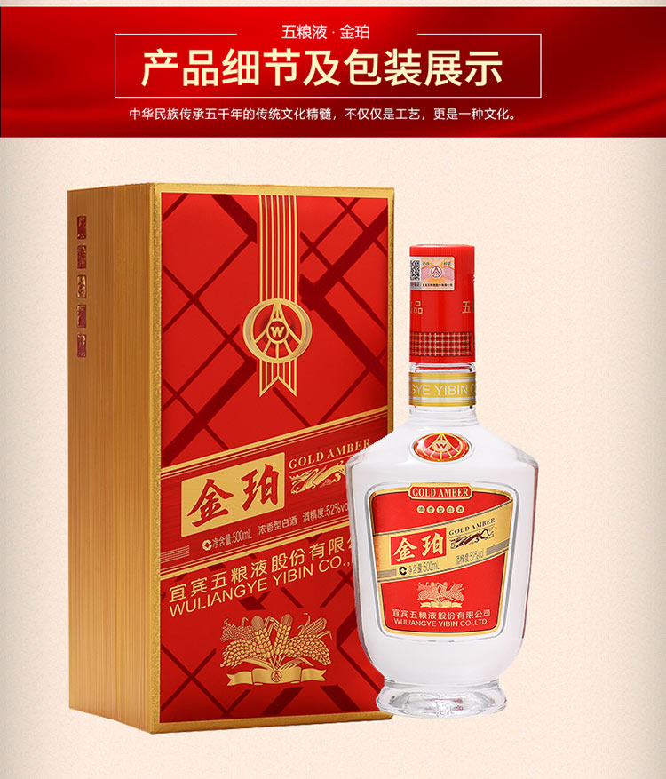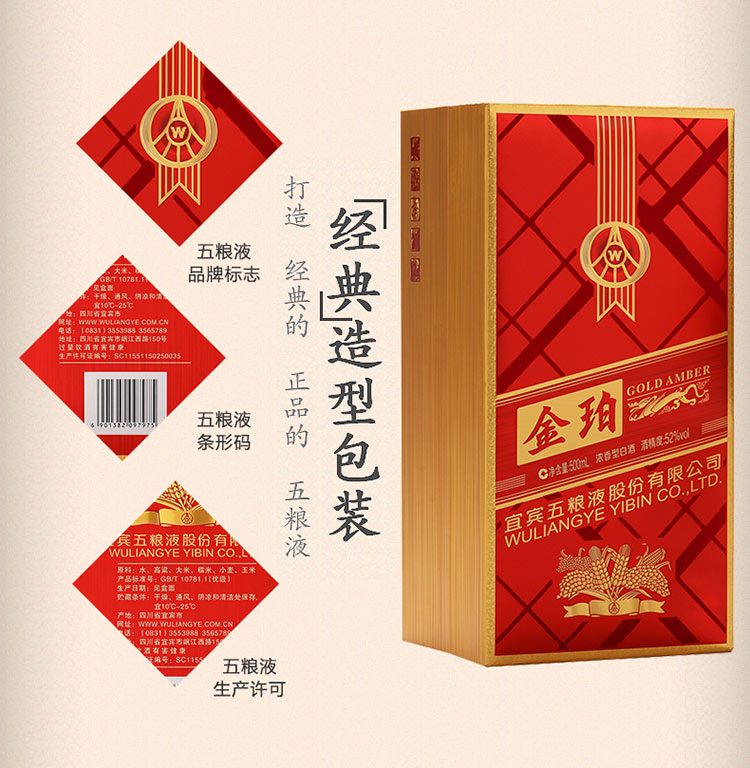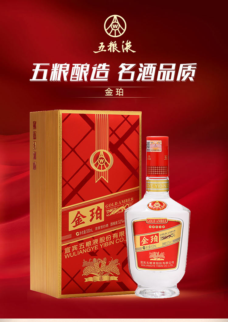 五粮液股份公司出品 金珀 浓香型白酒 52度 500ml*6瓶整箱装 手工盒
