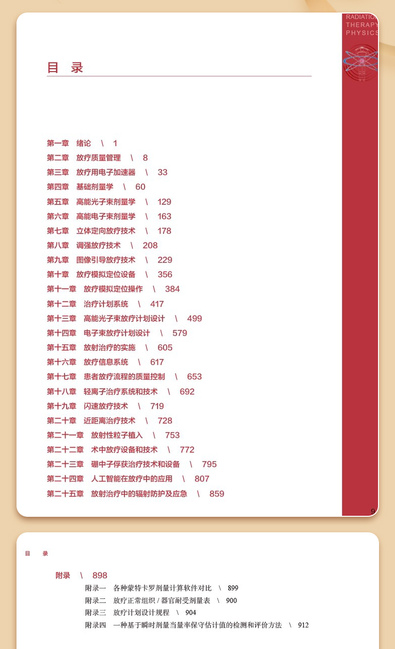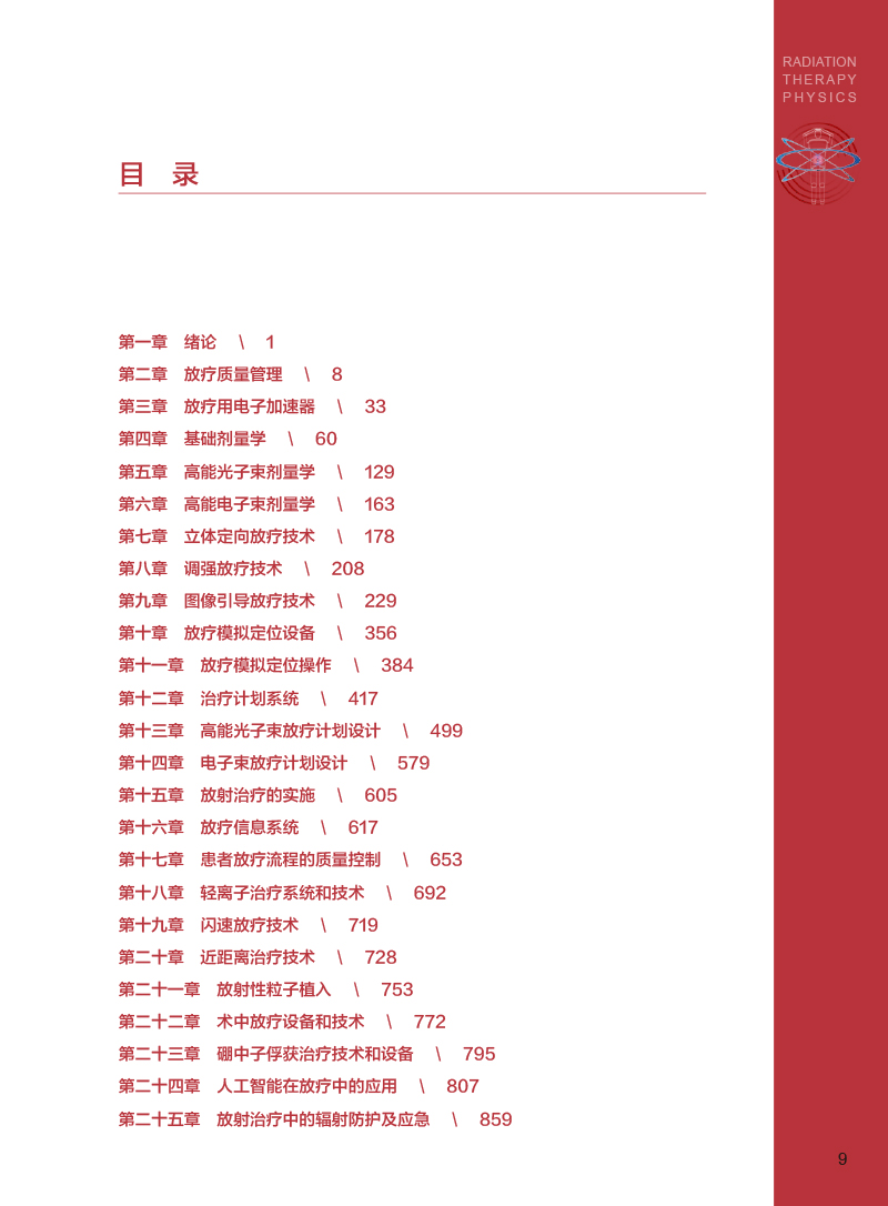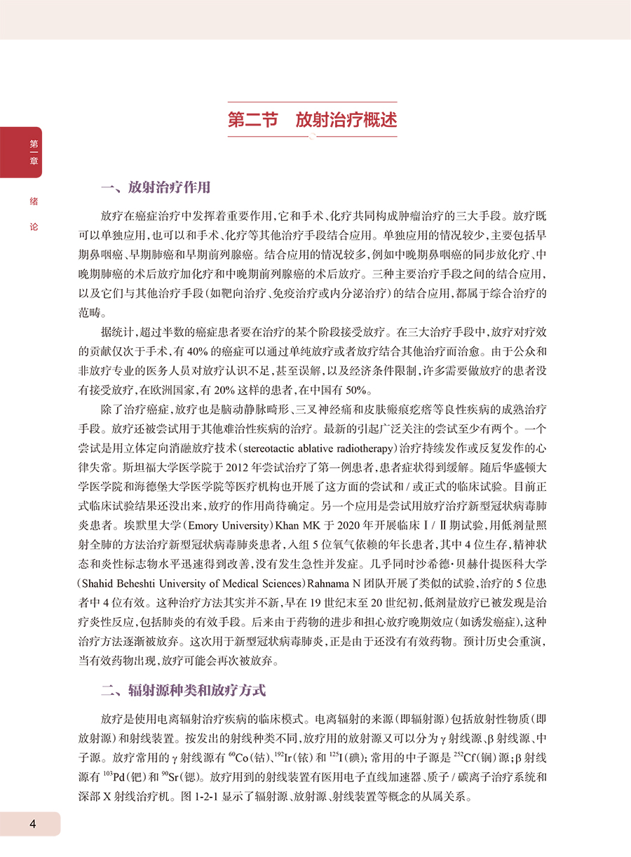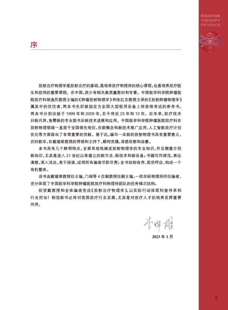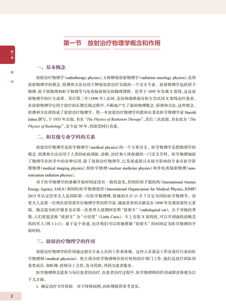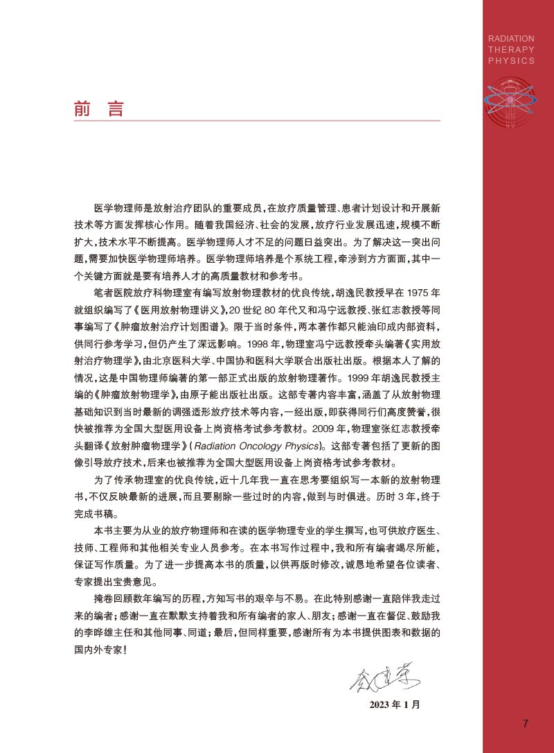 笔者医院放疗科物理室有编写放射物理教材的优良传统,胡逸民教授早在1975年就组织编写了《医用放射物理讲义》,20世纪80年代又组织编写了《肿瘤放射治疗计划图谱》。限于当时条件,两本著作都只能油印成内部资料,供同行参考学习,但仍产生了深远影响。1998年,物理室冯宁远教授牵头编著《实用放射治疗物理学》,由北京医科大学、中国协和医科大学联合出版社出版。根据本人了解的情况,这是中国物理师编著的第一部正式出版的放射物理著作。1999年胡逸民教授主编的《肿瘤放射物理学》,由原子能出版社出版。这部专著内容丰富,涵盖了从放射物理基础知识到当时最新的调强适形放疗技术等内容,一经出版,即获得同行们高度赞誉,很快被推荐为全国大型医用设备上岗资格考试参考教材。2009年,物理室张红志教授牵头翻译《放射肿瘤物理学》(Radiation Oncology Physics)。这部专著包括了更新的图像引导放疗技术,后来也被推荐为全国大型医用设备上岗资格考试参考教材。本书主要为从业的放疗物理师和在读的医学物理专业的学生撰写,也可供放疗医生、技师、工程师和其他相关专业人员参考。