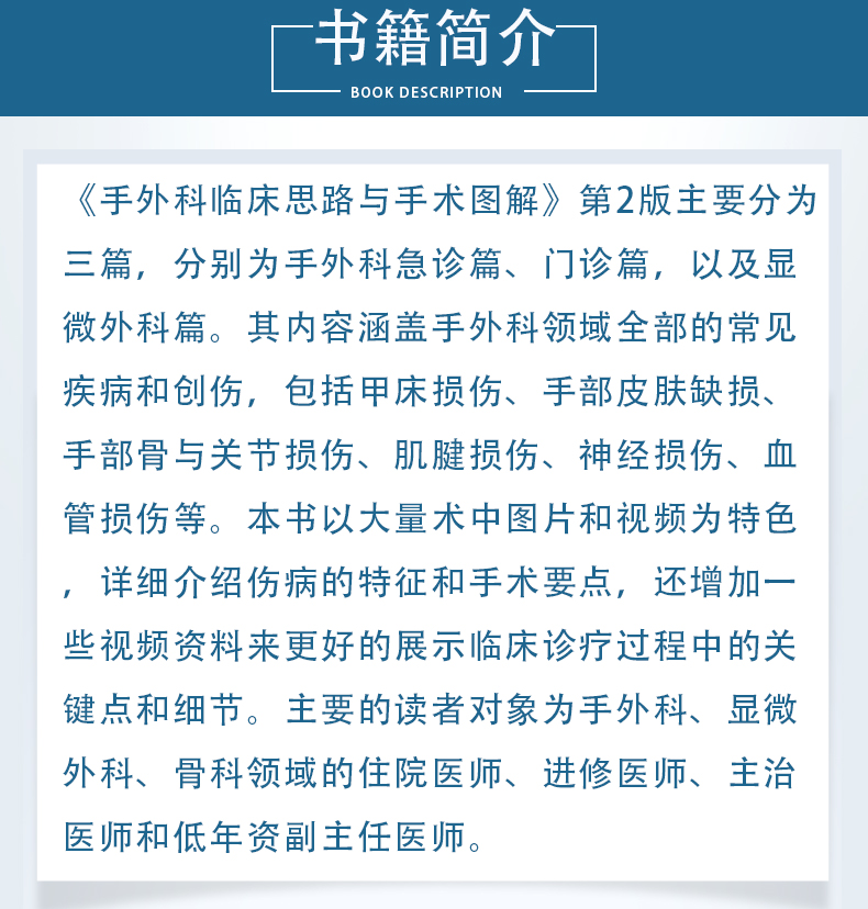 《手外科临床思路与手术图解》第2版主要分为三篇,分别为手外科急诊篇、门诊篇,以及显微外科篇。其内容涵盖手外科领域全部的常见疾病和创伤,包括甲床损伤、手部皮肤缺损、手部骨与关节损伤、肌腱损伤、神经损伤、血管损伤等。本书以大量术中图片和视频为特色,详细介绍伤病的特征和手术要点,还增加一些视频资料来更好的展示临床诊疗过程中的关键点和细节。主要的读者对象为手外科、显微外科、骨科领域的住院医师、进修医师、主治医师和低年资副主任医师。