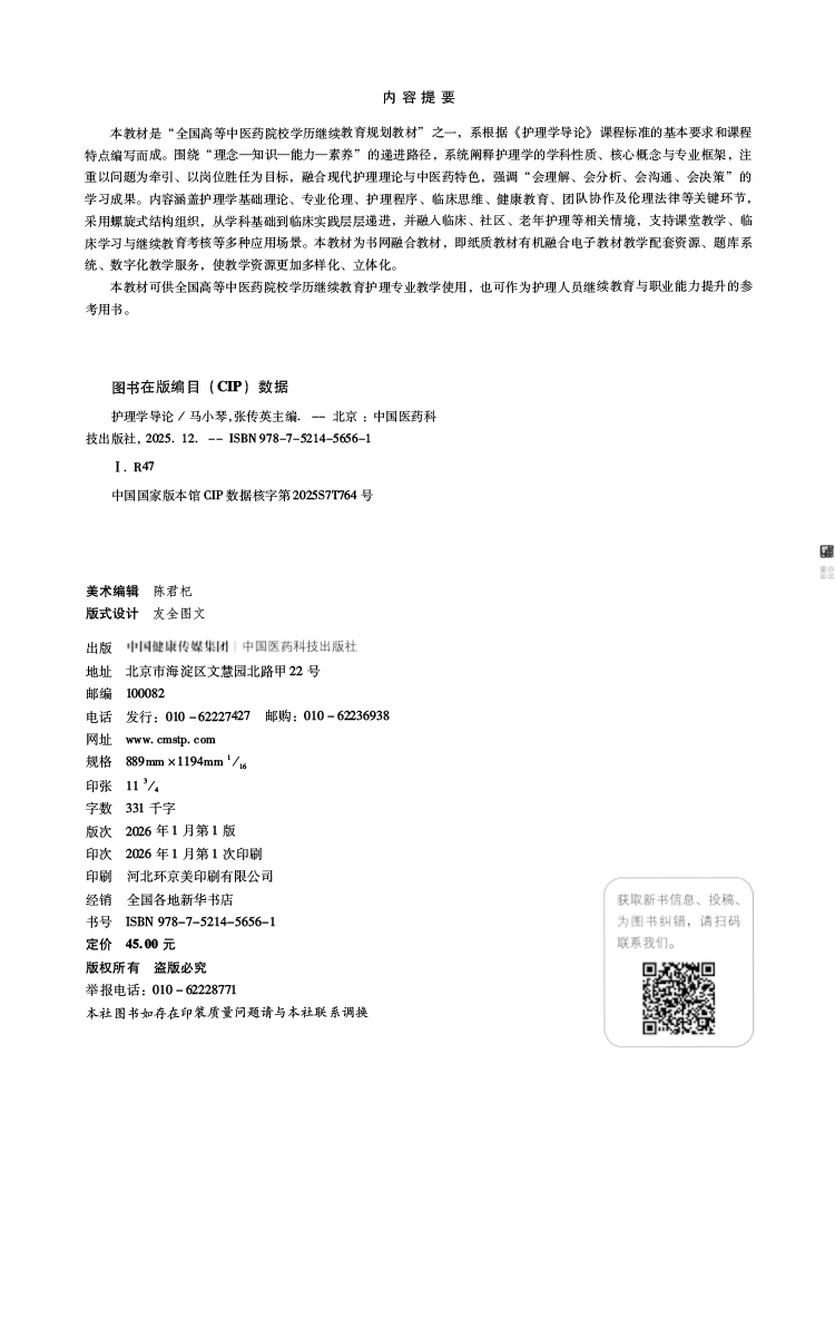 护理学导论 马小琴 张传英 主编 全国高等中医药院校学历继续教育规划教材 供护理学专业用 9787521456561 中国医药科技出版社