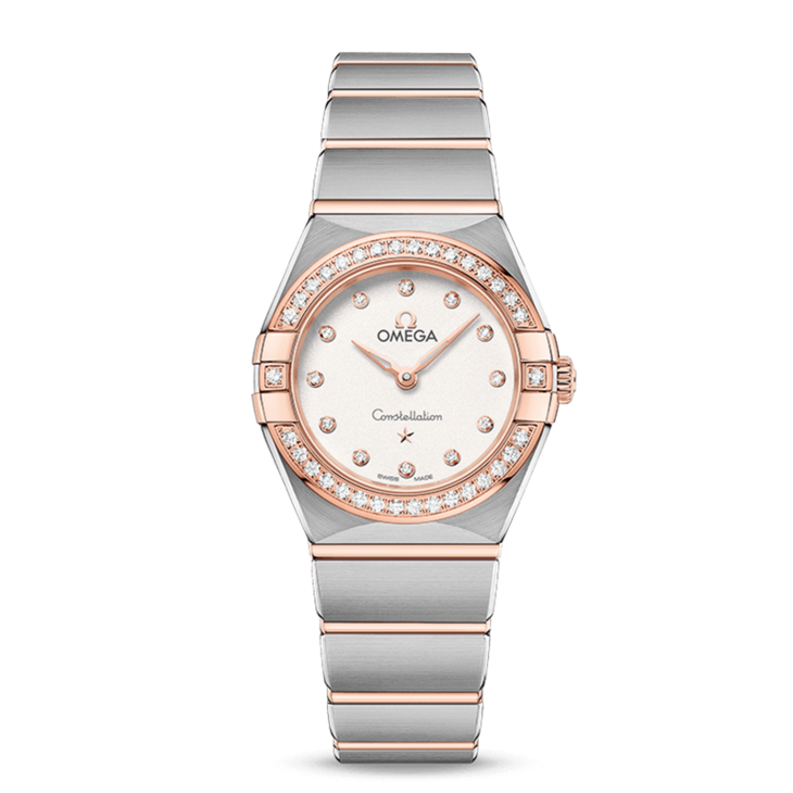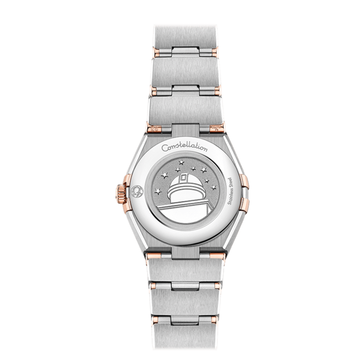 镜面材质 | 蓝宝石水晶玻璃 | 表盘 | 经典的半月形切面、“托爪”以及mono-rang表链。 Sedna® 18K金与精钢打造,表圈铺镶钻石,冰霜银表盘晶莹洁白,饰有钻石小时刻度,覆以耐磨损蓝宝石玻璃表镜。指针、欧米茄品牌标识、星座徽标以及钻石托槽亦以Sedna® 18K金打造而成。 密底,表背印有星座天文台徽章。 |
