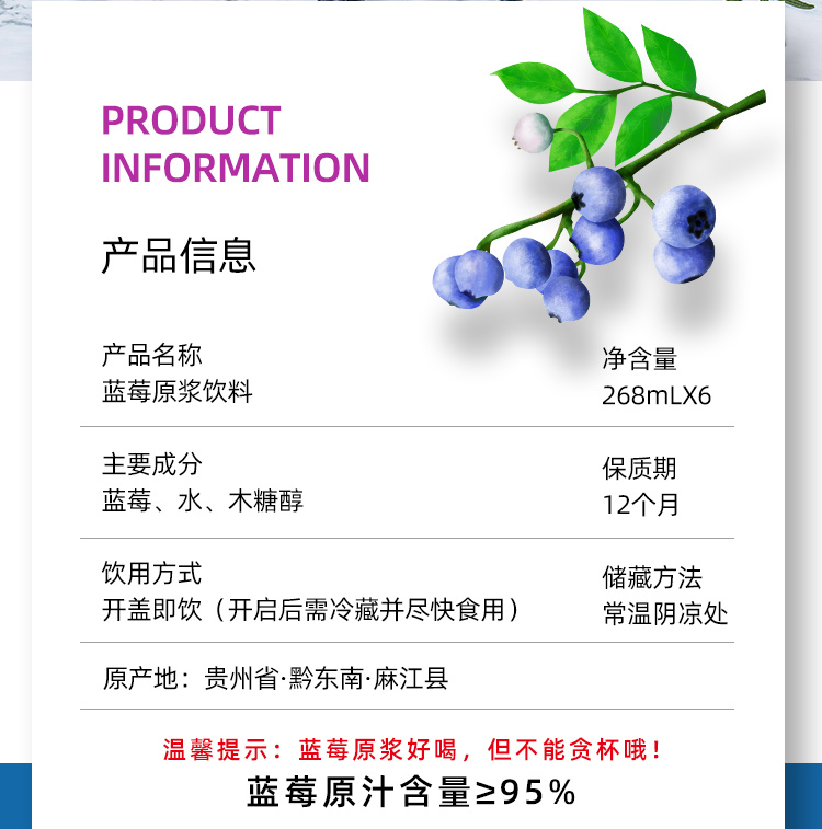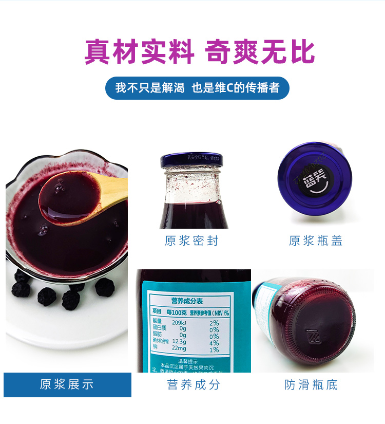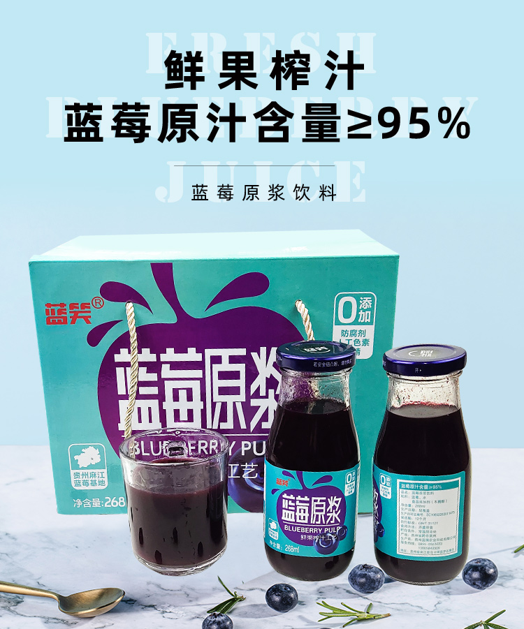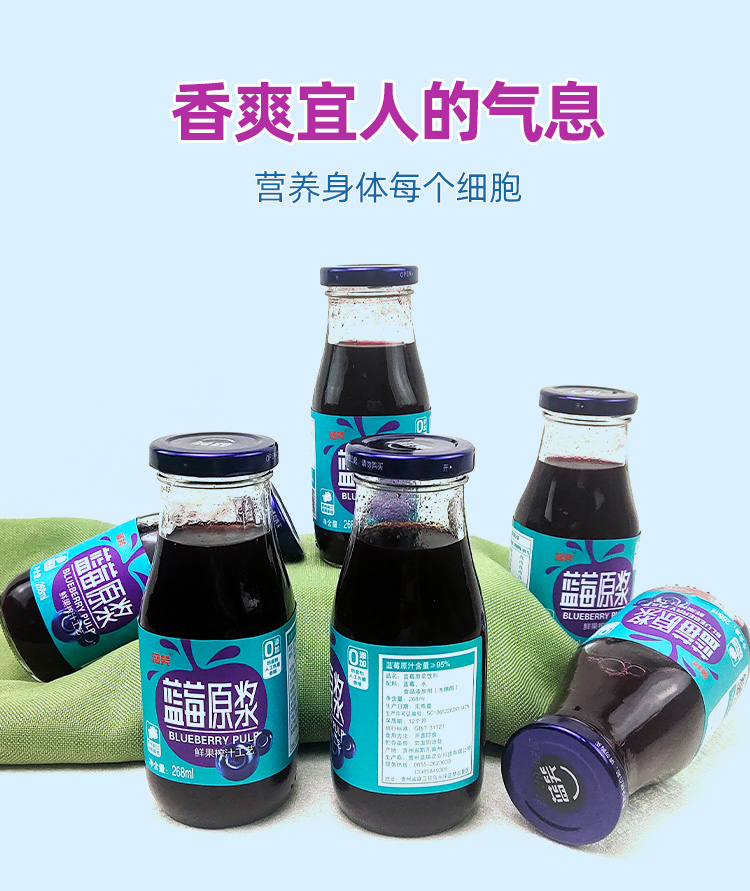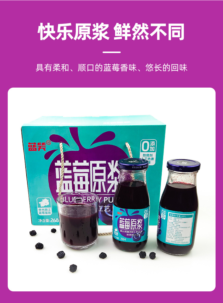 品名:蓝莓原浆规格:268ml/瓶发货地/产地:贵州/贵州保质期: 12个月,建议收到后尽快食用。包装方式:瓶装物流信息:四通一达或其它快递随机发货,不接受指定快递。不发货区域:新疆、西藏、青海、港澳台、疫情管控区。 |