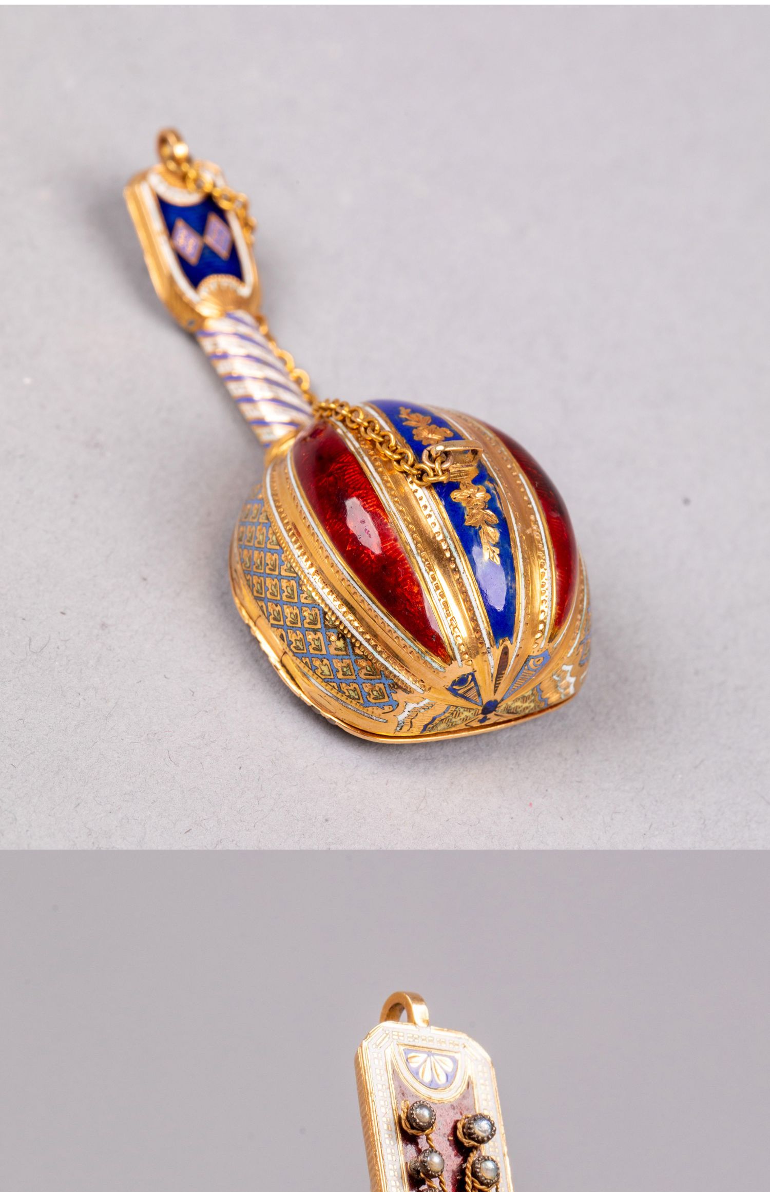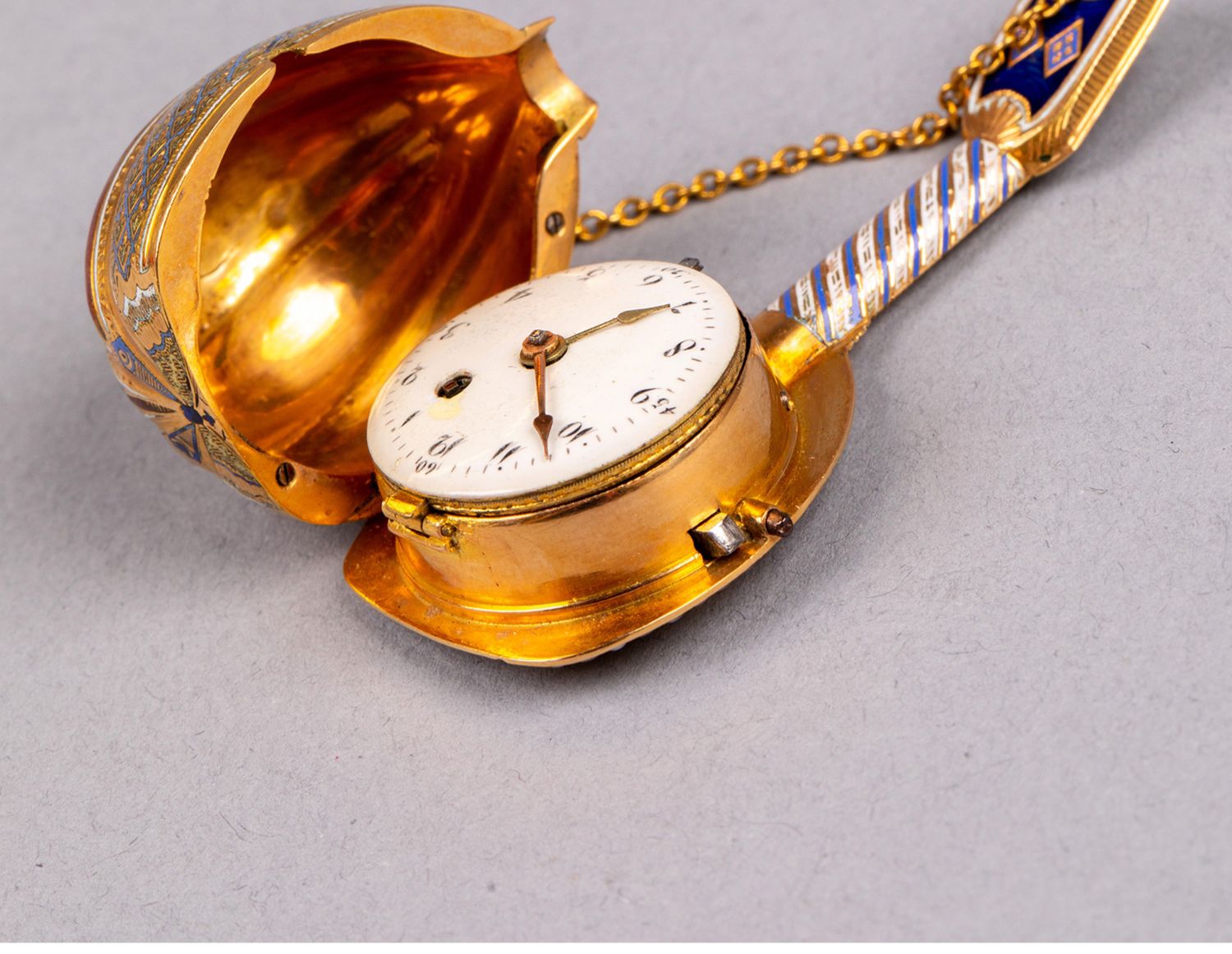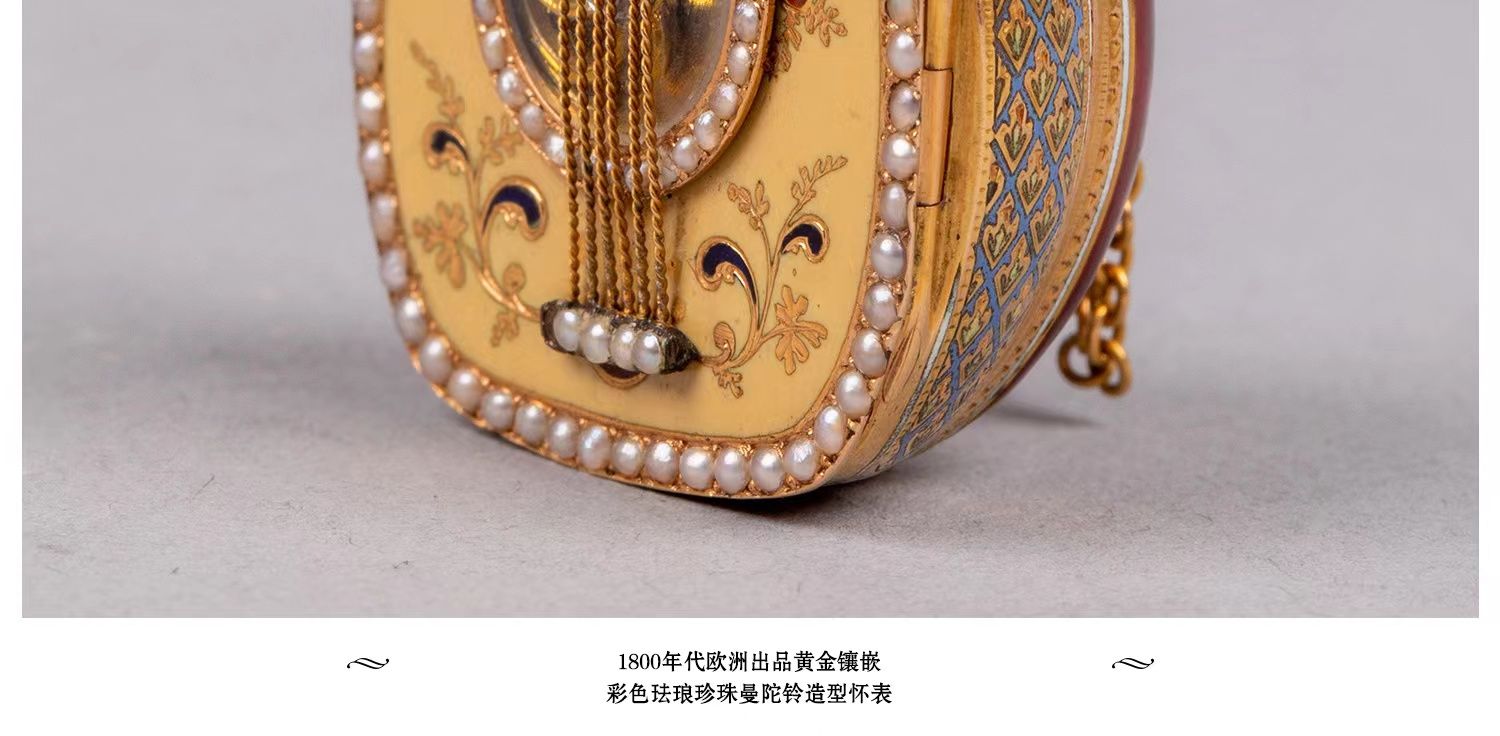 独角鹿西洋古董欧洲黄金镶嵌彩色珐琅珍珠曼陀铃造型怀表