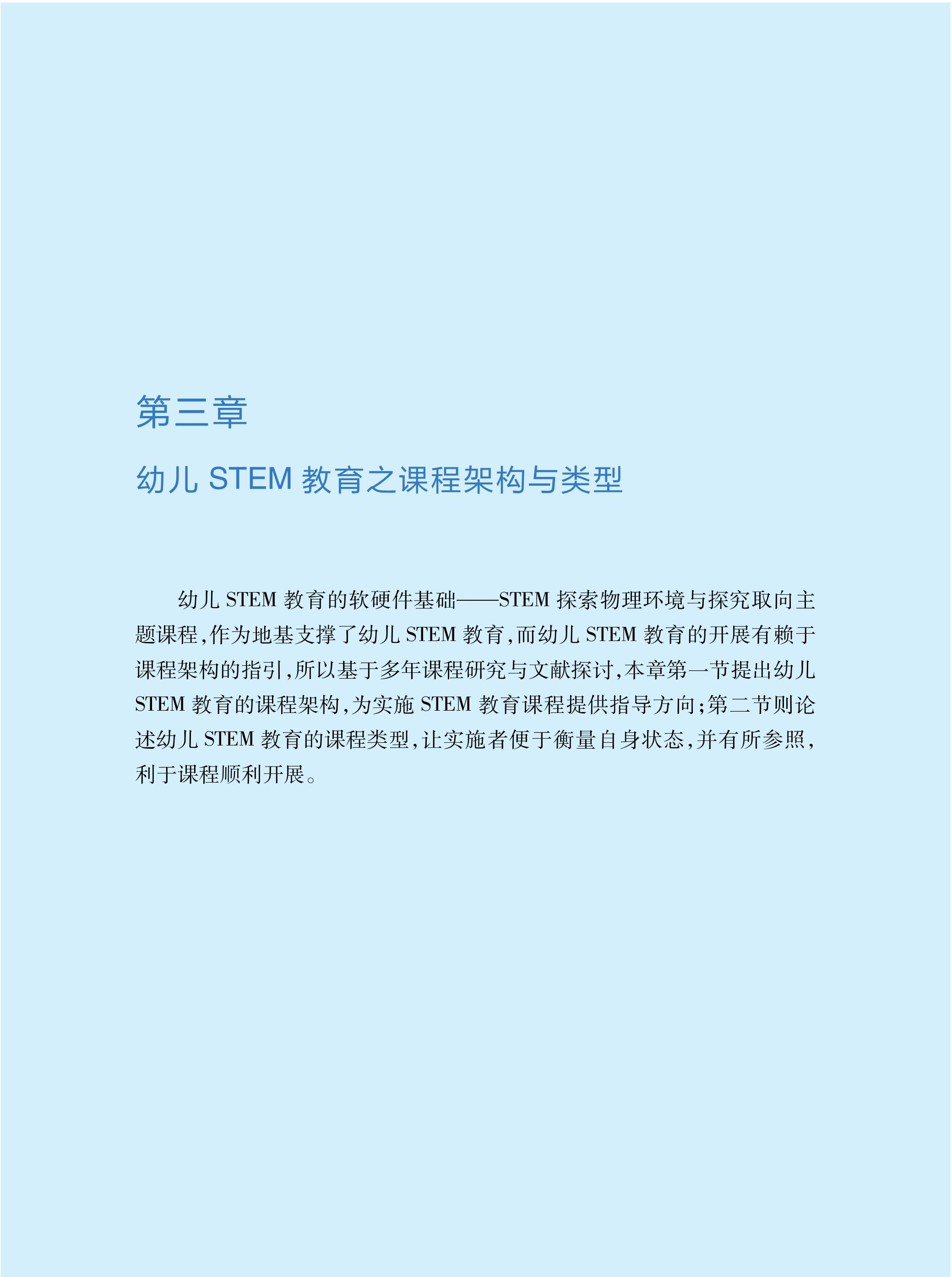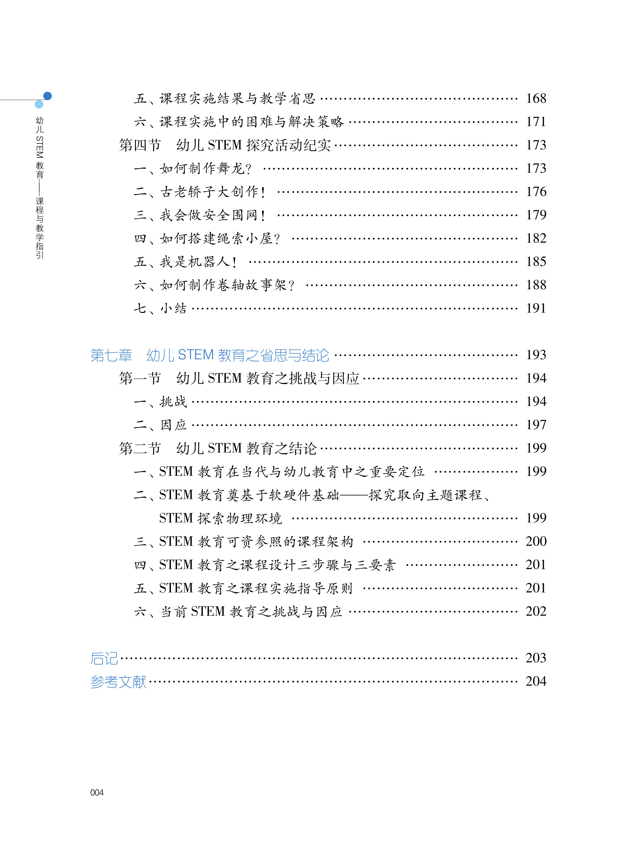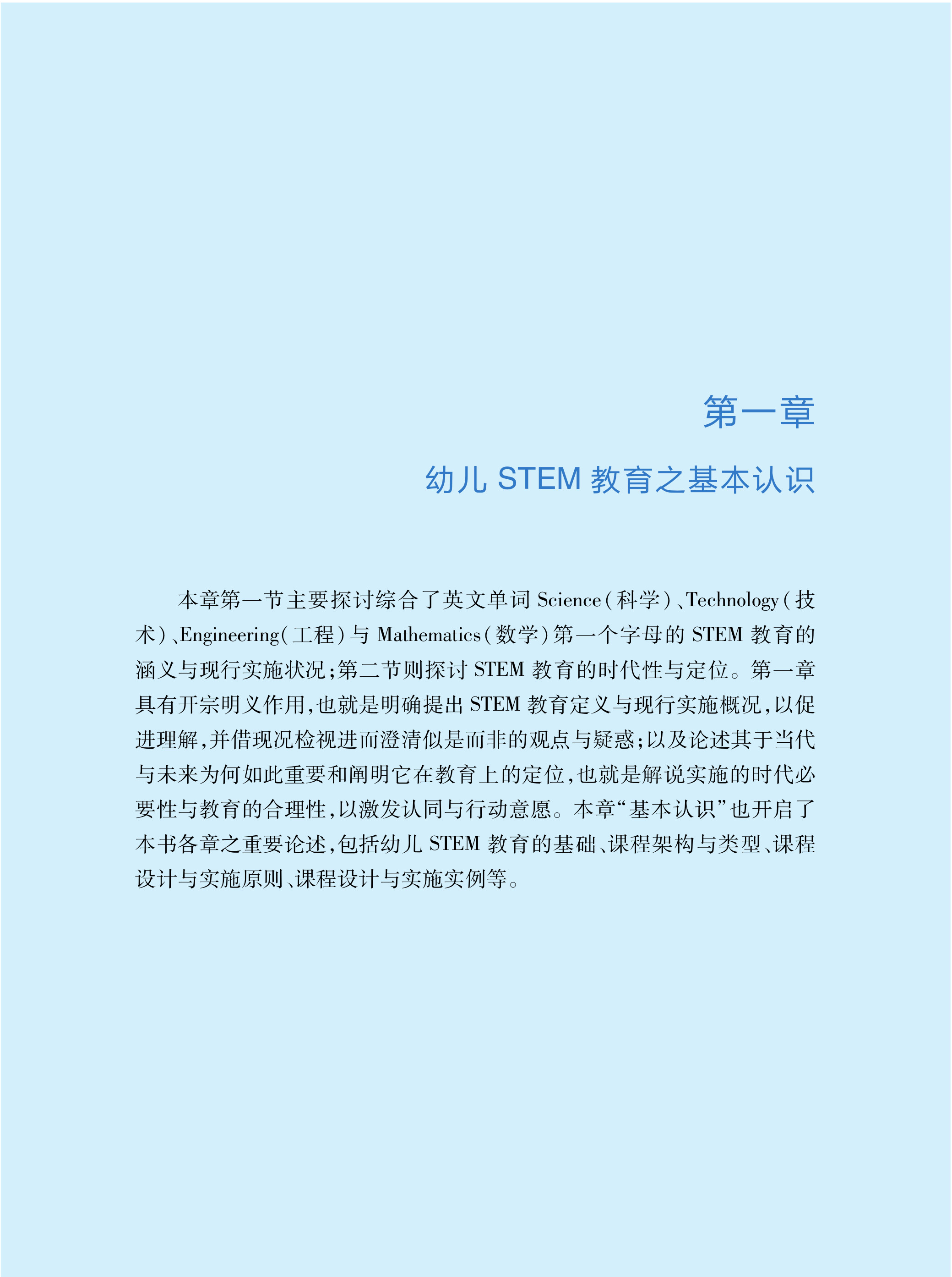 《幼儿STEM教育:课程与教学指引》全书共分为七章。第一章为幼儿STEM教育之基本认识,说明STEM教育是什么与为什么;第二章强调幼儿STEM教育的软件与硬件基础,为幼儿STEM教育之开展而奠基;第三章是综合文献与专业经验,提出幼儿STEM教育的课程架构;第四章阐述课程应如何设计,包含设计三步骤与三要素,并且从教师、幼儿与教学互动三个方面说明课程应如何实施;第五章承续第四章提出课程设计示例,包含以绘本情境设计STEM探究活动的例子;第六章佐以鲜活的课程实例,包含第一节到第三节的三个STEM探究主题(以主题脉络统整所有探究活动)与第四节的六个STEM探究活动(个别性的STEM活动);最后一章则是对幼儿STEM教育的反思,包含挑战与应对策略,并对全书做出结论。