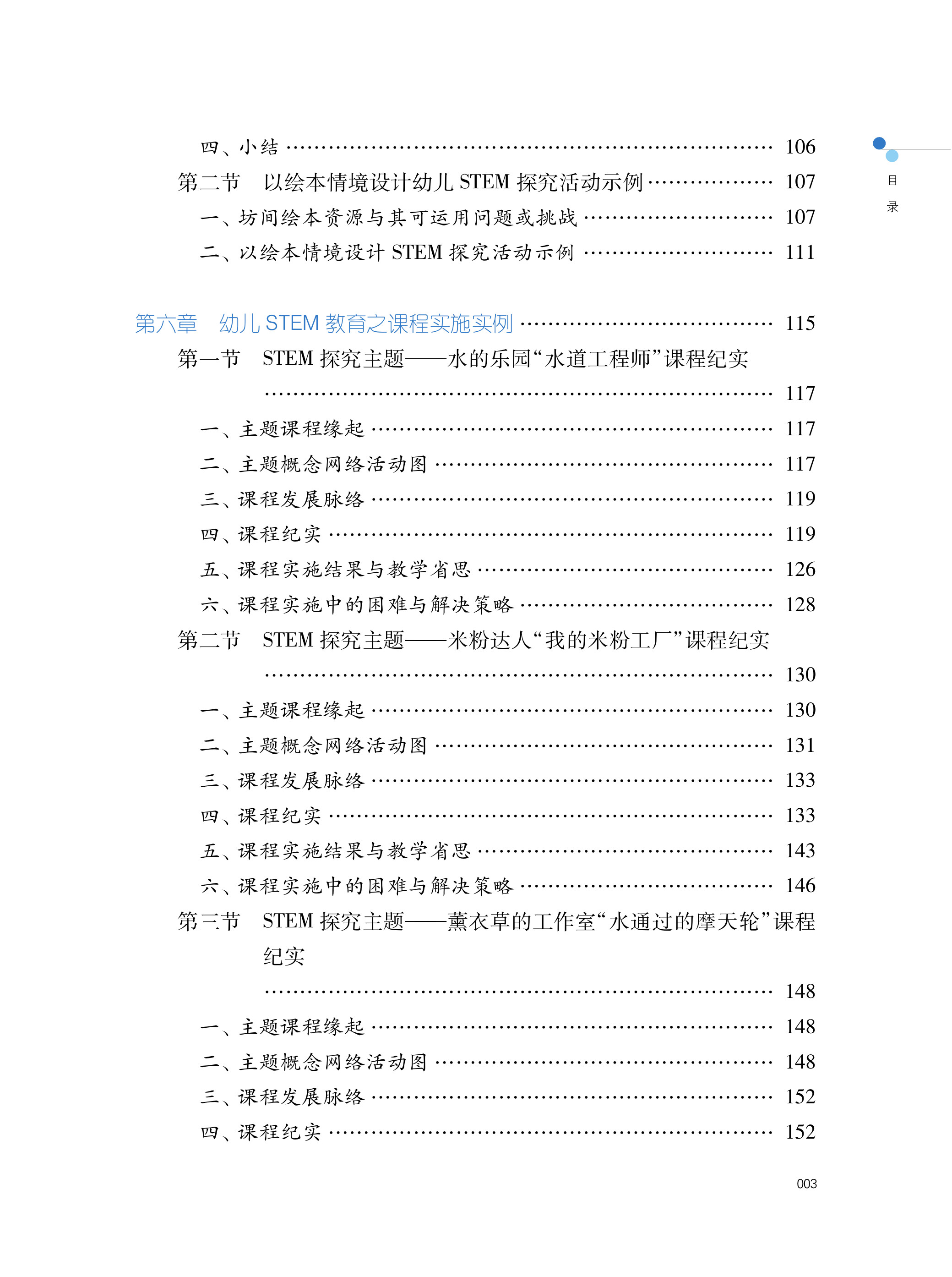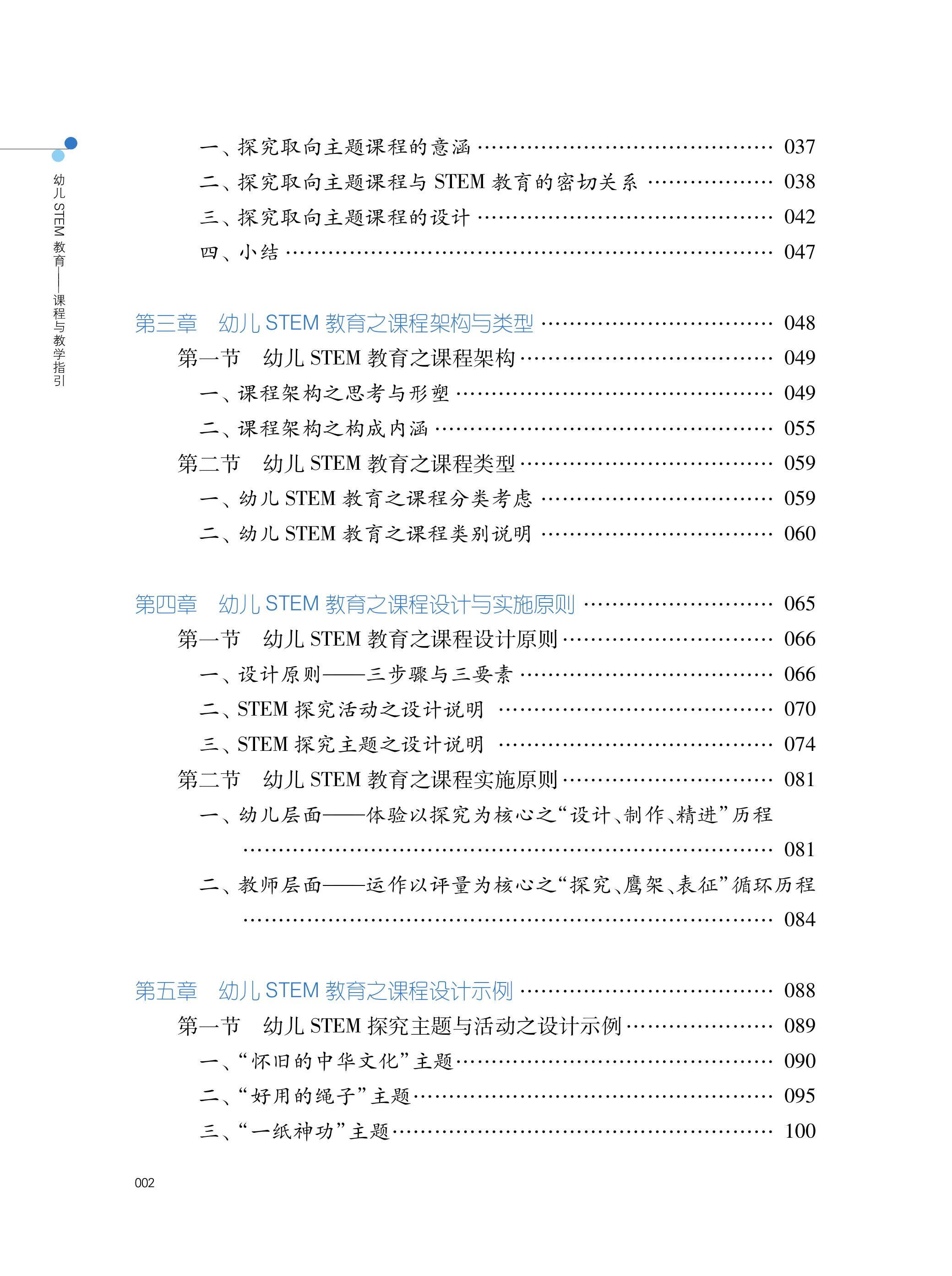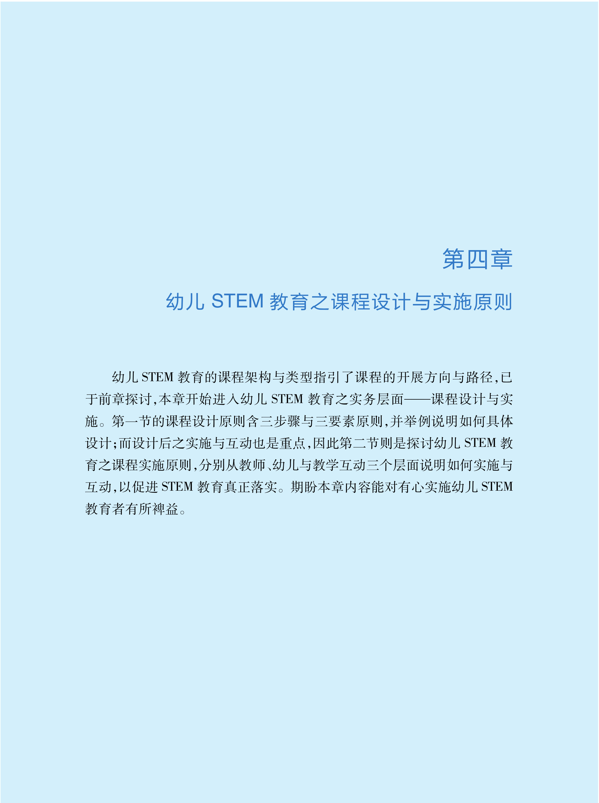 《幼儿STEM教育:课程与教学指引》全书共分为七章。第一章为幼儿STEM教育之基本认识,说明STEM教育是什么与为什么;第二章强调幼儿STEM教育的软件与硬件基础,为幼儿STEM教育之开展而奠基;第三章是综合文献与专业经验,提出幼儿STEM教育的课程架构;第四章阐述课程应如何设计,包含设计三步骤与三要素,并且从教师、幼儿与教学互动三个方面说明课程应如何实施;第五章承续第四章提出课程设计示例,包含以绘本情境设计STEM探究活动的例子;第六章佐以鲜活的课程实例,包含第一节到第三节的三个STEM探究主题(以主题脉络统整所有探究活动)与第四节的六个STEM探究活动(个别性的STEM活动);最后一章则是对幼儿STEM教育的反思,包含挑战与应对策略,并对全书做出结论。