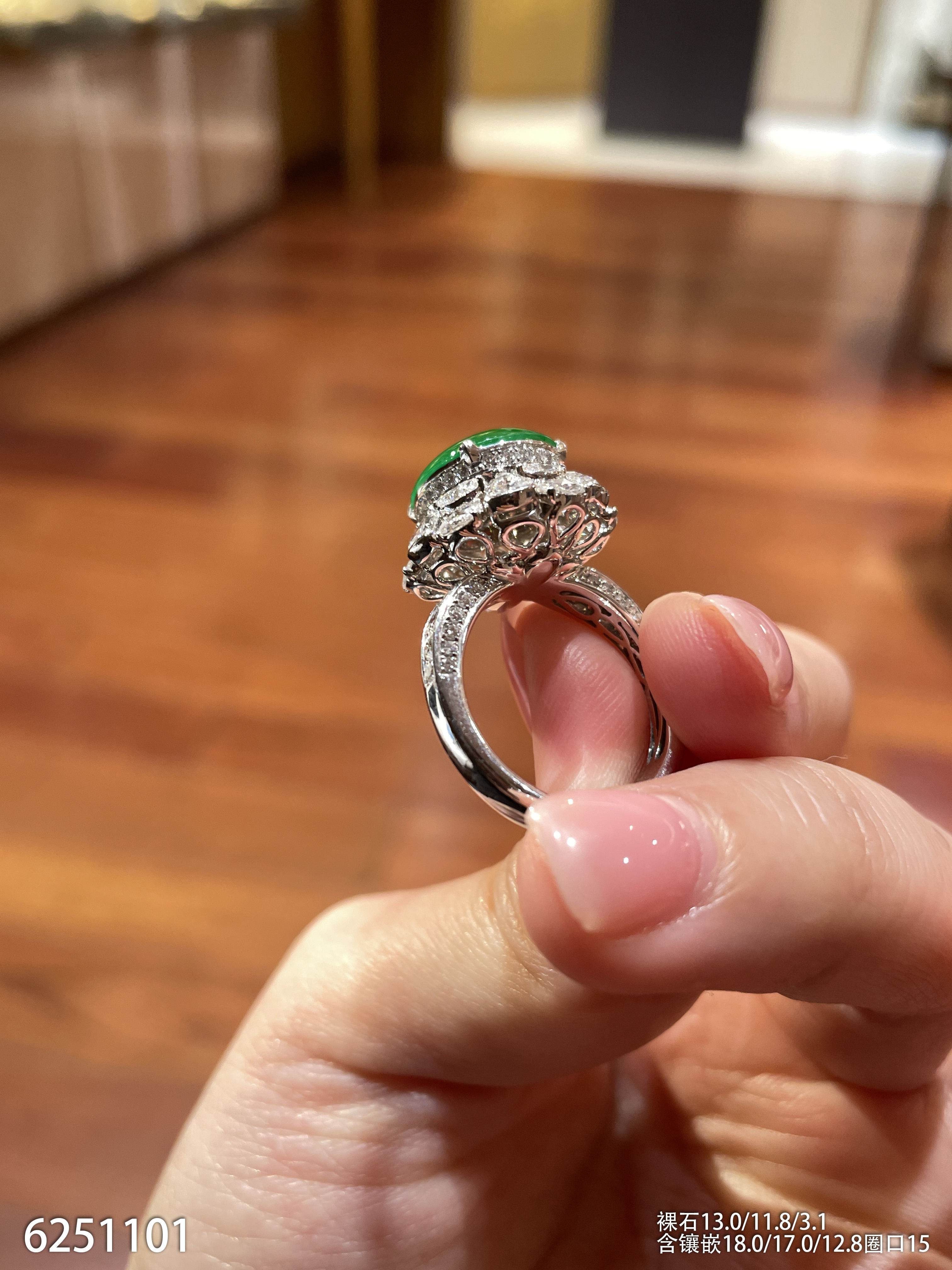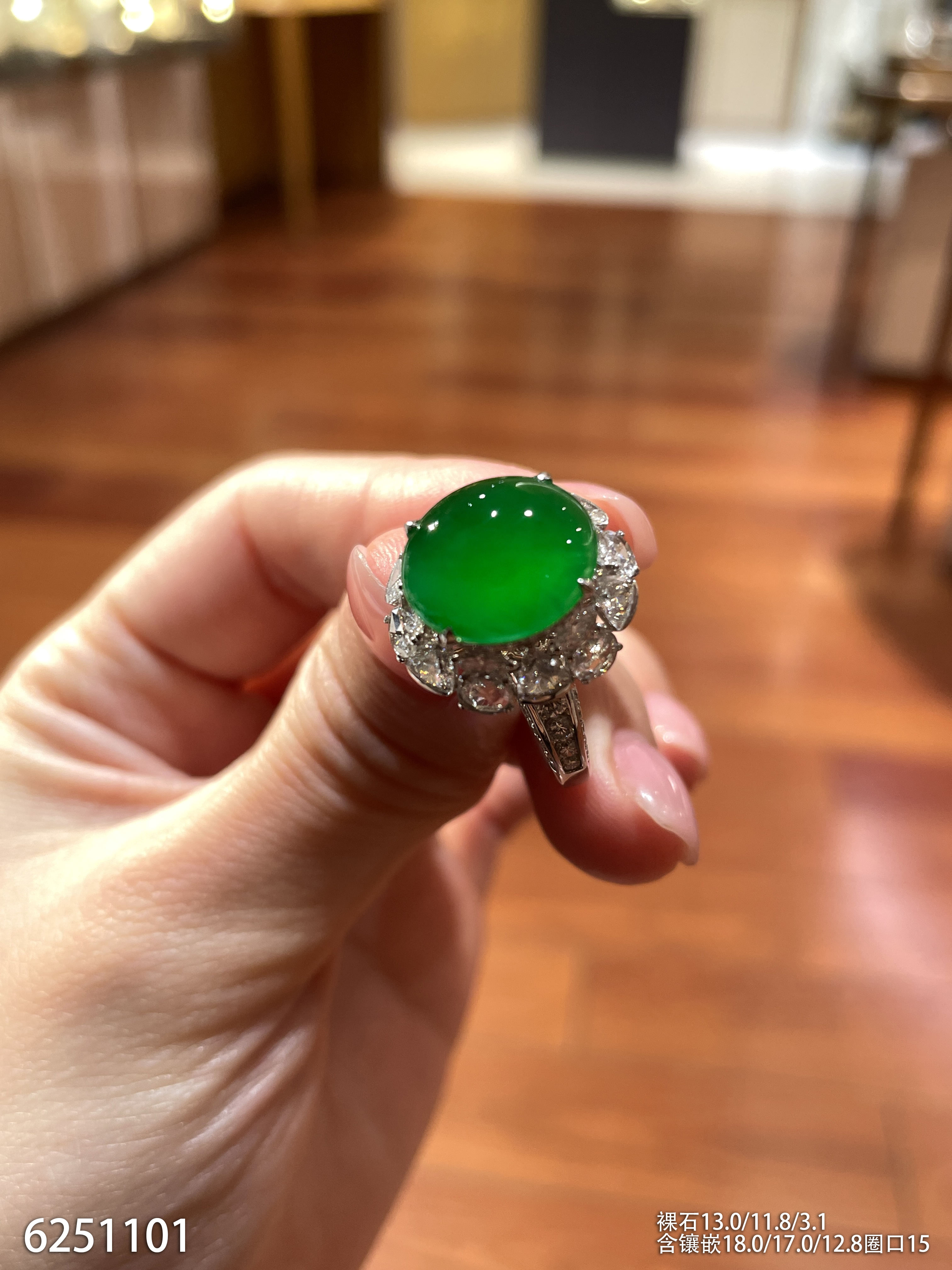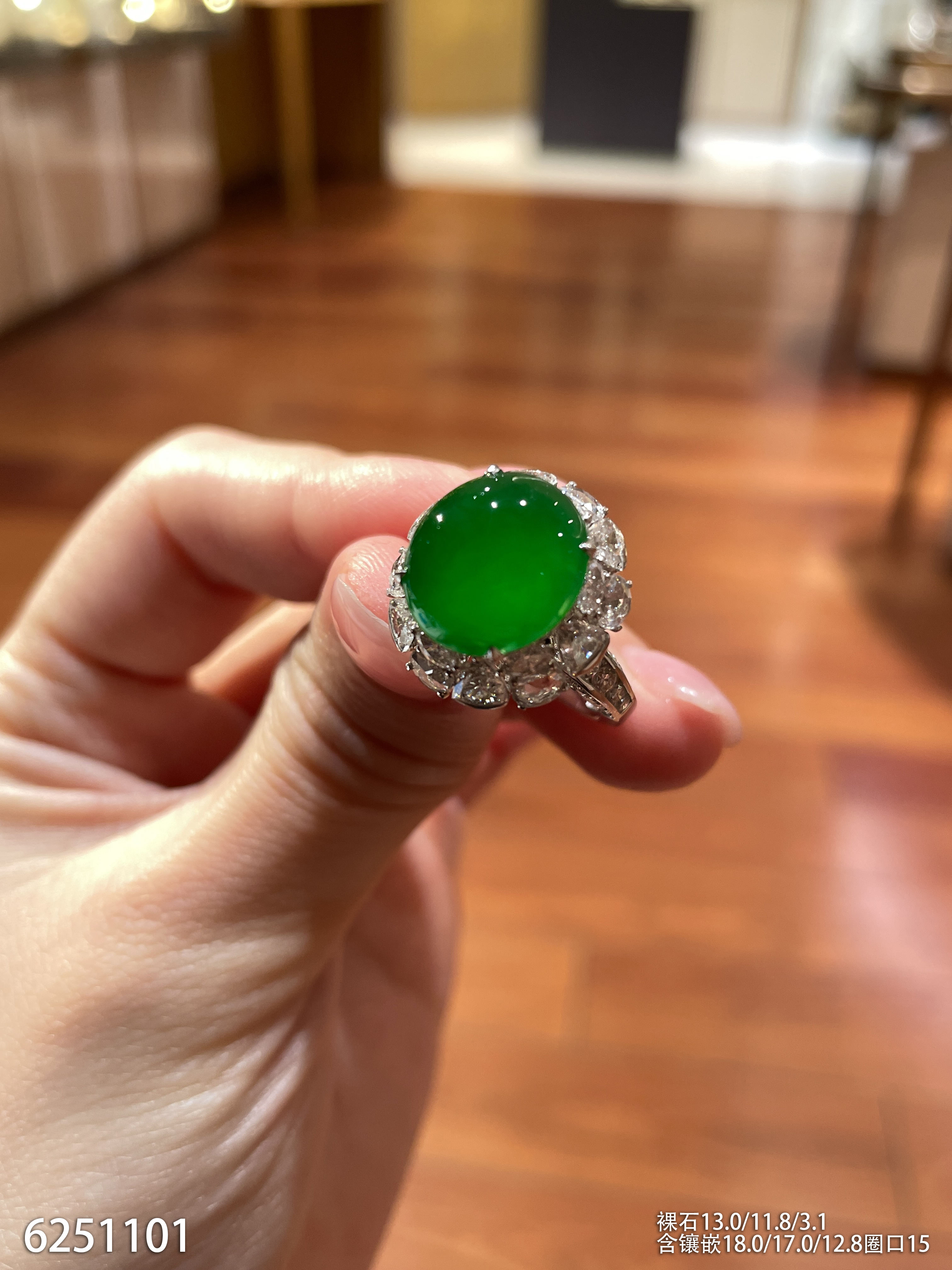 玻璃种艳绿蛋面戒指【6251101】具体价格微信咨询