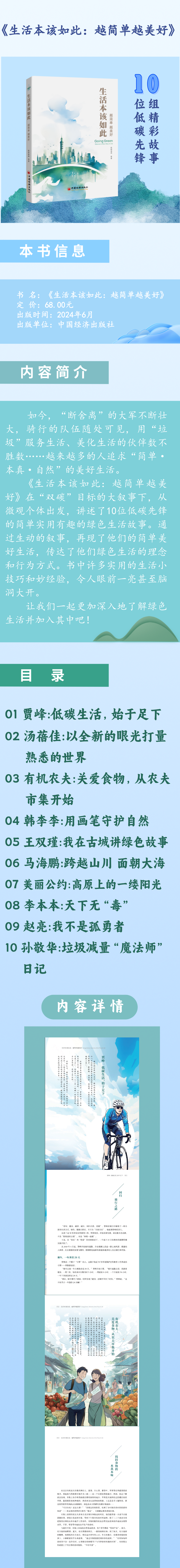 在全球气候治理进程中,中国逐渐走向世界舞台的中央。自2020年中国提出“双碳”目标后,中国掀起了“全民讲碳”的热潮,然而落实到行动,尤其是落实到每个人的日常生活,政府和民间*还需要在提升民众意识方面开展更多扎实的工作。其中,讲好低碳人物故事,*将对提升公众意识、带动公众行动、促进“双碳”目标实现,发挥重要作用。《生活本该如此:越简单越美好》这本书通过10个低碳先锋人物故事,讲述他们低碳生活的理念和行动,以理性的方式来传达一种大众可及的生活方式。用故事打动人,用故事感染人,用故事影响人,用故事带动人,并以此带动社区和社会的关注和参与。