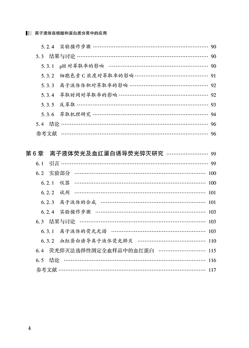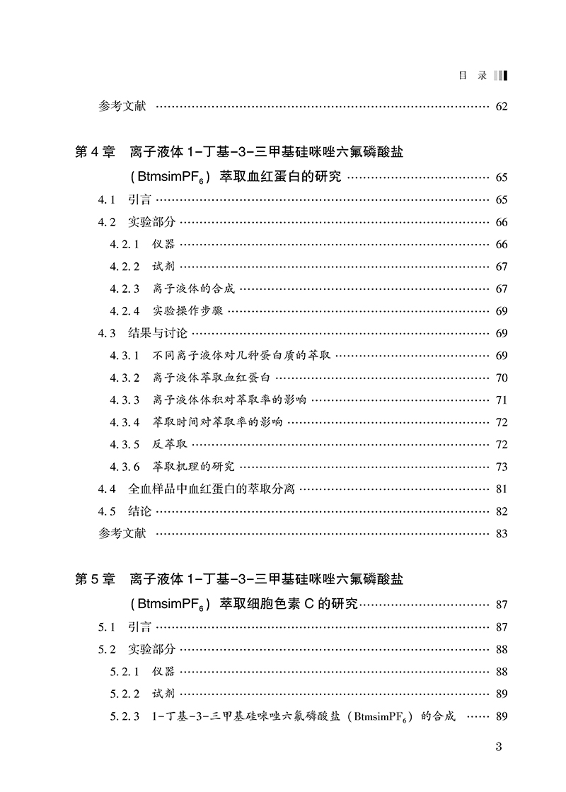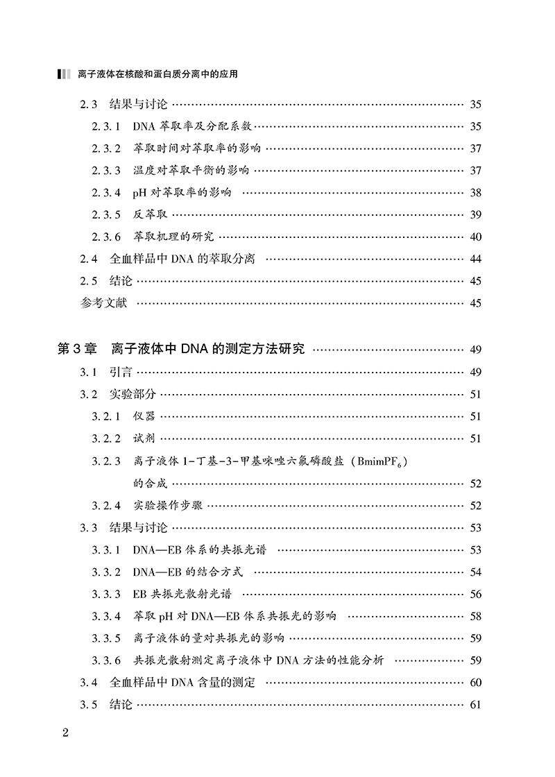 《离子液体在核酸和蛋白质分离中的应用》概述了离子液体的研究现状及未来发展趋势,系统介绍了离子液体作为绿色溶剂在生物分子萃取分离、分析检测中的应用。详细论述了疏水性离子液体1-丁基-3-甲基咪唑六氟磷酸盐(BmimPF6)对DNA的萃取分离富集,建立了直接定量离子液体相中DNA的共振光散射方法,并以不同烷基侧链的咪唑类疏水性离子液体为萃取溶剂研究了对血红蛋白、细胞色素C蛋白质的萃取、分离,研究了不同烷基侧链的咪唑类离子液体的荧光光谱,并将其用于血红蛋白的分析检测。