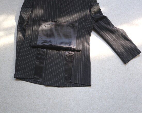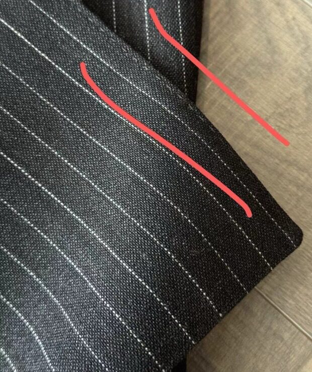 然后 后身拼接中线 居中 但两边幅面上的条纹 是不对称的