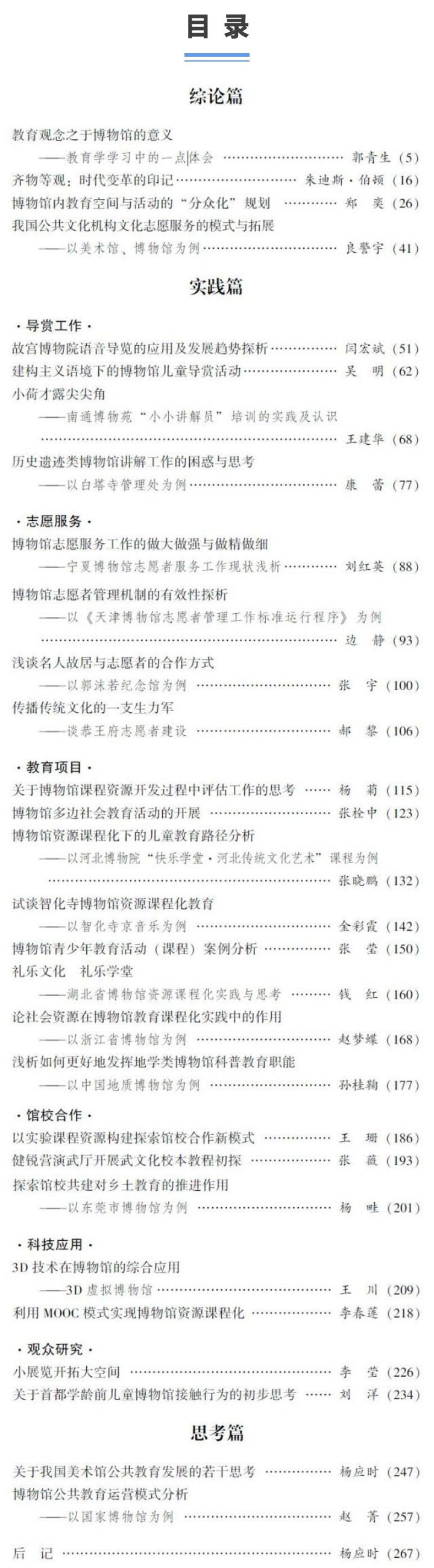 全书共辑录文章29篇,近17万字。在内容安排上,充分考虑博物馆教育工作研究与实践相结合。全书分为综论篇、实践篇和思考篇三大部分。综论篇特邀国内外专家学者对博物馆教育研究理论展开论述;实践篇就教育实践工作进行具体论述,细分为导赏工作、志愿服务、教育项目、馆校合作、科技应用、观众研究六个主题;思考篇则是对我国博物馆教育发展的深思与探究。该书内容丰富,资料翔实,是一本理论与实践、传统与创新相结合的博物馆教育研讨论文集。