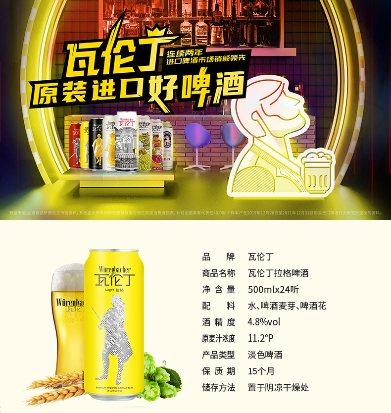 【1件包邮 24瓶整箱装】瓦伦丁拉格500ml*24 劲爽甘冽泡沫细腻 甘肃青海内蒙古新疆西藏宁夏海南港澳台不发货