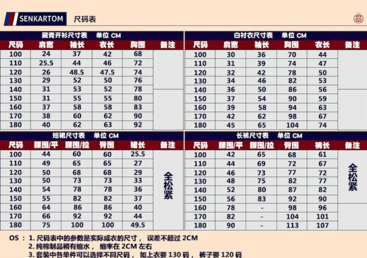 2、上衣含园徽,套装配有领带或领花,无需单独购买,单件不配领带领花;
