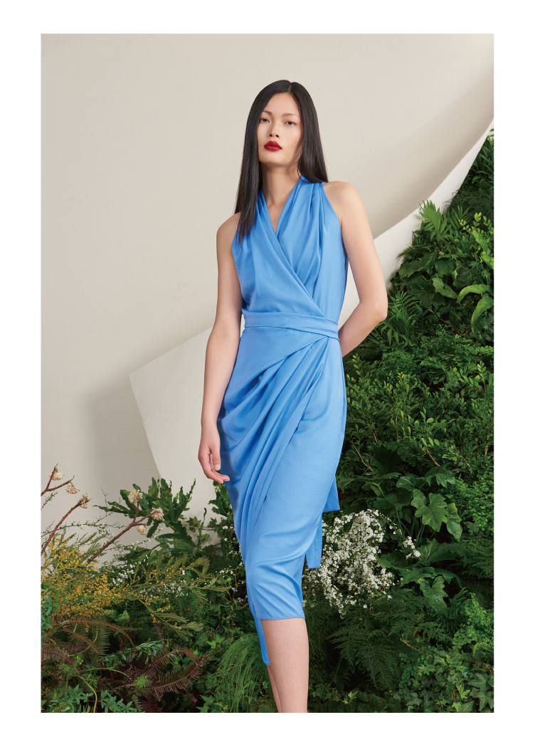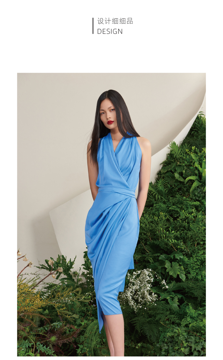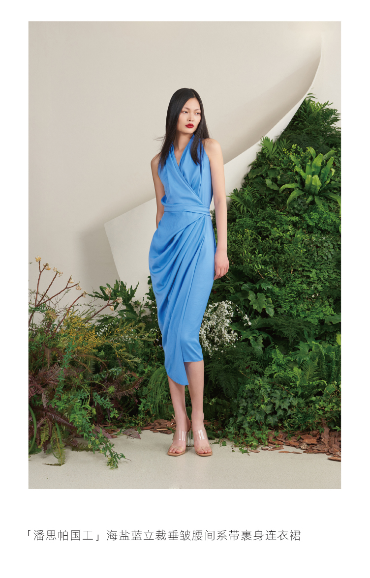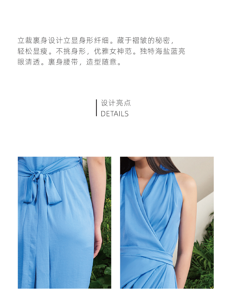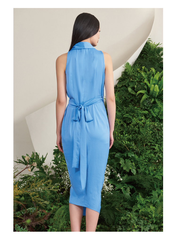 【潘思帕国王】海盐蓝立裁垂皱腰间系带裹身连衣裙/0000703A