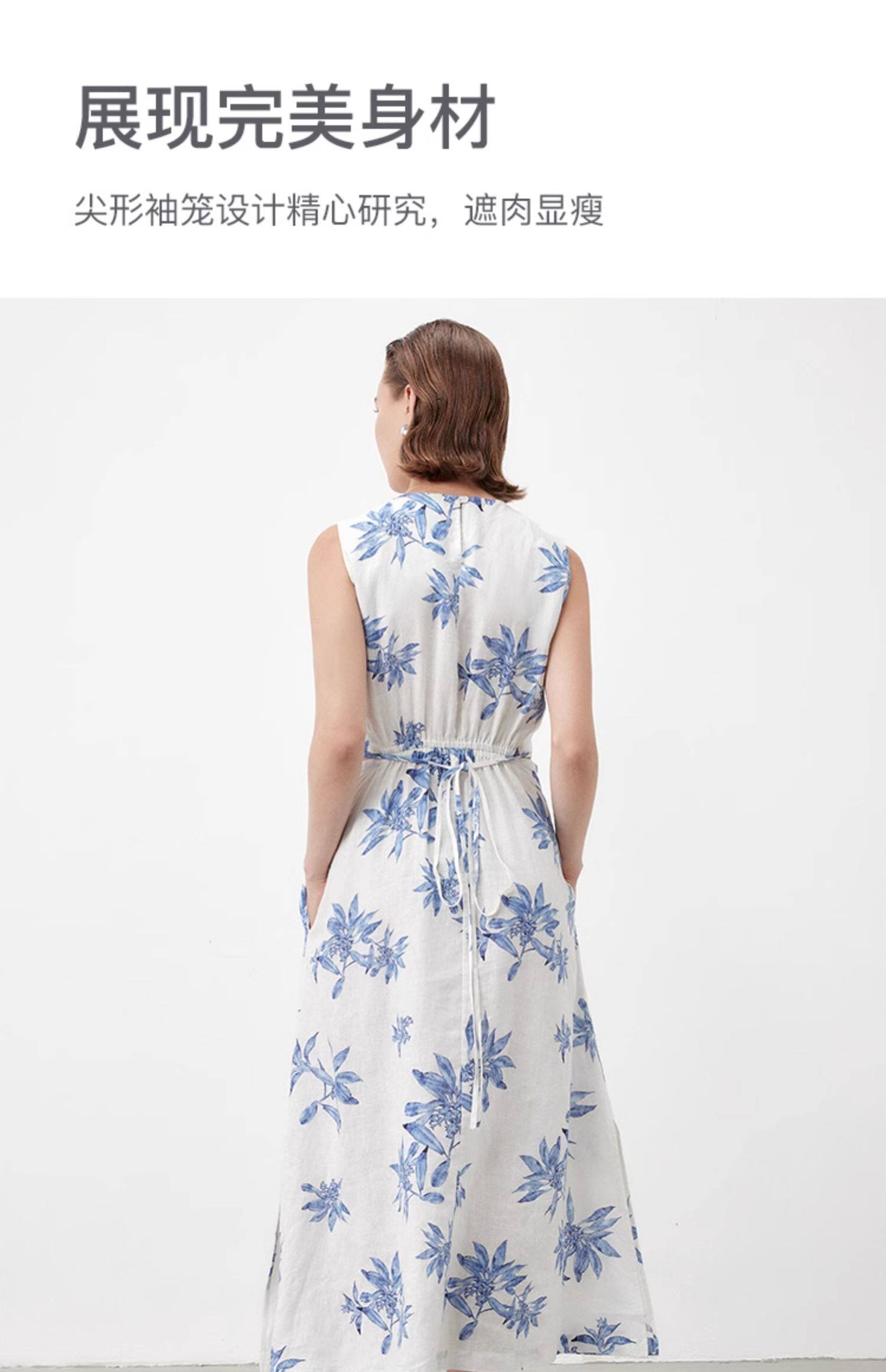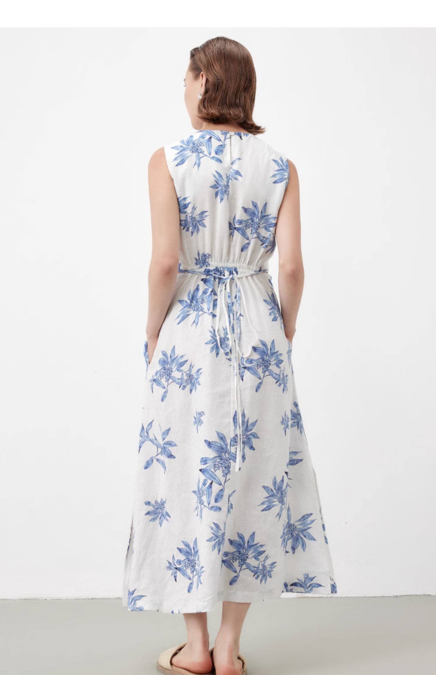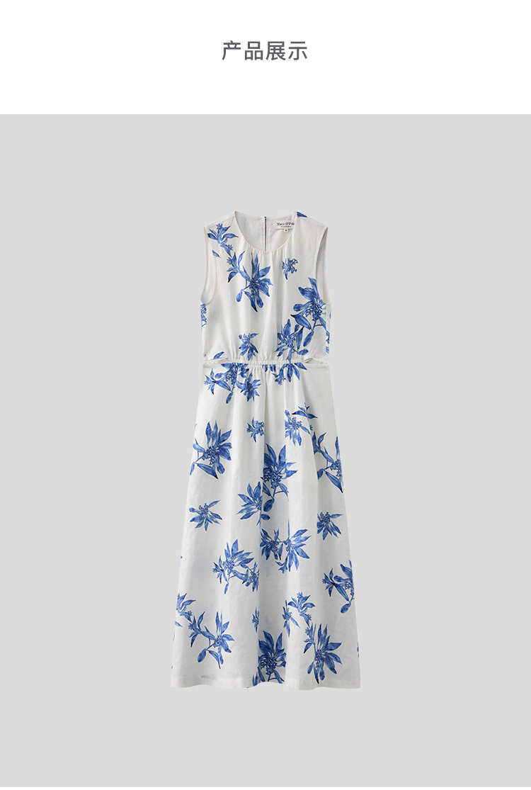 Marc O'Polo/MOP夏季新款好看天然亚麻时尚无袖印花露腰连衣裙女