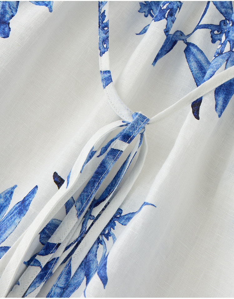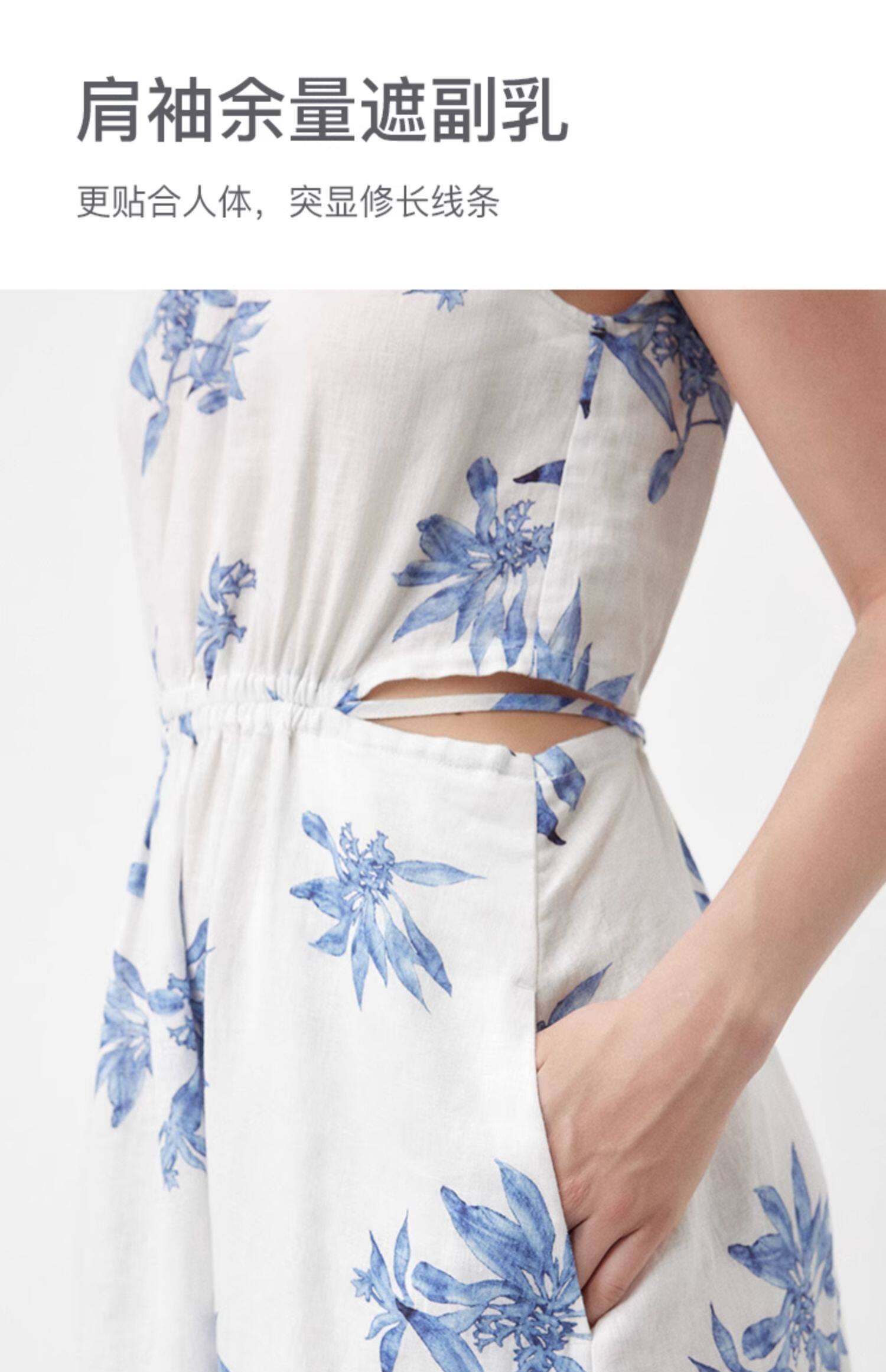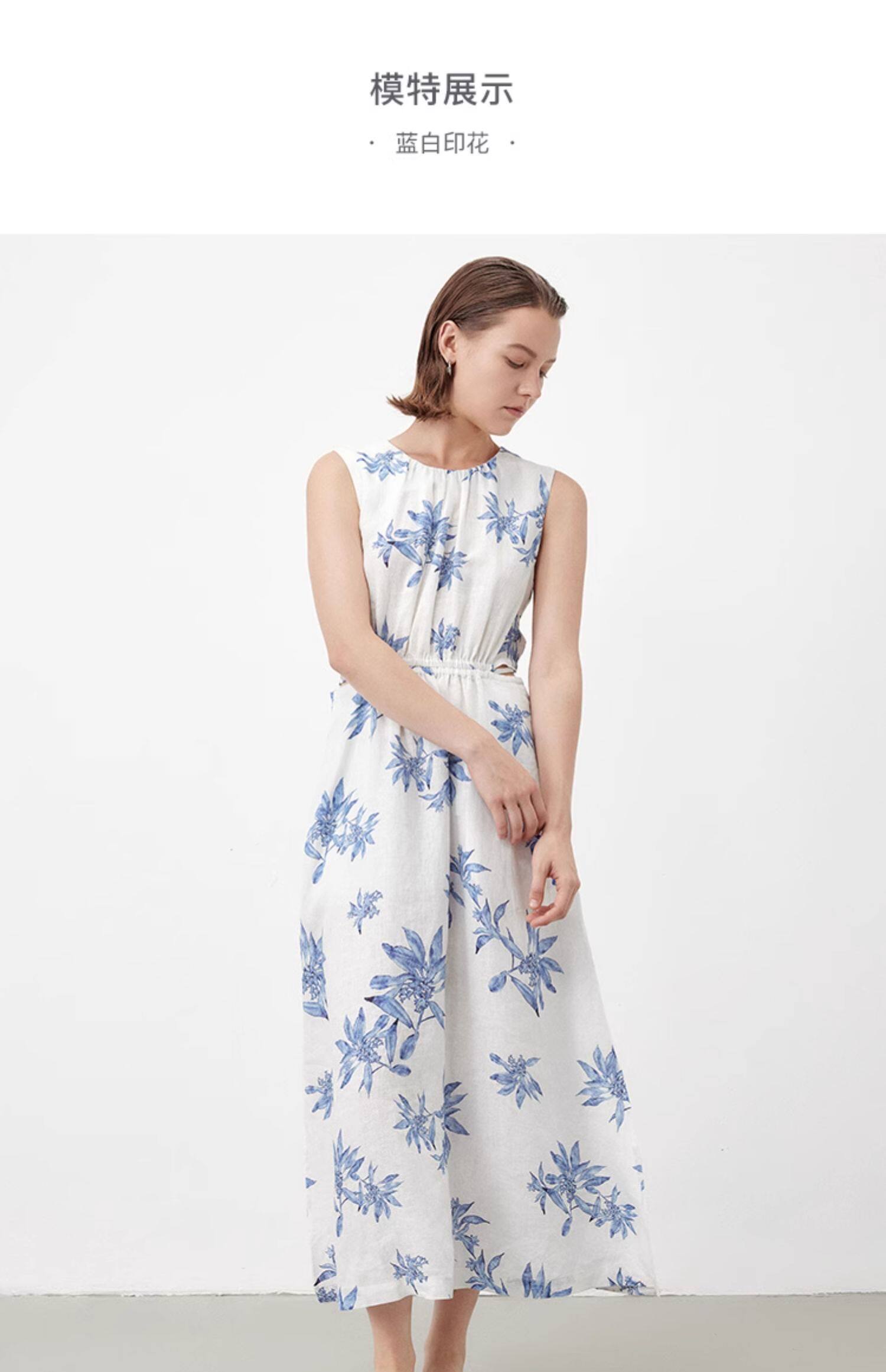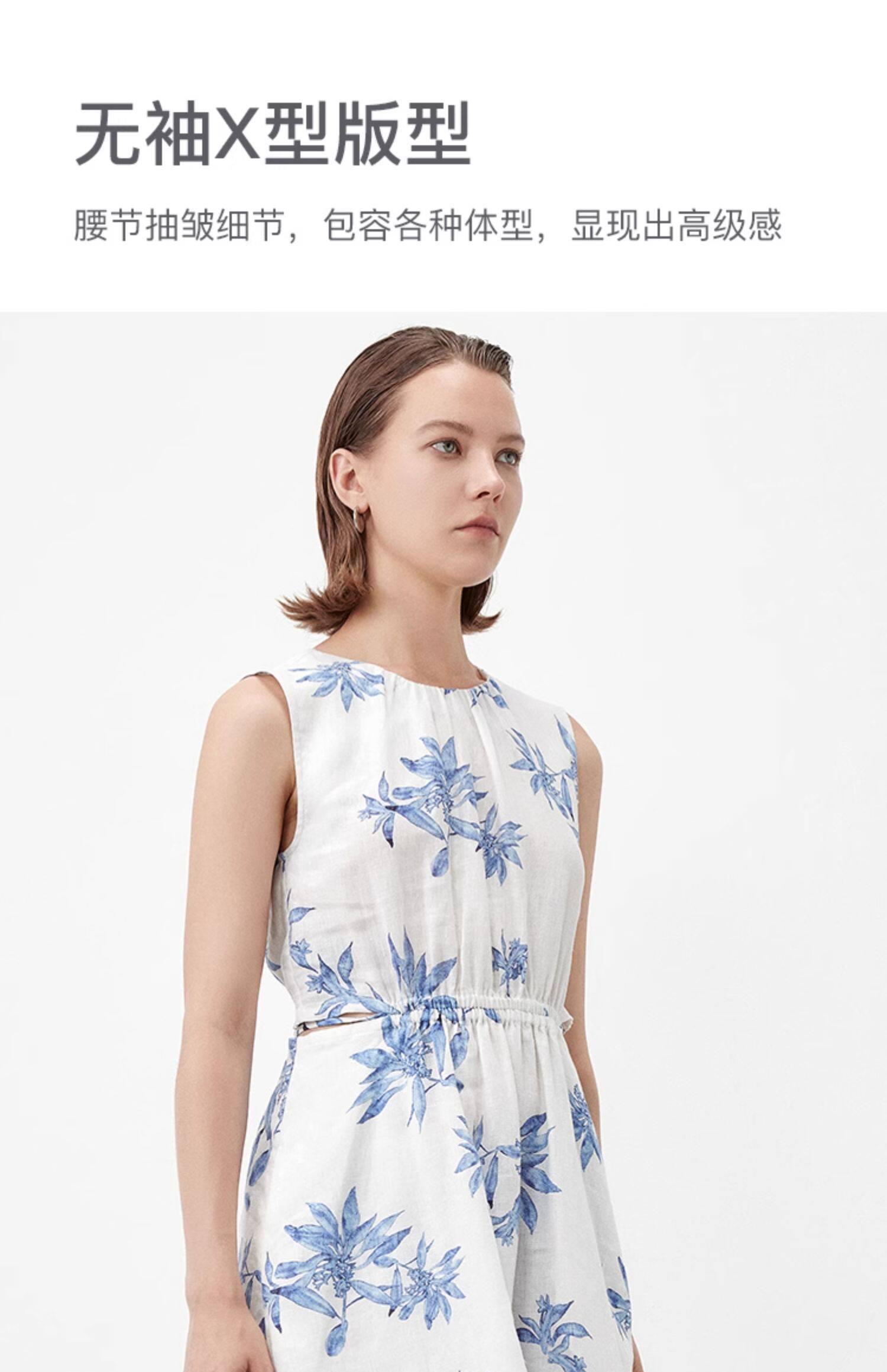 Marc O'Polo/MOP夏季新款好看天然亚麻时尚无袖印花露腰连衣裙女