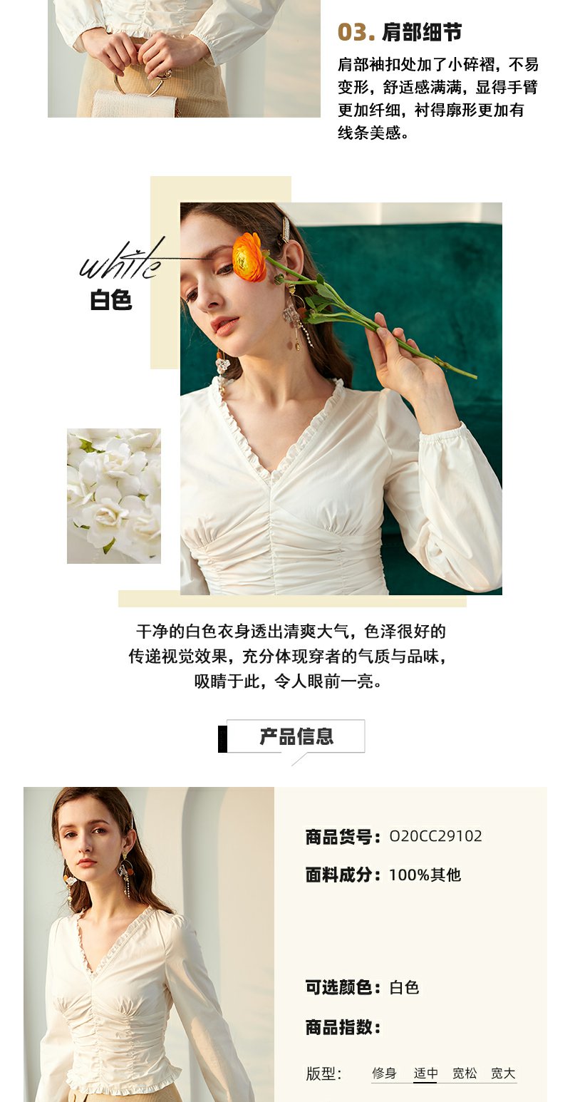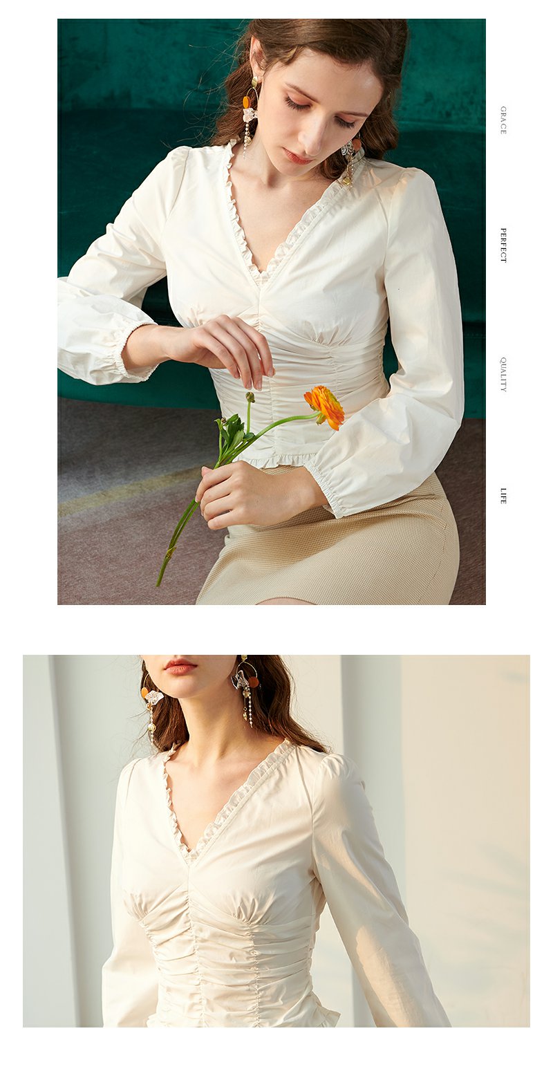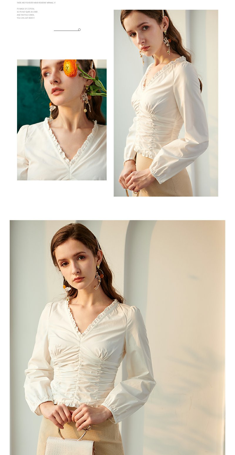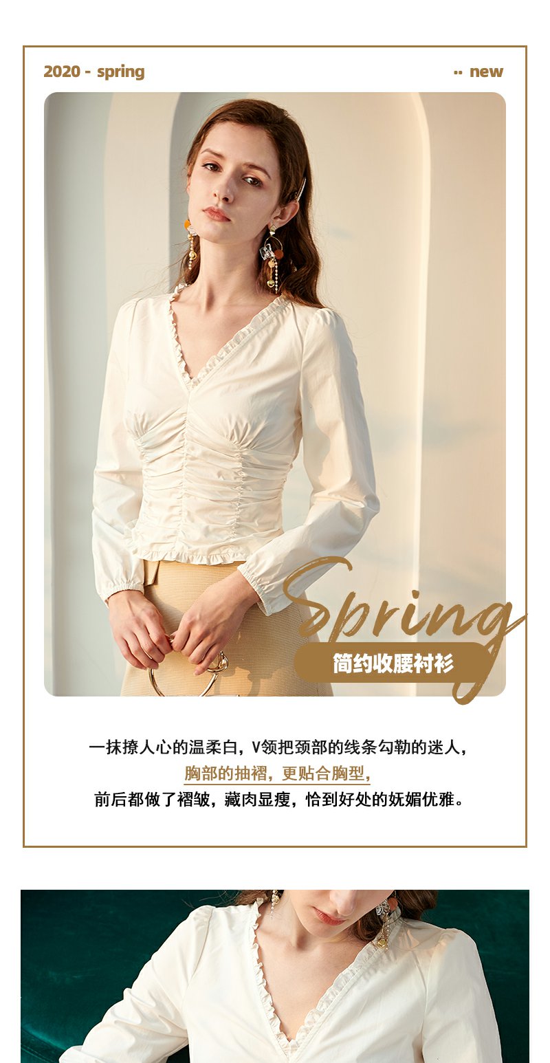 欧芮儿新款长袖收腰V领衬衫女白色气质修身设计感衬衣