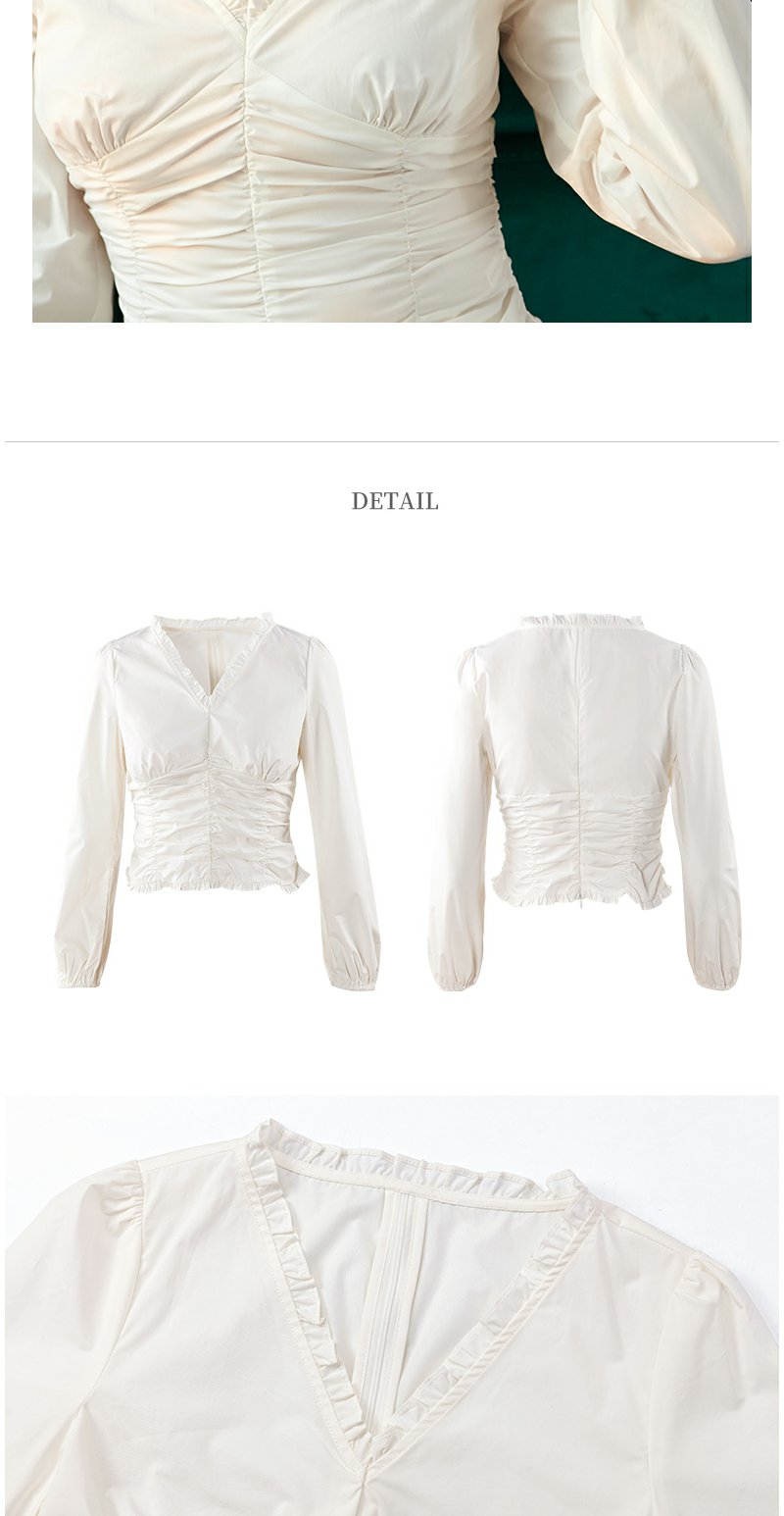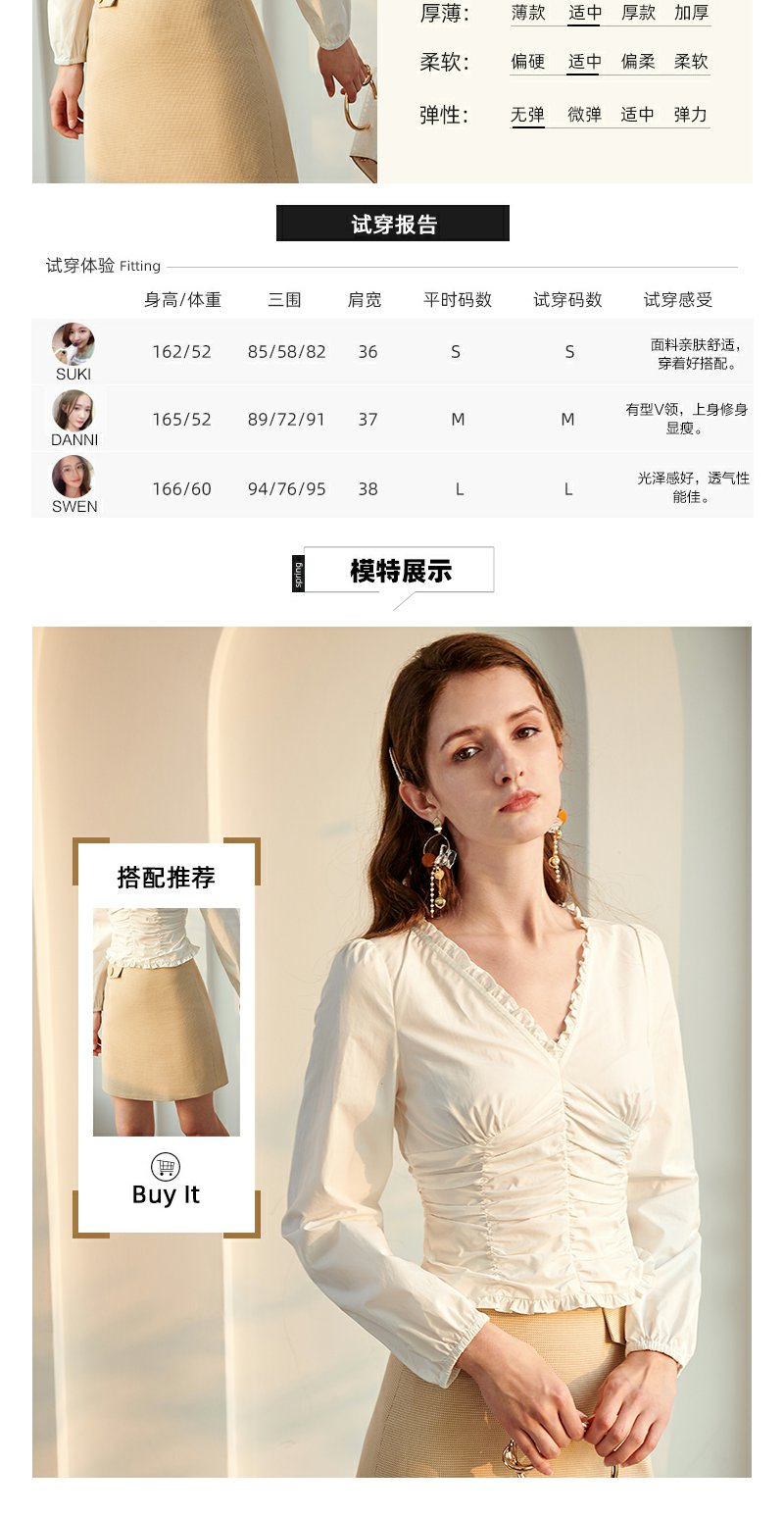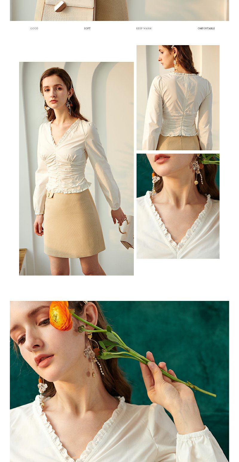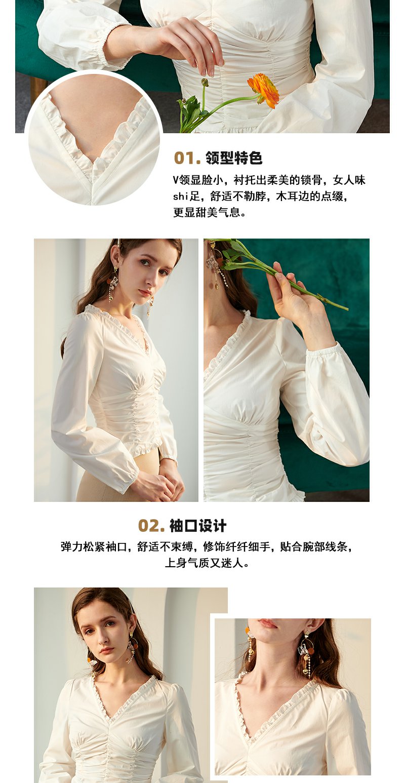 欧芮儿新款长袖收腰V领衬衫女白色气质修身设计感衬衣