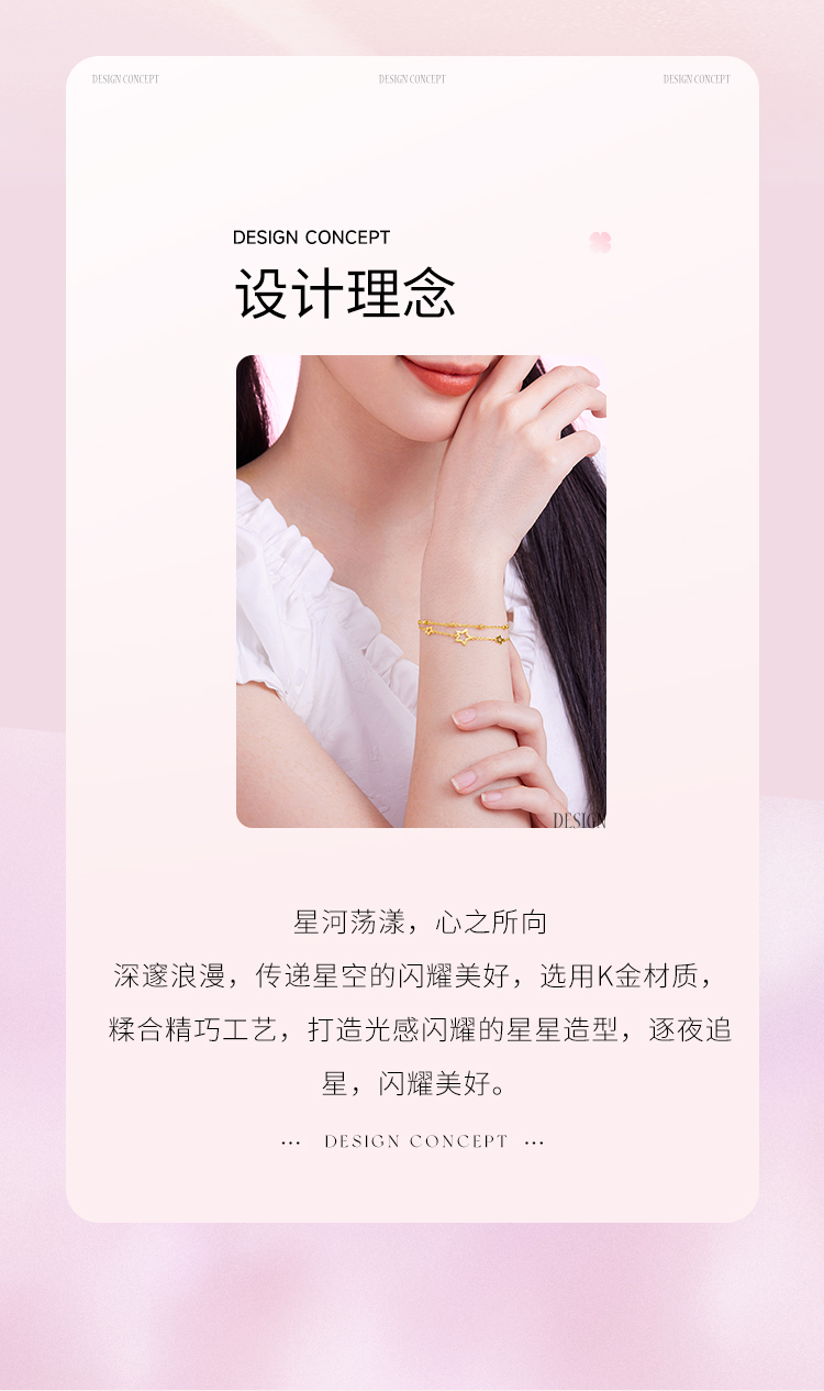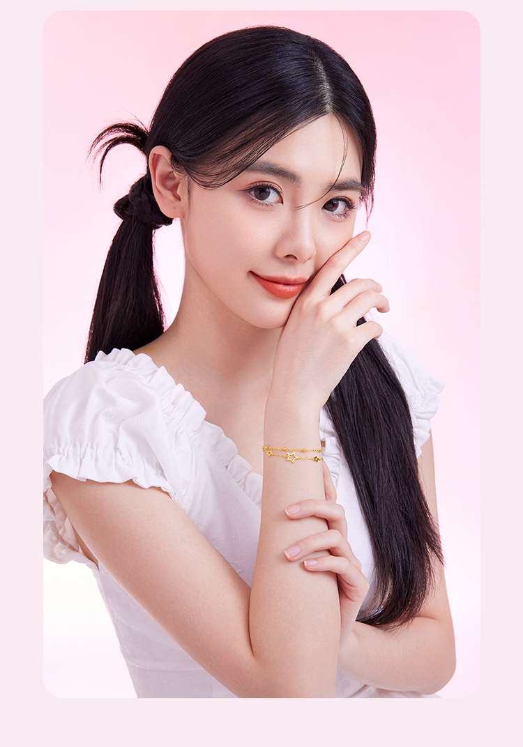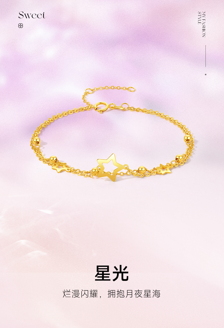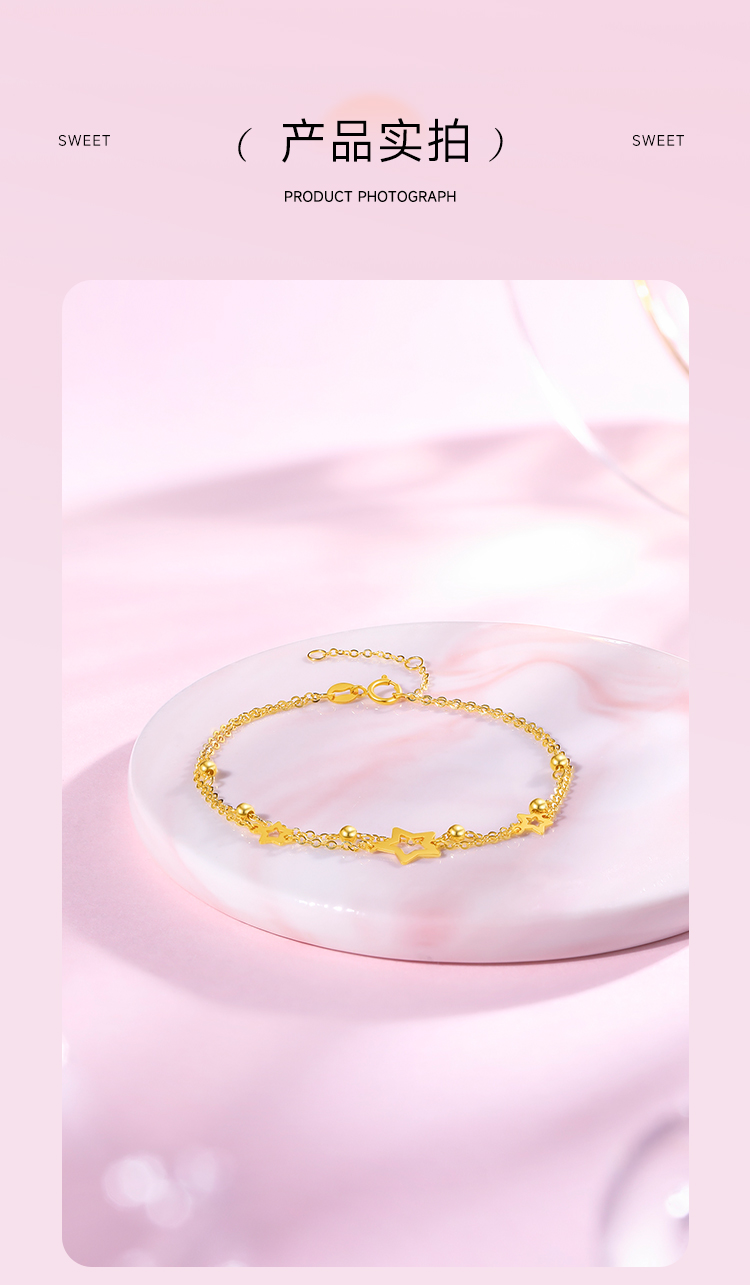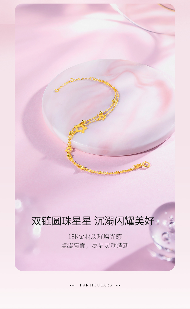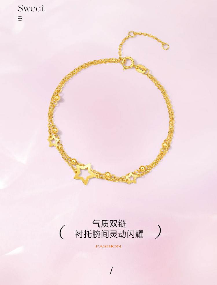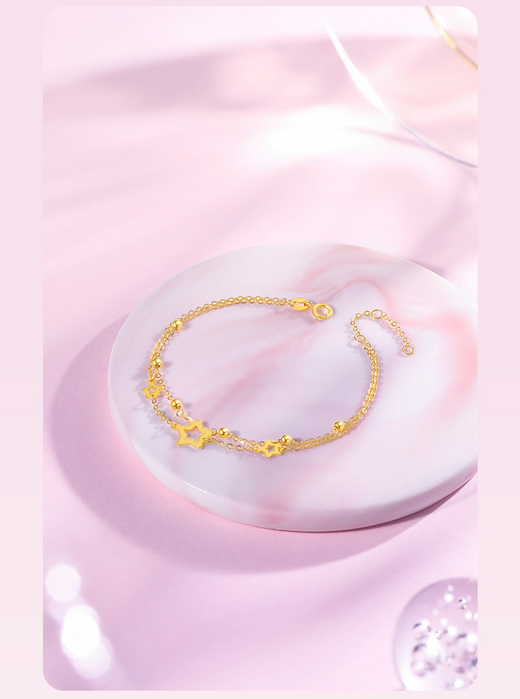 周六福黄18K金手链女五角星多圆珠彩金双层双链调节手饰送女友礼物