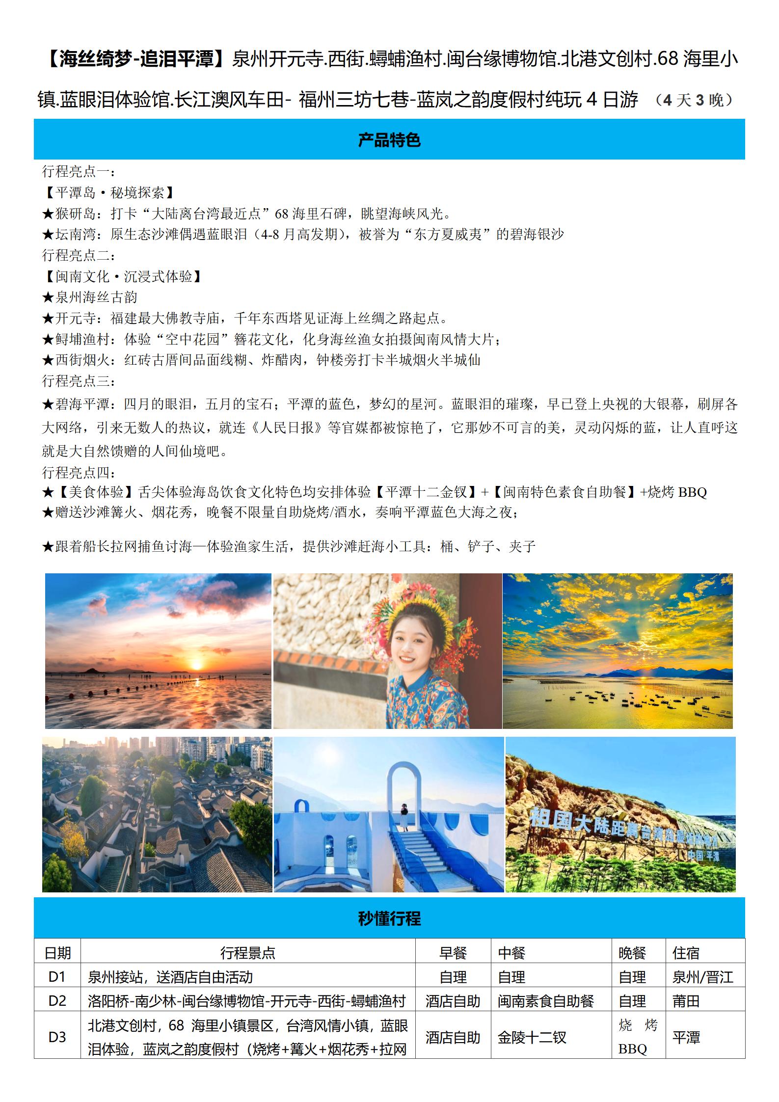 【五一】<福建平潭岛+福州+泉州4天动车团>泉州开元寺.西街.蟳蜅渔村.闽台缘博物馆.北港文创村.68海里小 镇.蓝眼泪体验馆.长江澳风车田- 福州三坊七巷-蓝岚之韵度假村