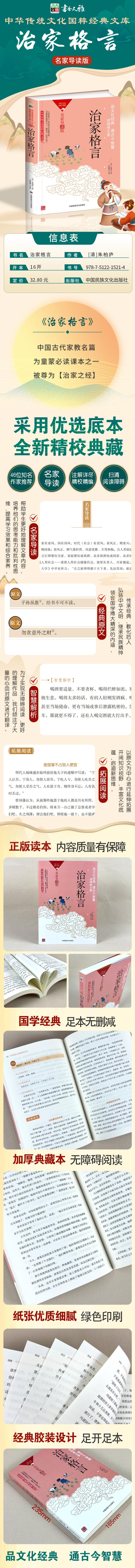 《治家格言》 以朱子的治家方法为纲,以上下古今之或先贤,或君王,或将相,或樵夫村姑的故事传说为目,生动传神,娓娓道来,将其格言讲得形象深刻,以其传承经典,教化后人,这对今天弘扬中华文明,继承民族精神,醇化社会风尚,增强民族软实力,不啻是一部优选的雅俗共赏、老少咸宜的好教材。导读人认为省思世风日渐不古,骄狂奢糜之风日甚的今天,疏淡了家庭教育和修身与治家的意念,《治家格言》的出版真是此其时也,它必将给人一种久违后的亲近,必将带给人一种精神的靠岸。