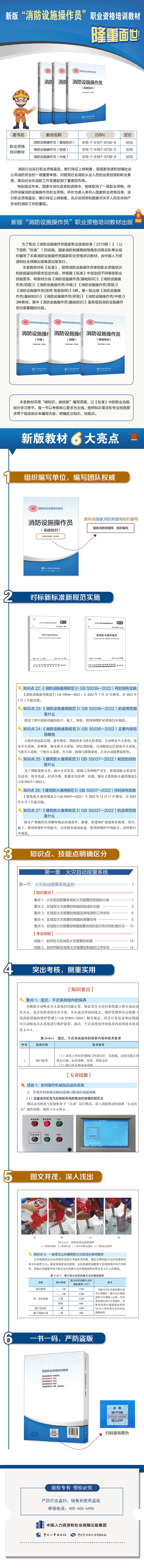 消防设施操作员是指从事建(构)物消防设施运行、操作和维修、保养、检测等工作的人员。又分为消防设施操作监控方向和消防设施检测维保方向。其中消防设施操作监控方向分为五级/初级工、四级/中级工、三级/高级工、二级/技师;消防设施检测维保方向又分为四级/中级工、三级/高级工、二级/技师、一级/高级技师。消防设施操作员在职业分类中被列为准入类职业,该职业于2019年出版了第一版教材。本次在原教材的基础上,进行了近期新内容的改版。