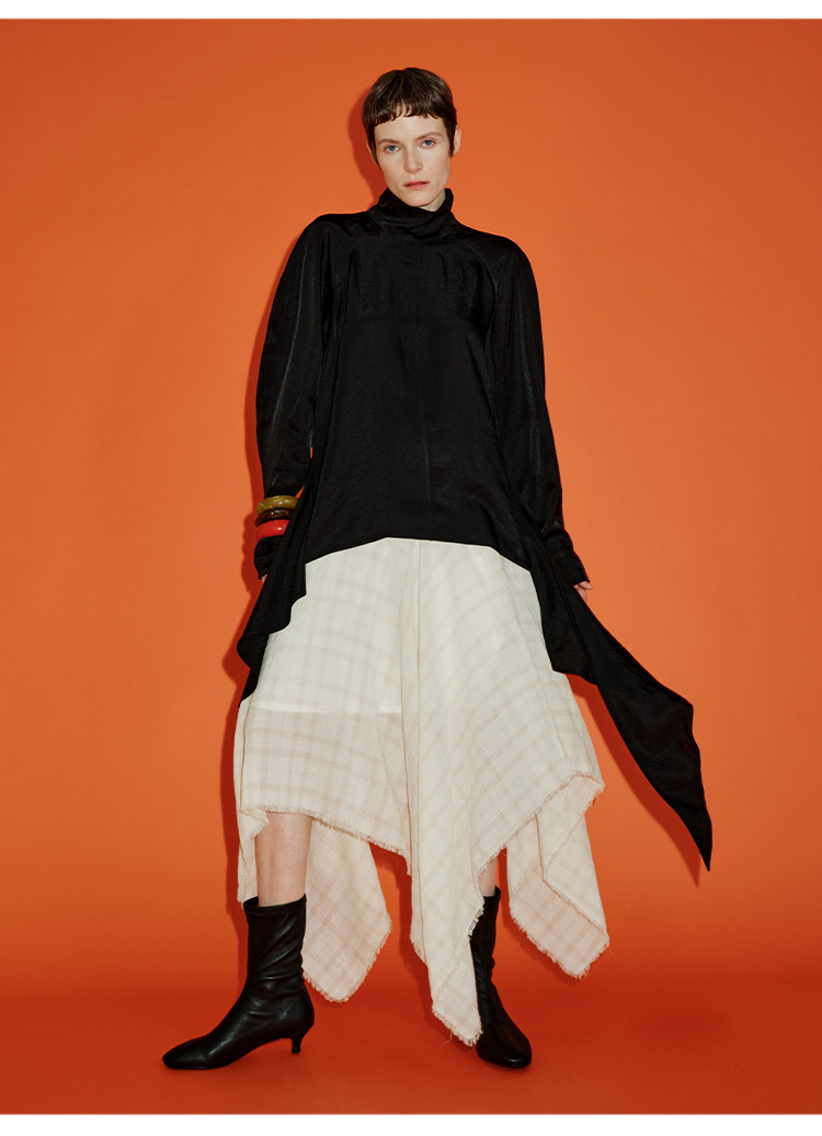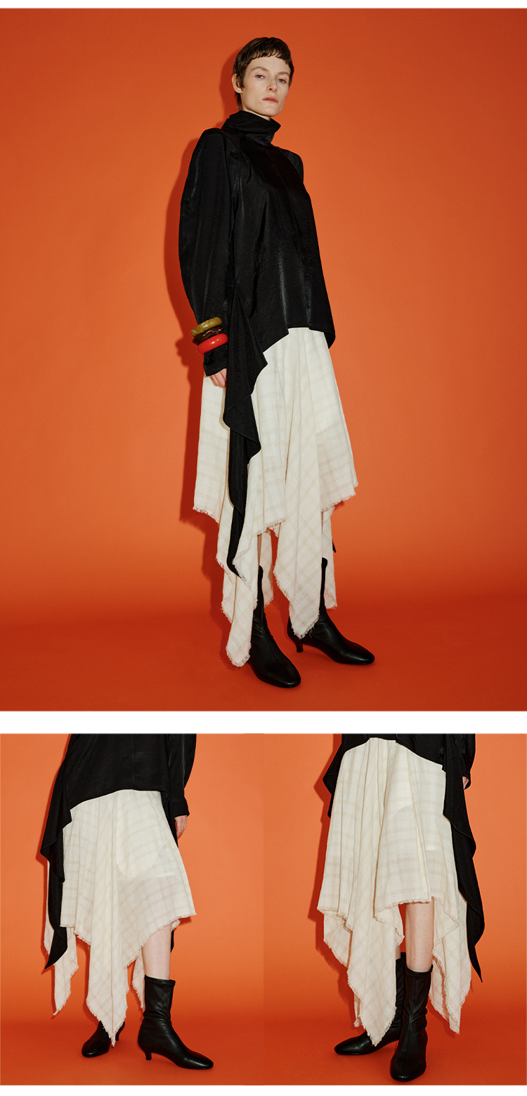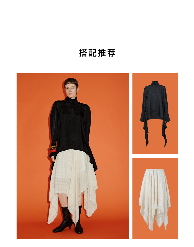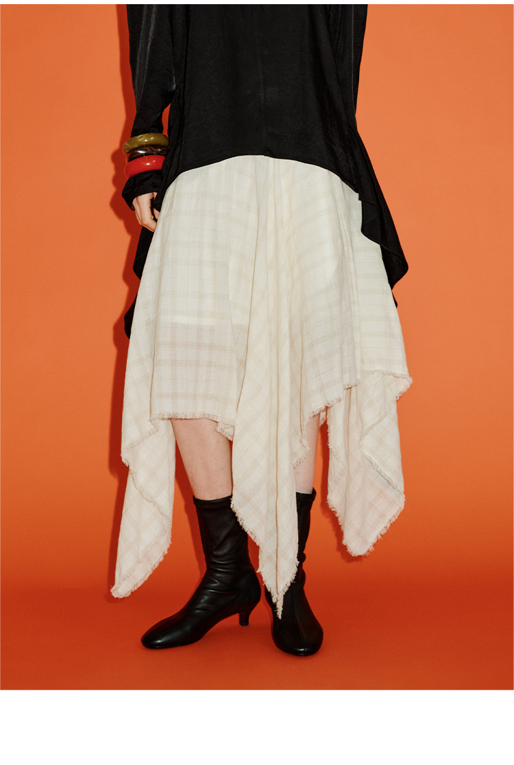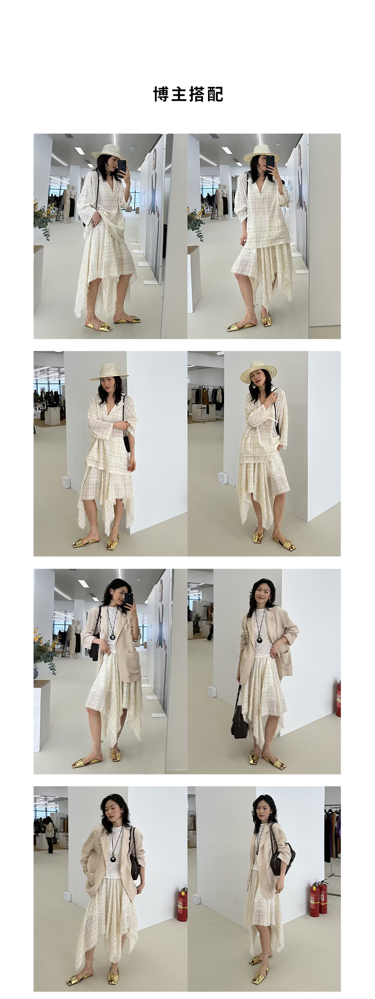 HIDEMI 极简设计感进口艺术感雕花色织格纹自然环保工艺原麻色西装翻领大口袋廓形上衣半裙套装 上衣/不规则半裙