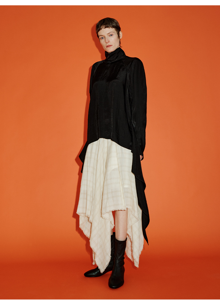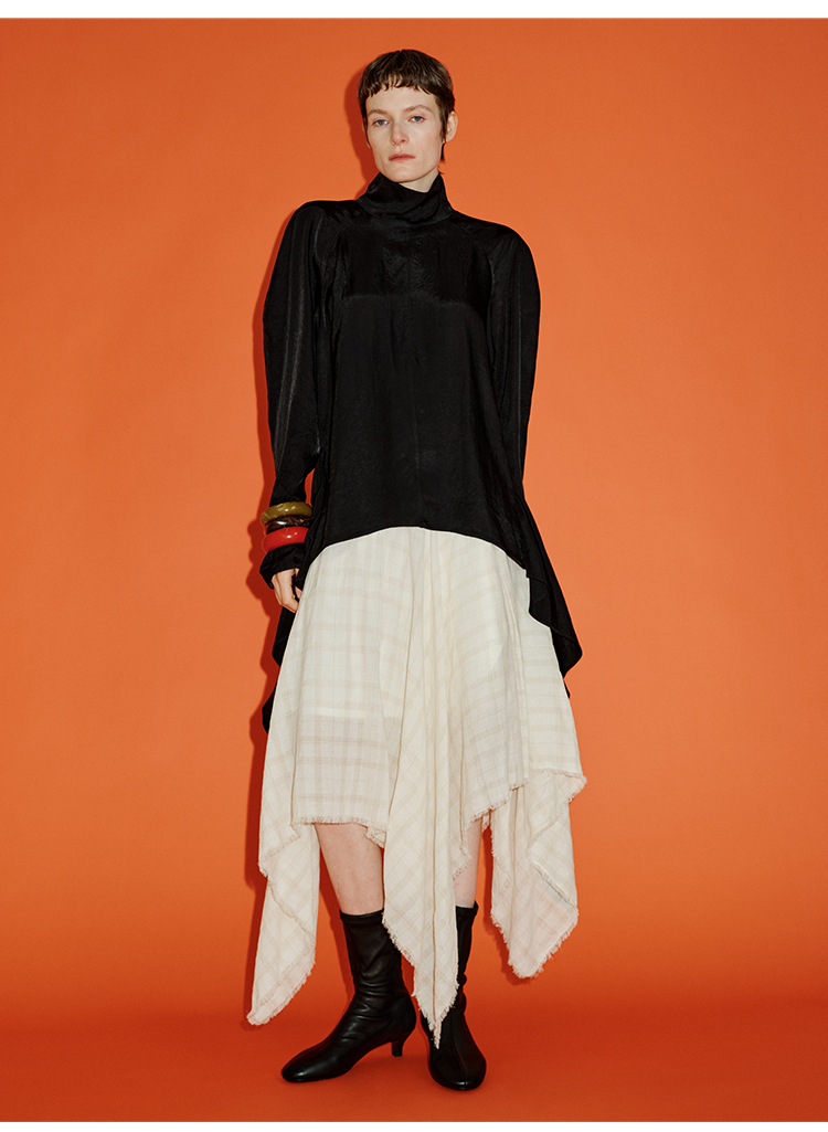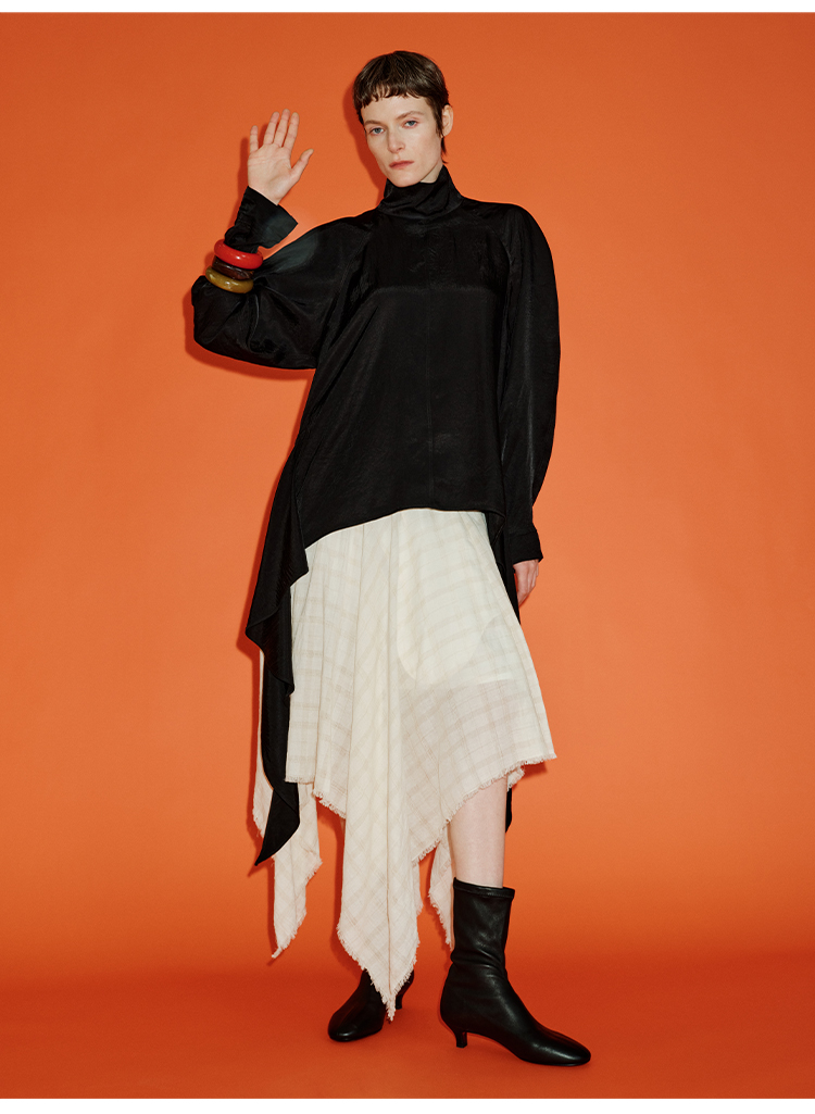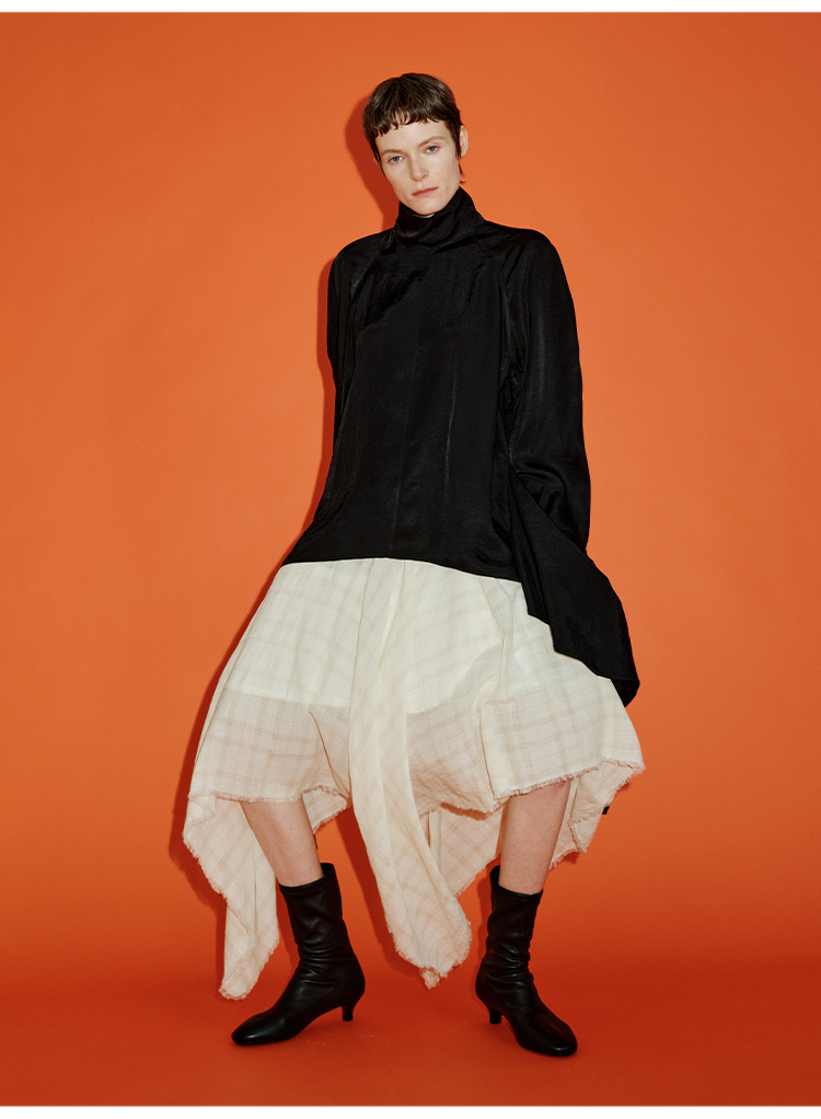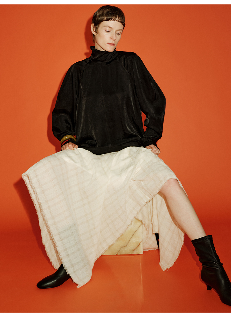HIDEMI 极简设计感进口艺术感雕花色织格纹自然环保工艺原麻色西装翻领大口袋廓形上衣半裙套装 上衣/不规则半裙