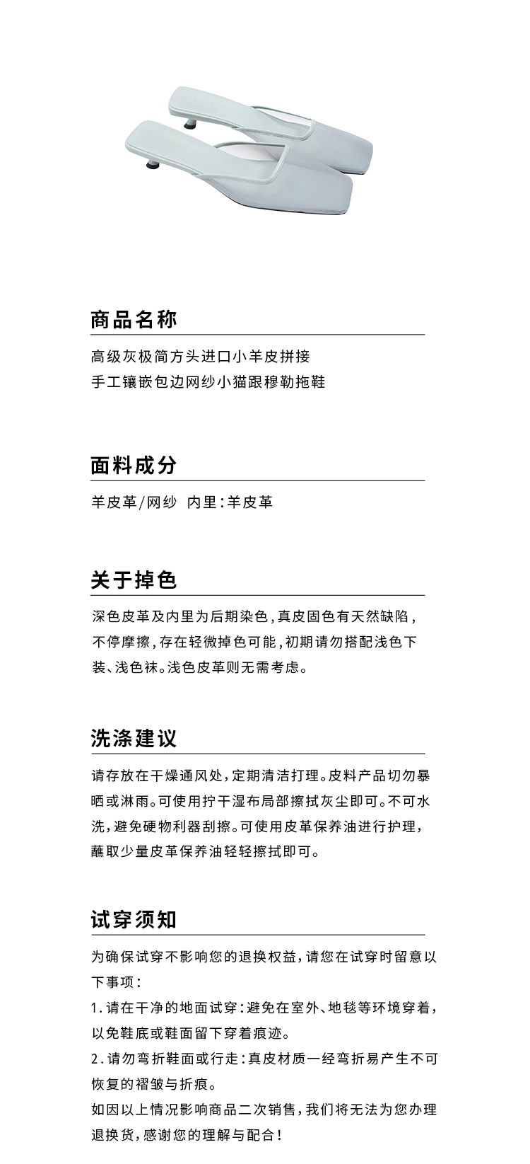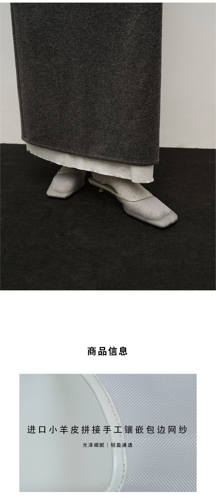 HIDEMI 高级灰极简方头进口小羊皮拼接手工镶嵌包边网纱小猫跟穆勒拖鞋