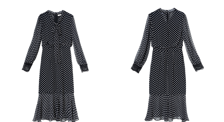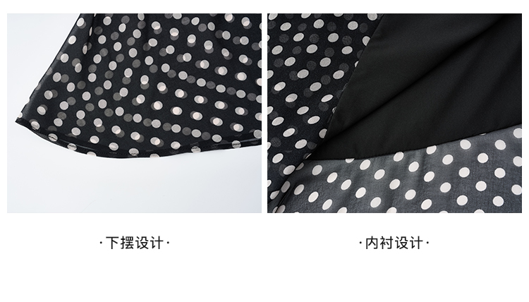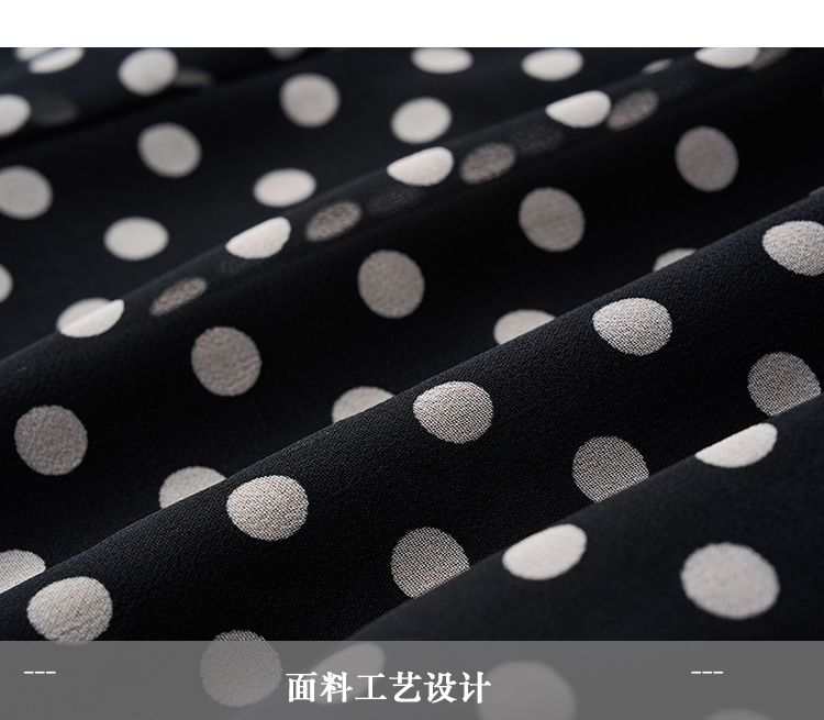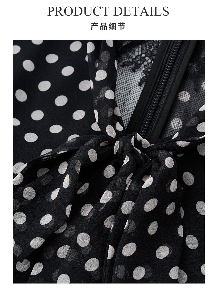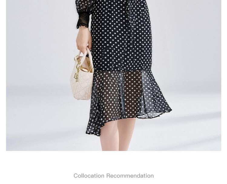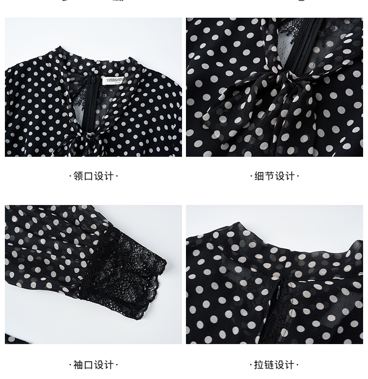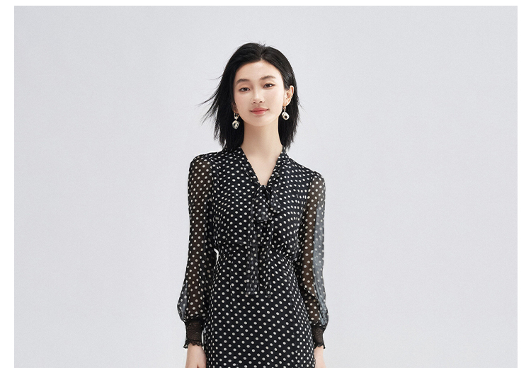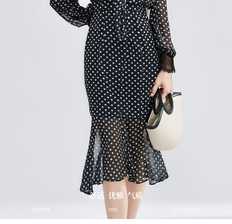 复古优雅波点鱼尾裙 米思阳2026春季新品飘带领侧开叉中长款连衣裙女4273