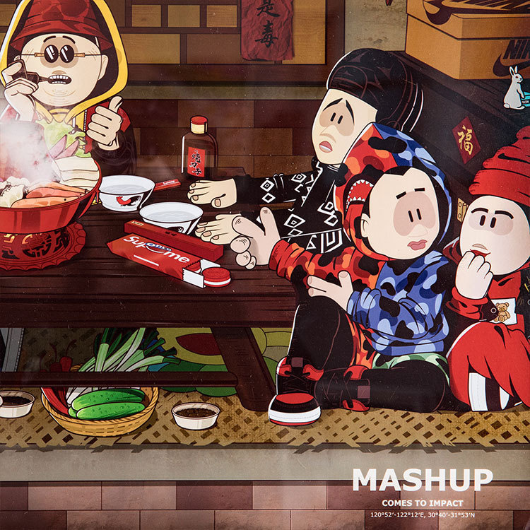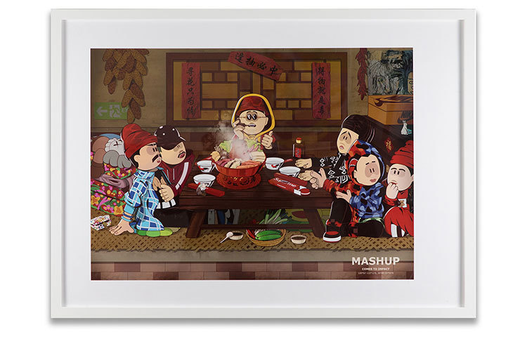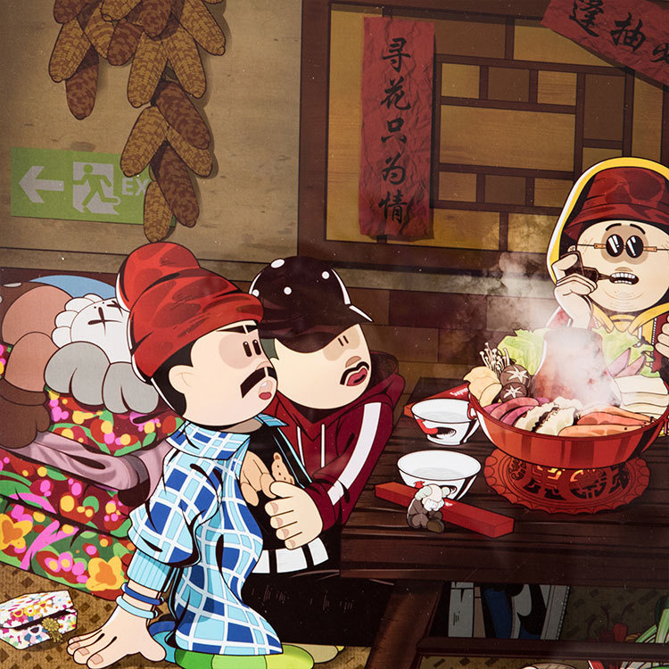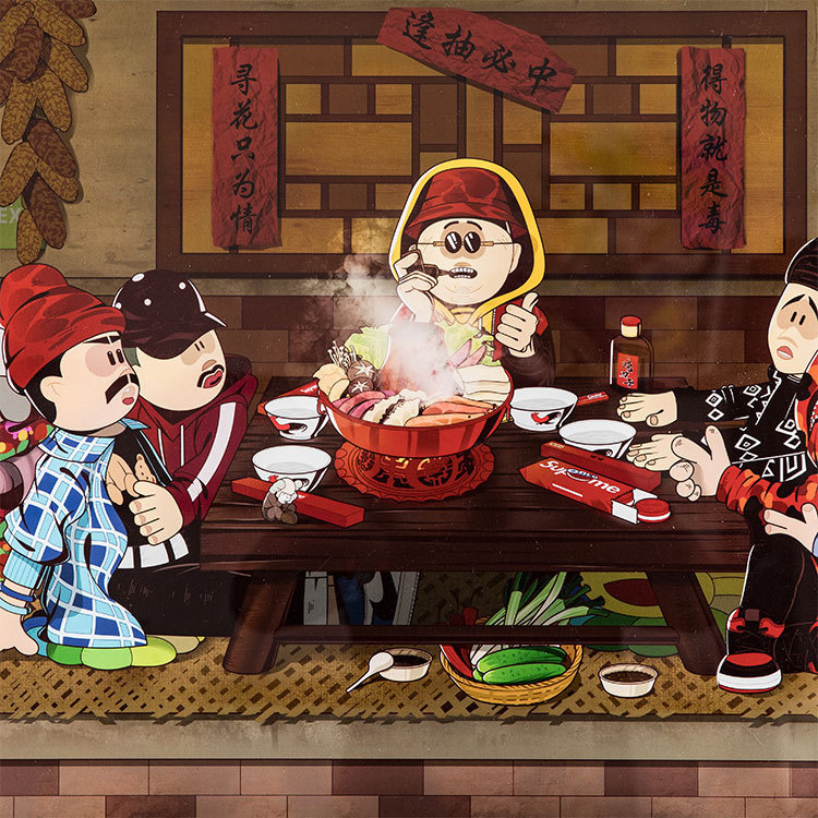 结合火热的农村爱情轻喜剧《乡村爱情》创作出一幅既潮流又有家乡情怀的全新画作,在东北,曾经有种待客礼仪叫上炕,不论春夏秋冬,但凡来了客人首先就招呼客人上炕,东北大花棉被上躺着个KAWS,饭桌上热腾腾的火锅,配上蘸酱菜、加上家喻户晓的“烧刀子”还有赵四后面柜子上的艺术画,“Dos Cabezas”