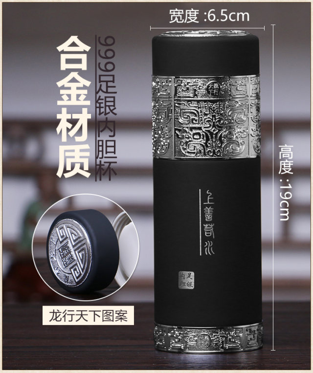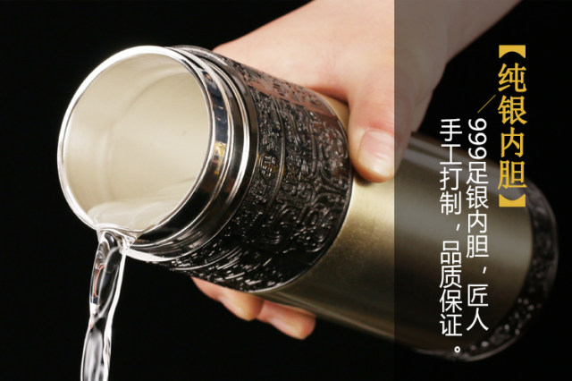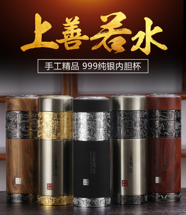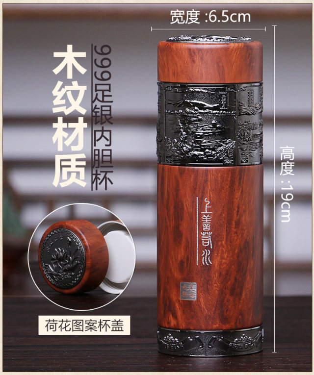 【寓意】:茶水杯外壳以木纹与合金镶嵌,油亮光滑且古韵悠长,外观触感俱佳。内胆为足银材质,释放银离子,消毒杀菌,日常保健。