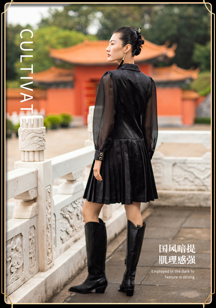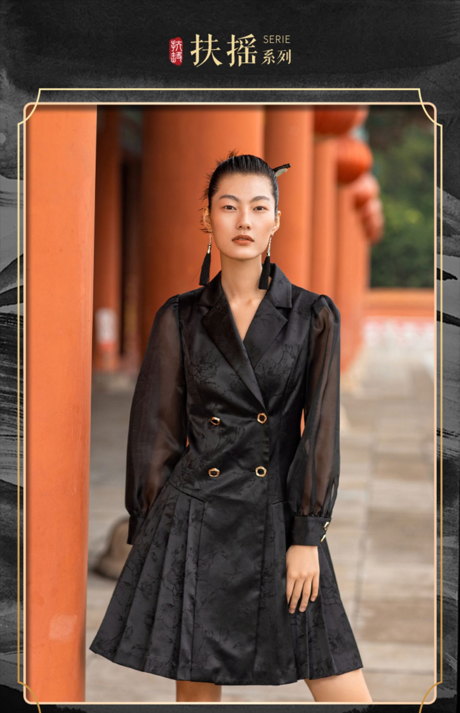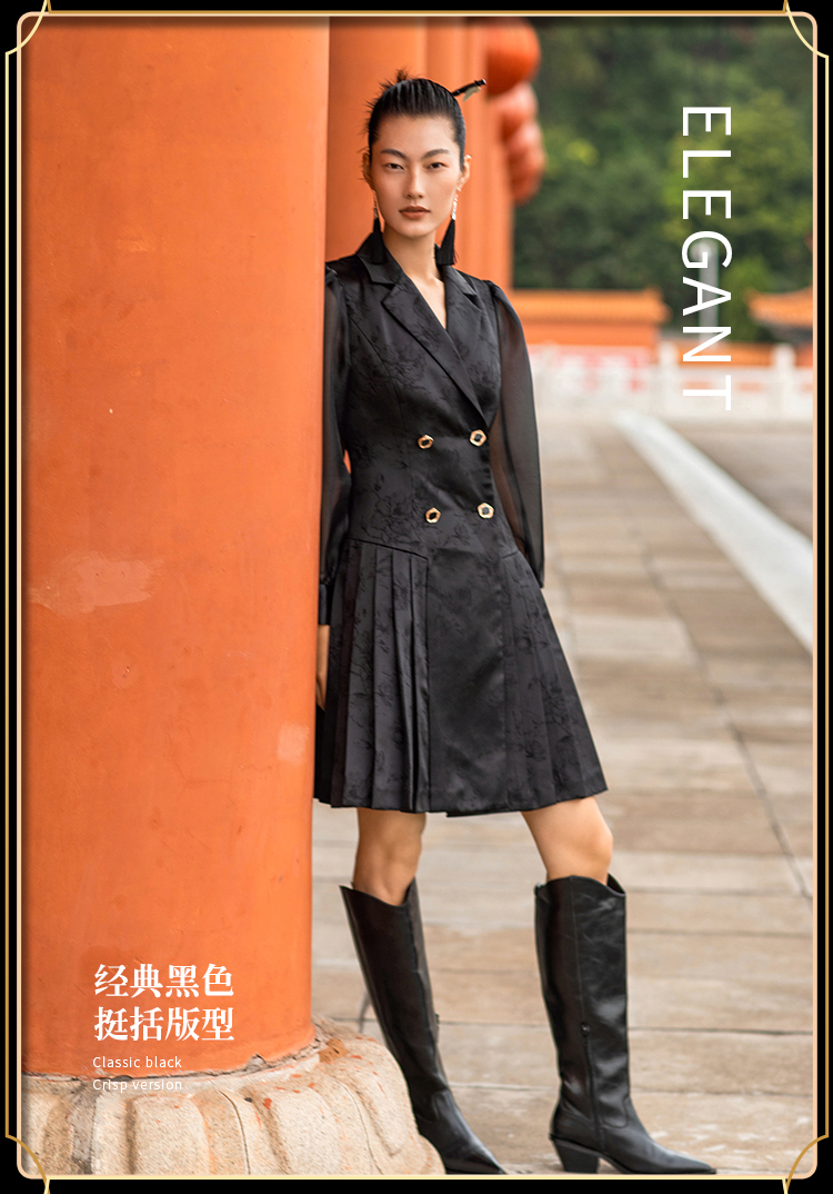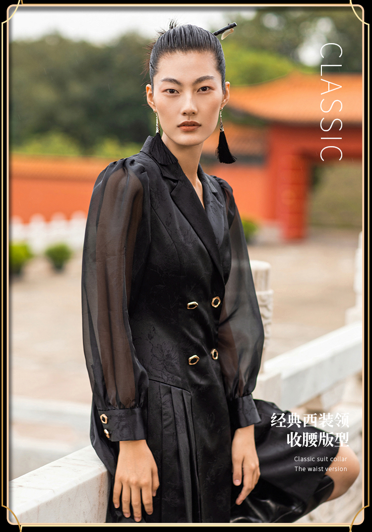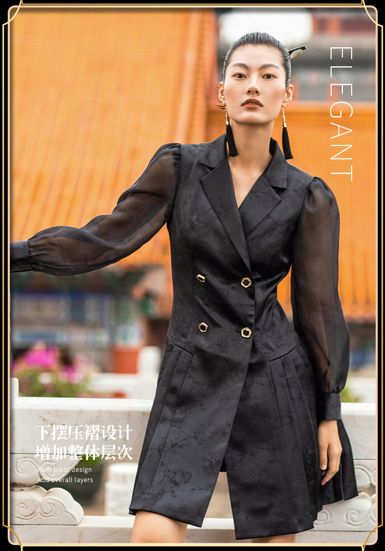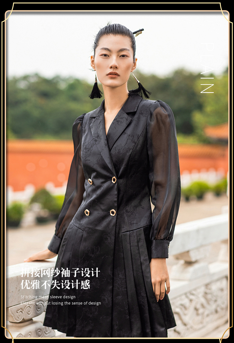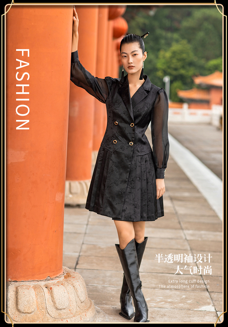 IWY/扶摇国风时尚西装套装黑色连衣裙拼接网纱袖子设计时尚 213230Q1