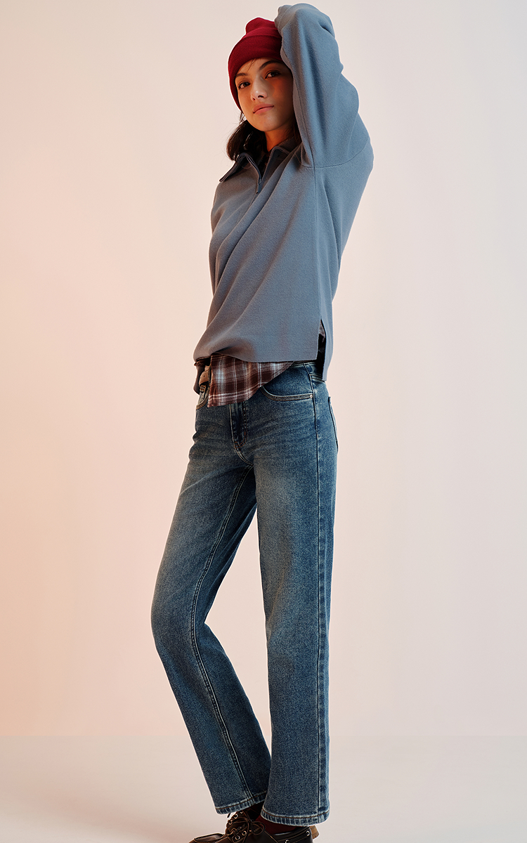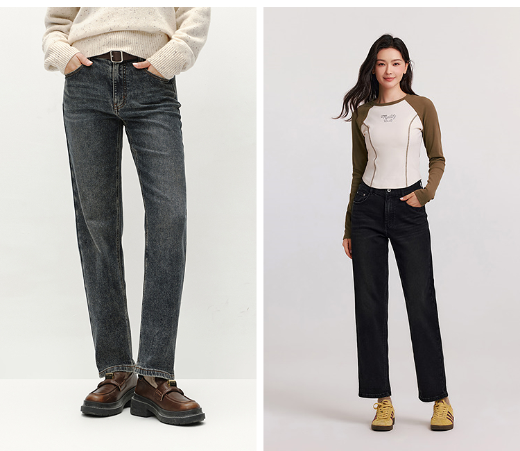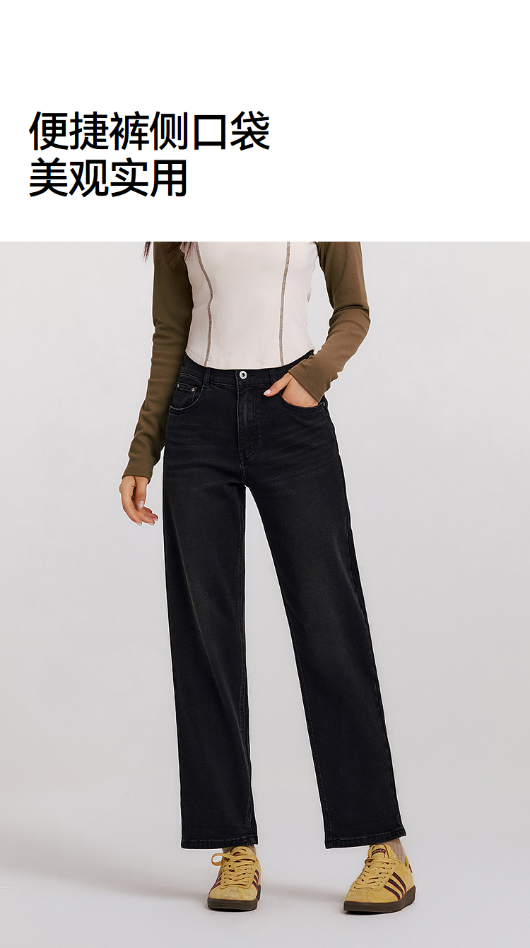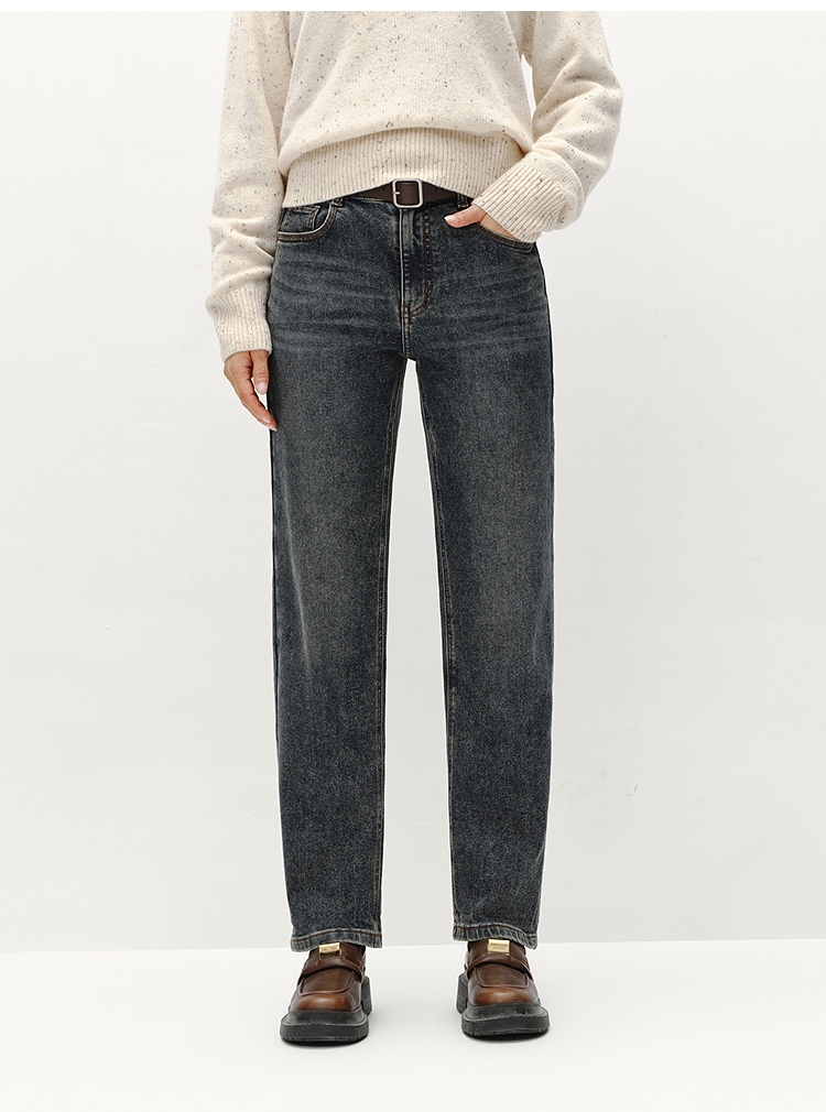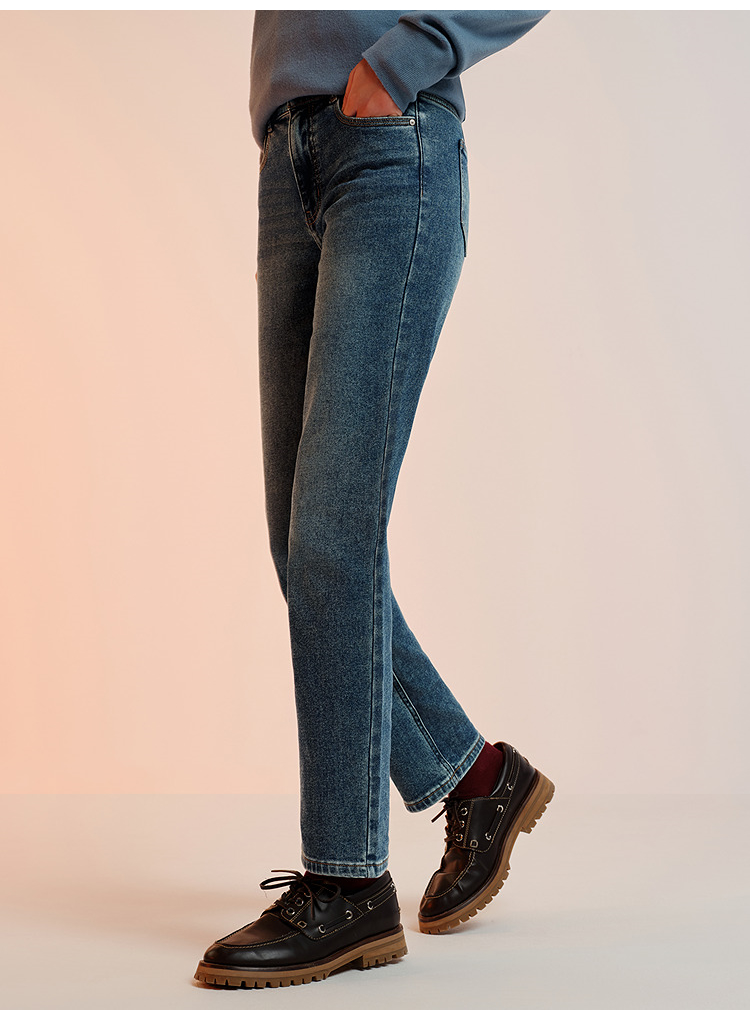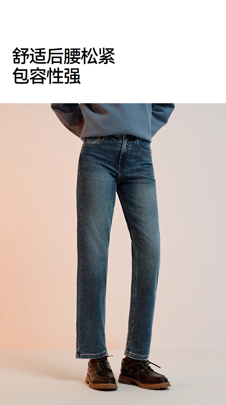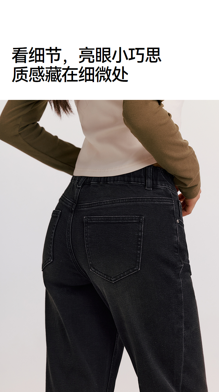 森柔牛仔|森马牛仔裤女抓毛长裤女生冬季半松紧腰直筒裤美式休闲