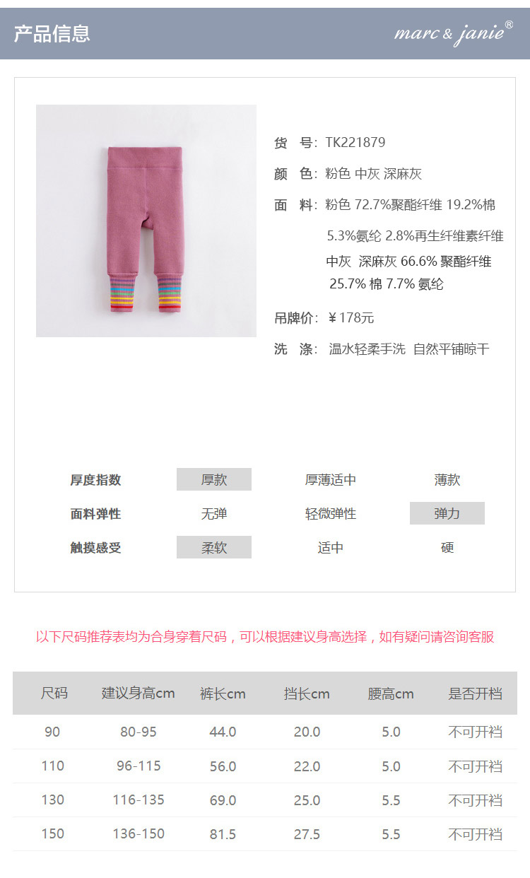 马克珍妮冬装新款 女童高腰护肚加绒打底裤 儿童裤子221879