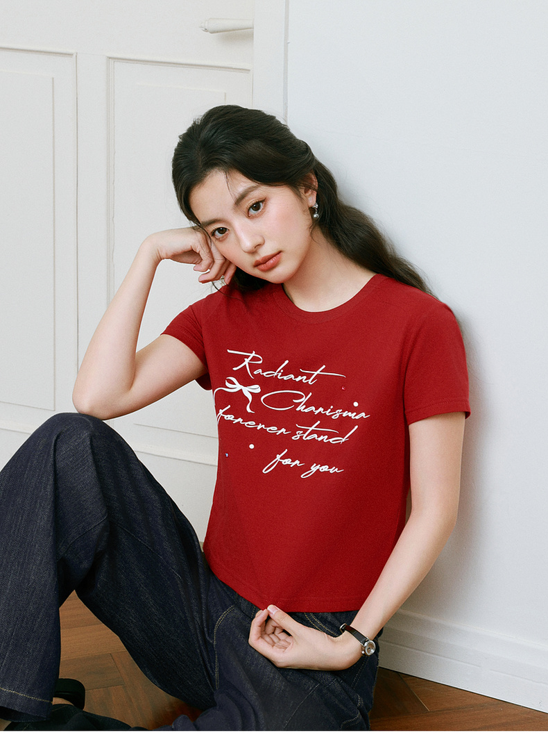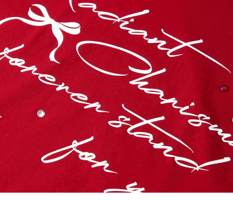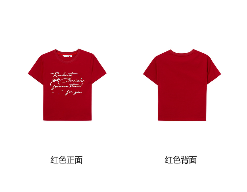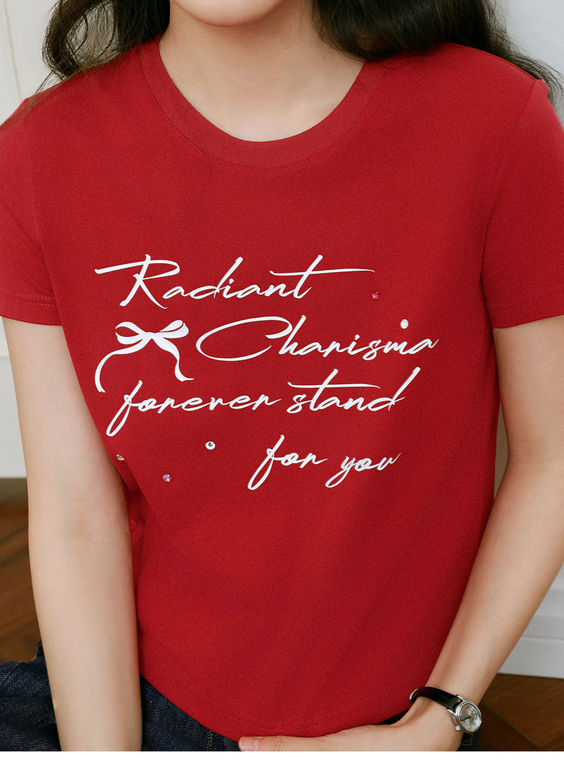 【严选】诗凡黎字母印花红色T恤2025夏新款钉珠流行设计感时尚别致上衣7G4200831