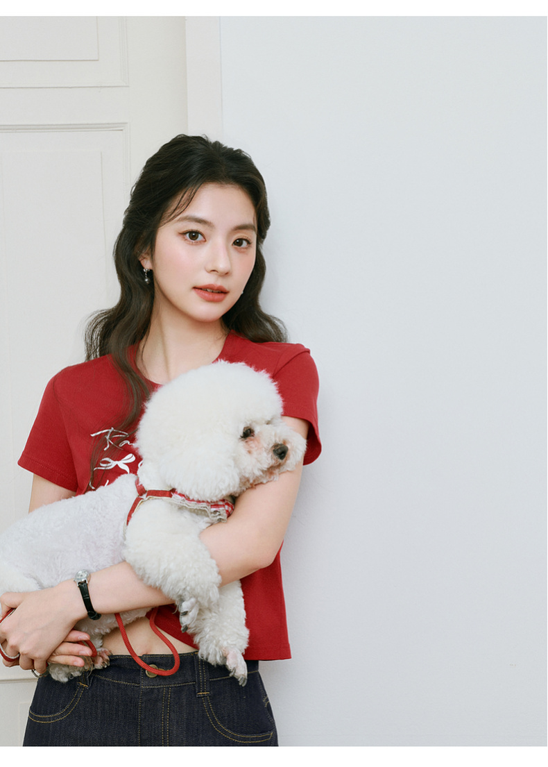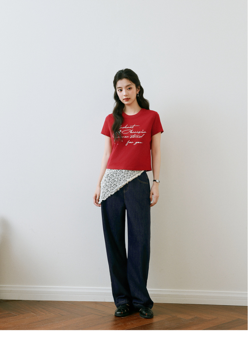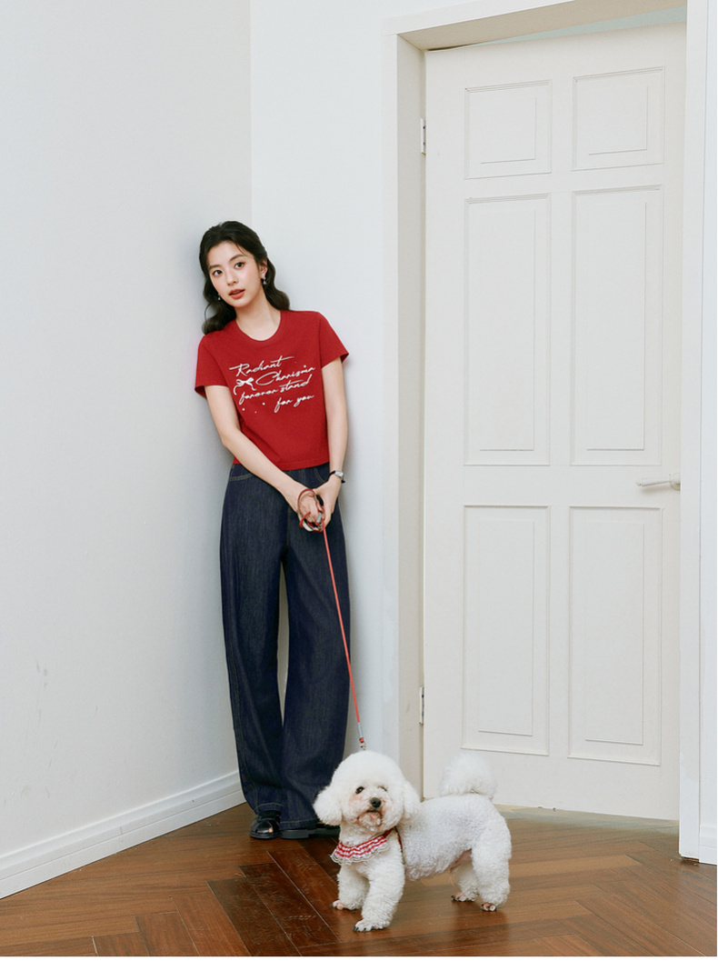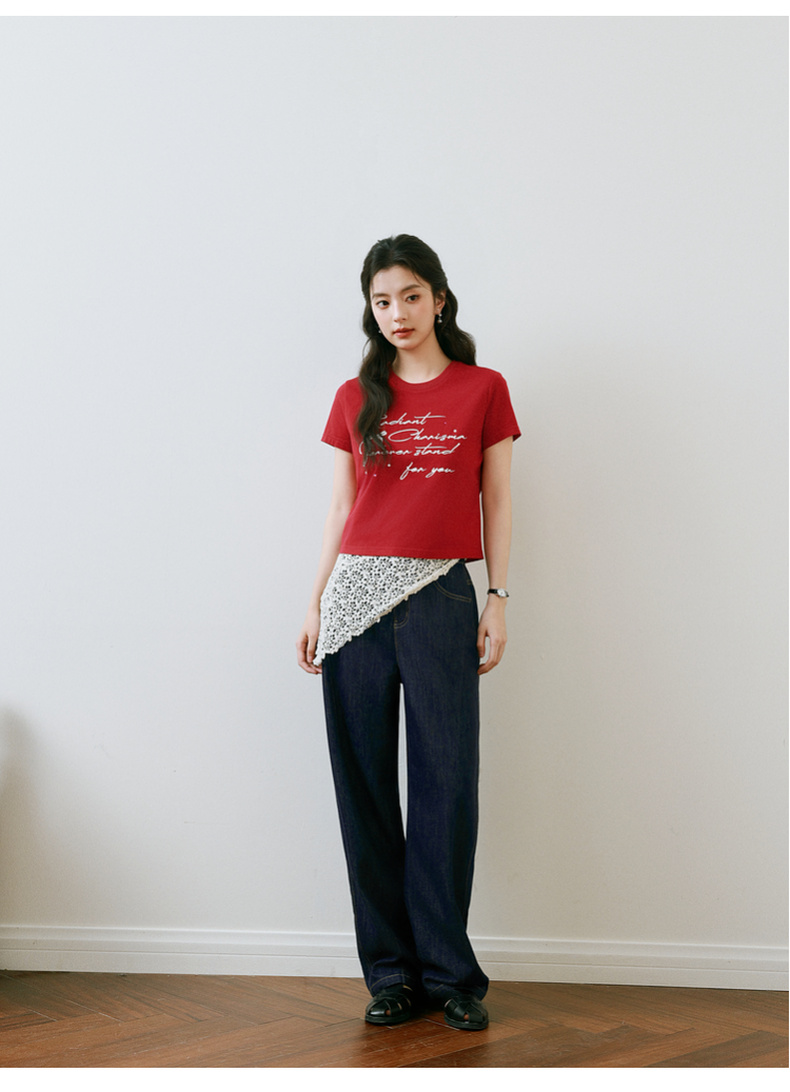 【严选】诗凡黎字母印花红色T恤2025夏新款钉珠流行设计感时尚别致上衣7G4200831