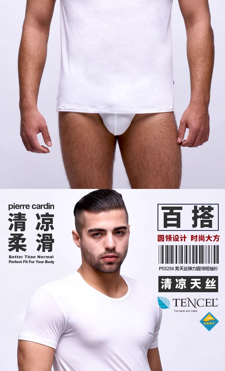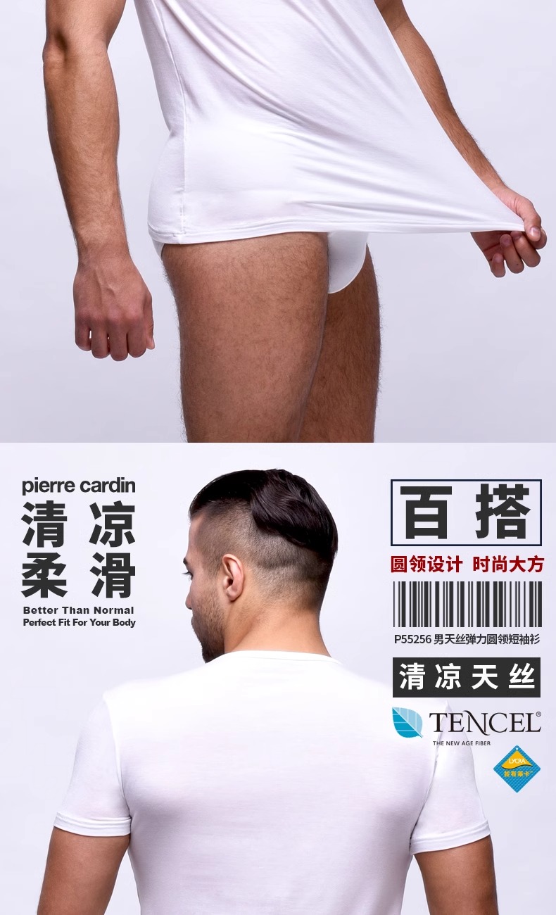 【惊喜价】皮尔卡丹男天丝弹力圆领短袖T恤衫修身时尚打底衫
