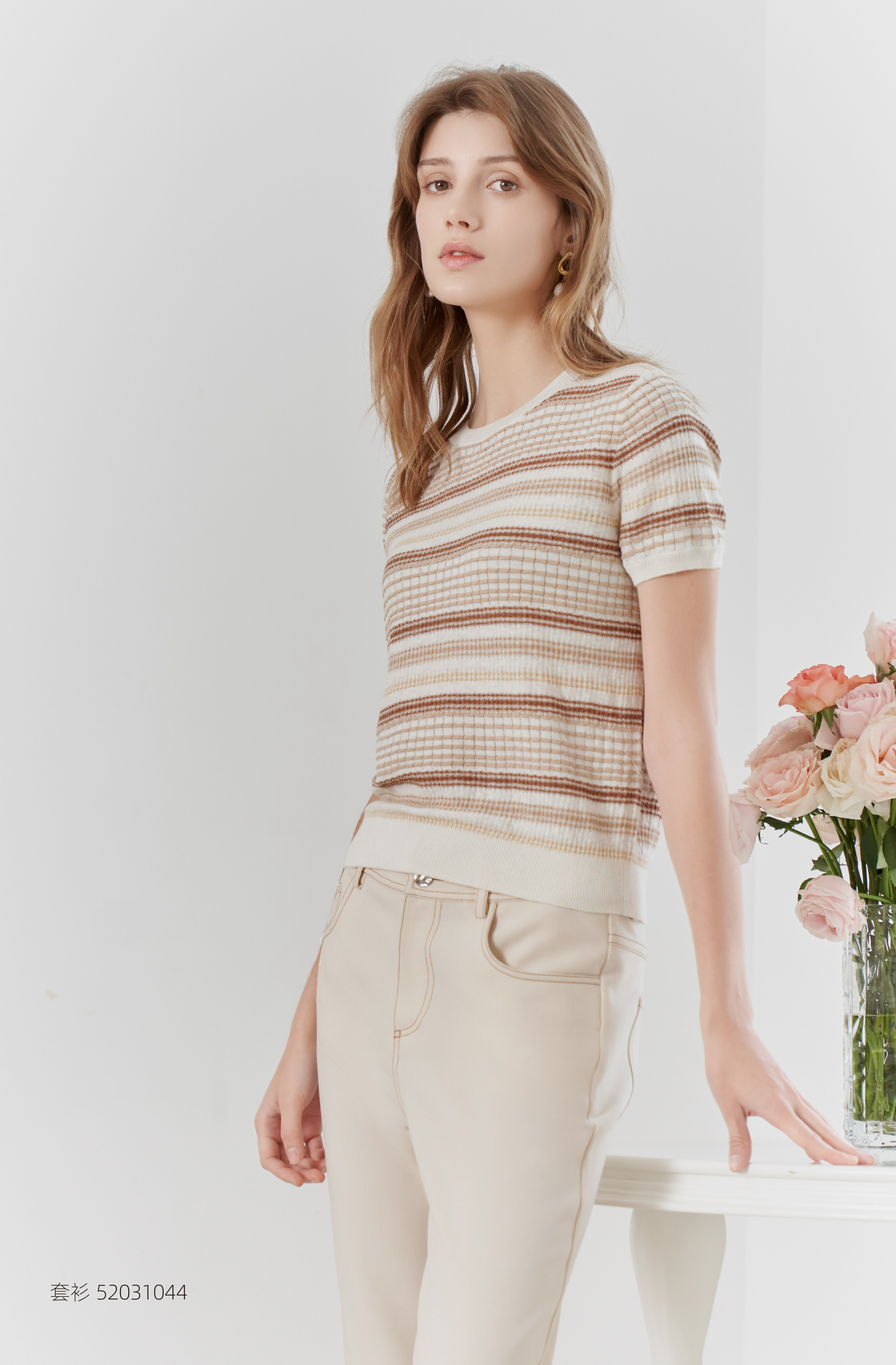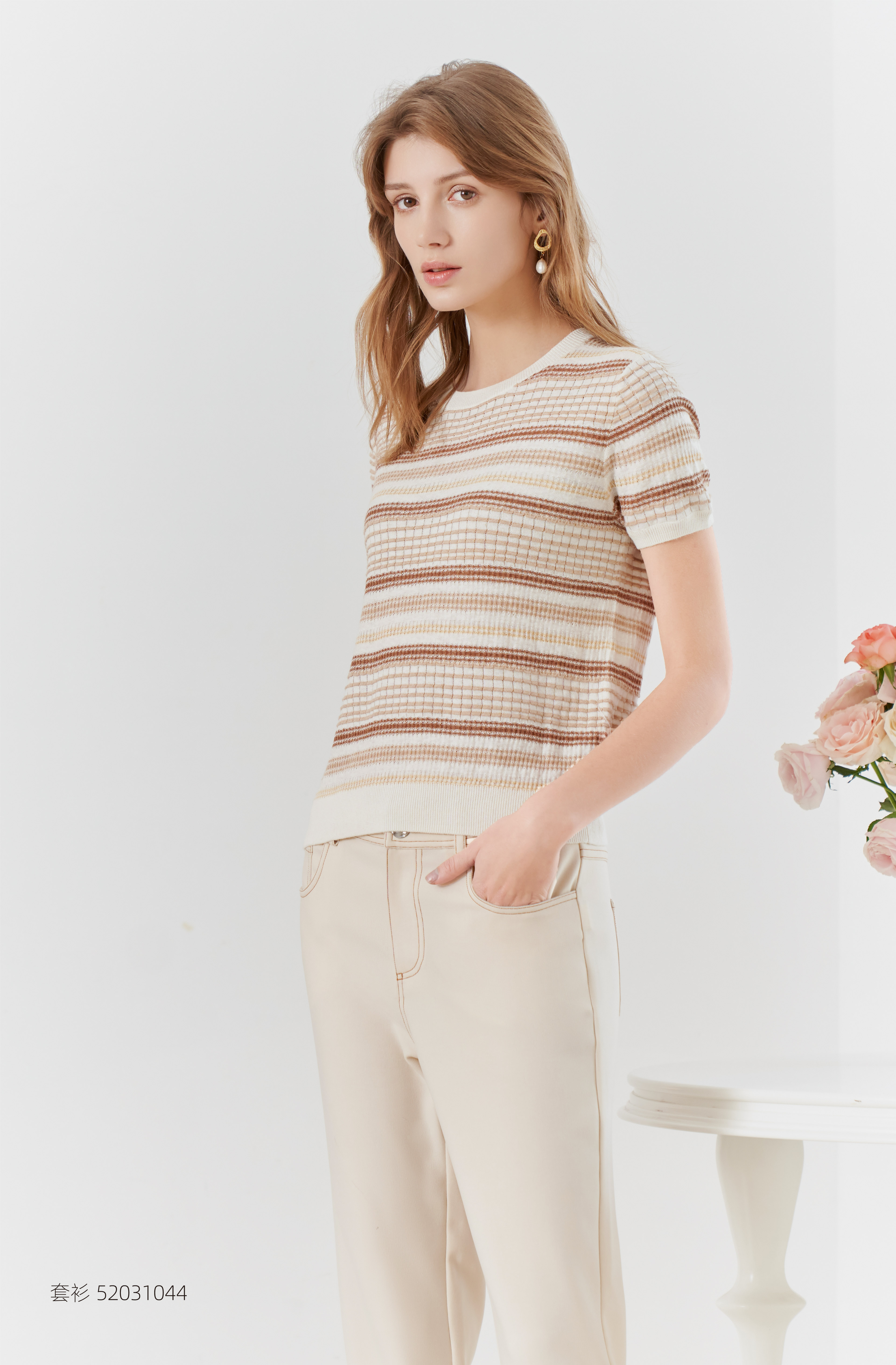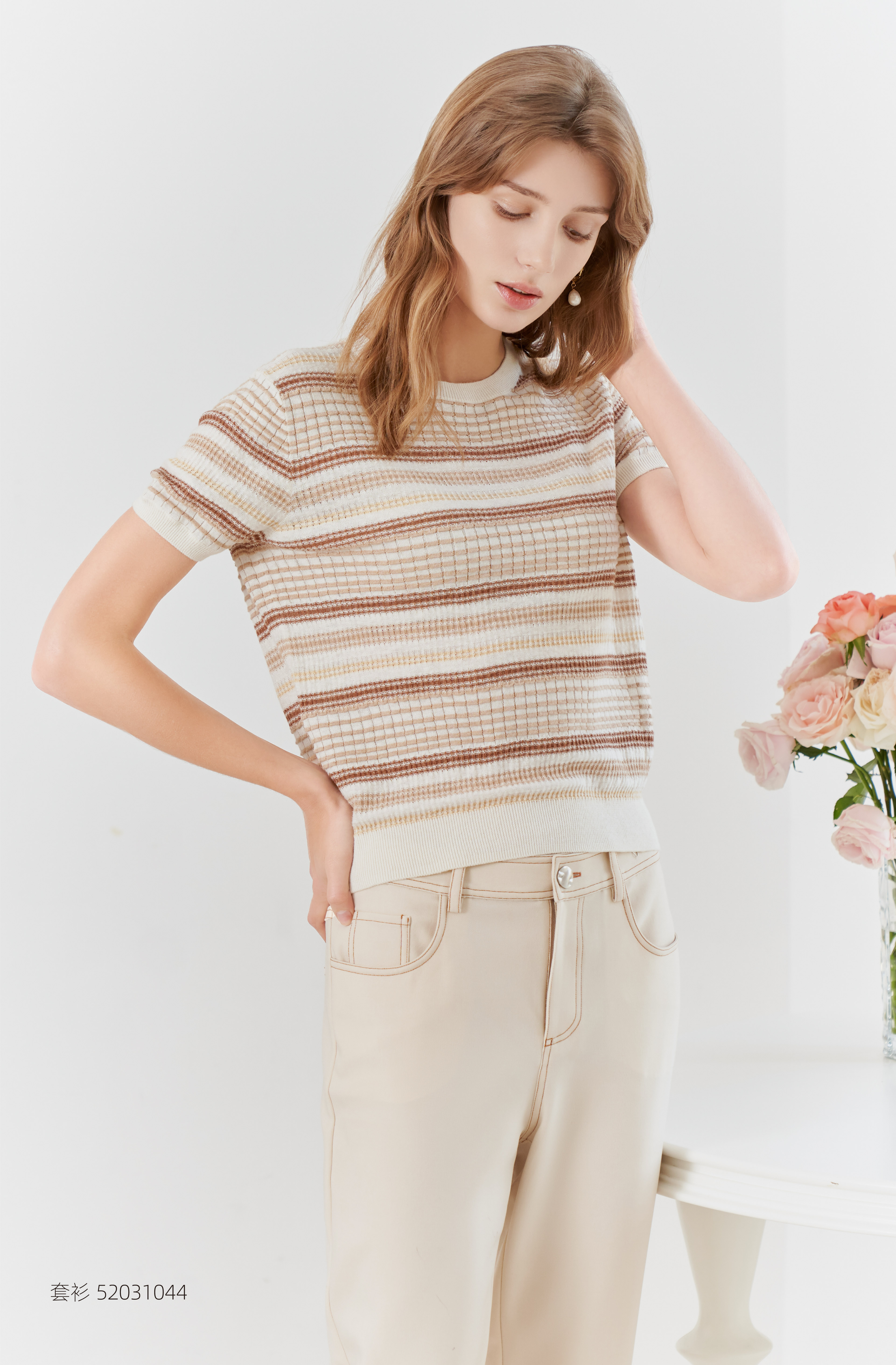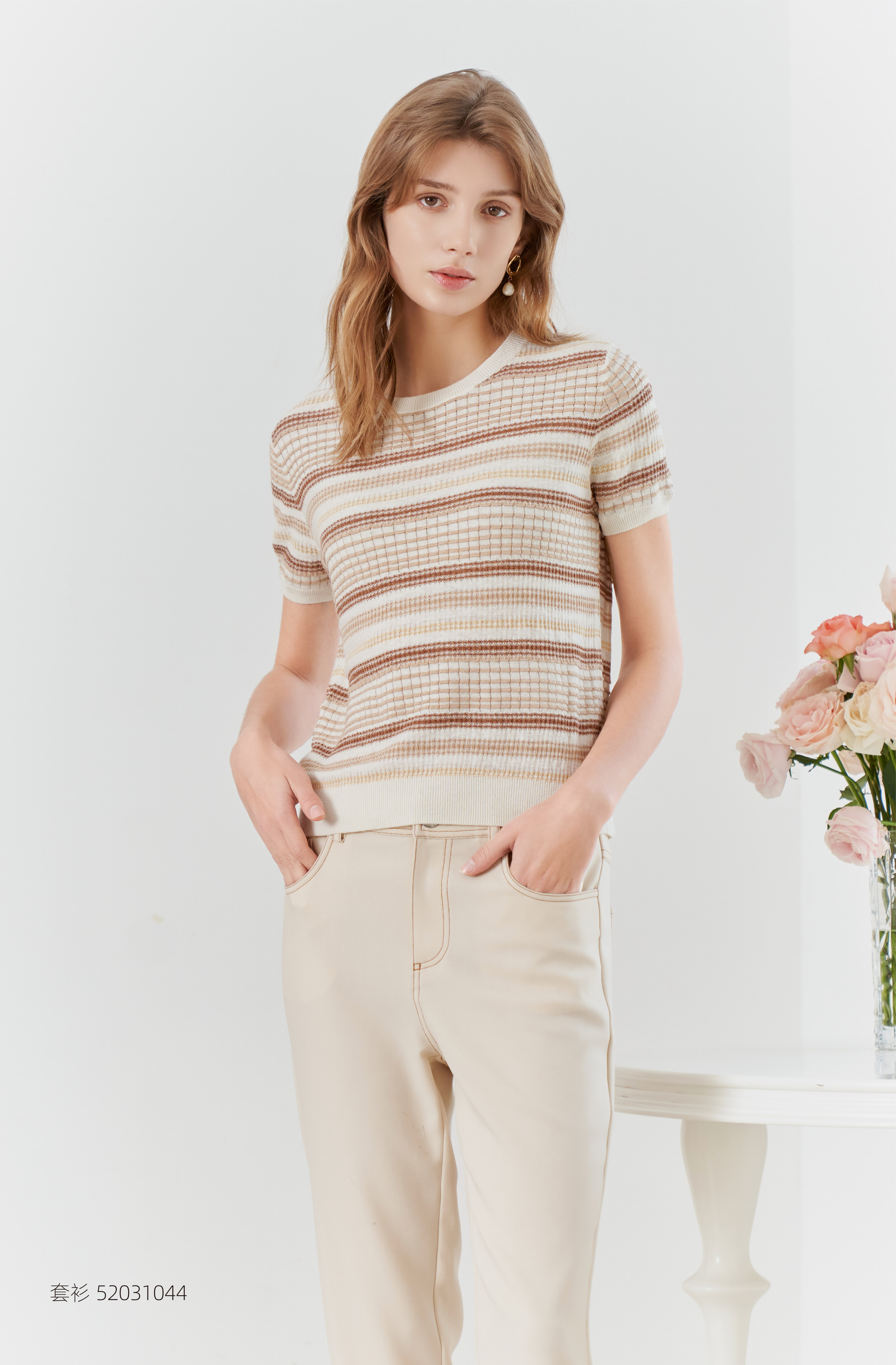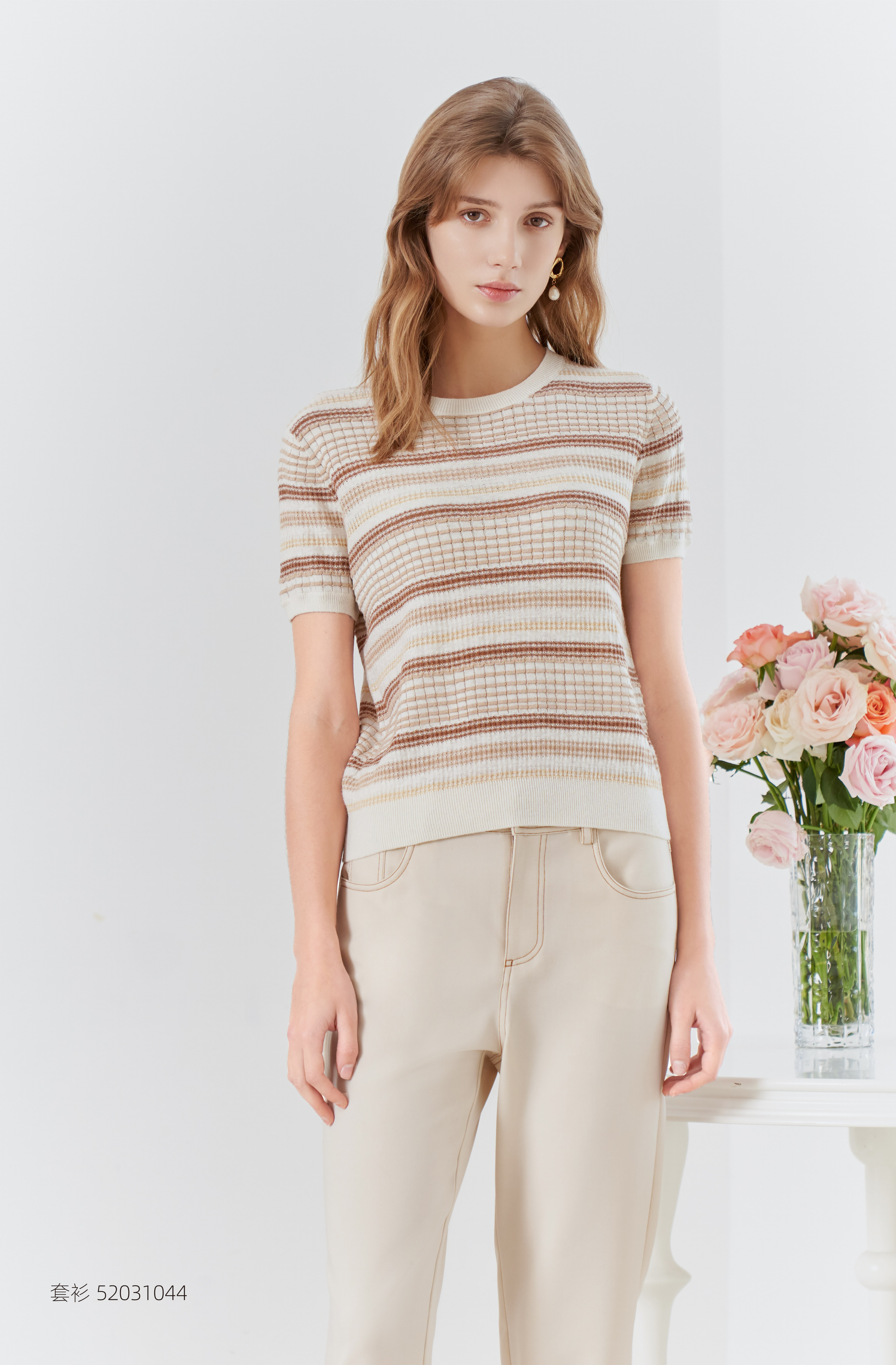 【棉麻短袖针织T恤】23年春夏新品棉麻针织上衣时尚圆领条纹套衫