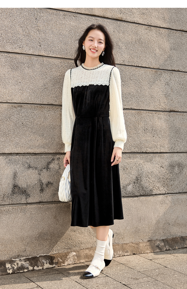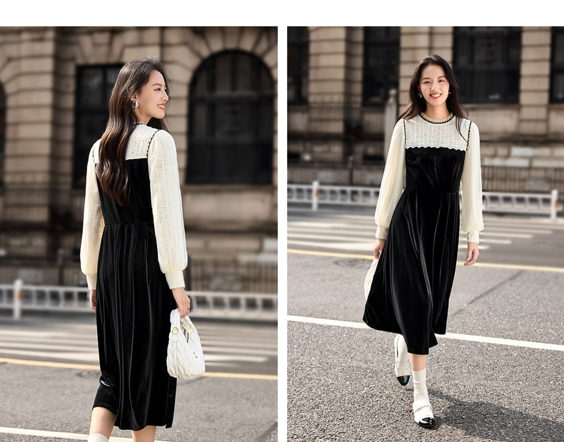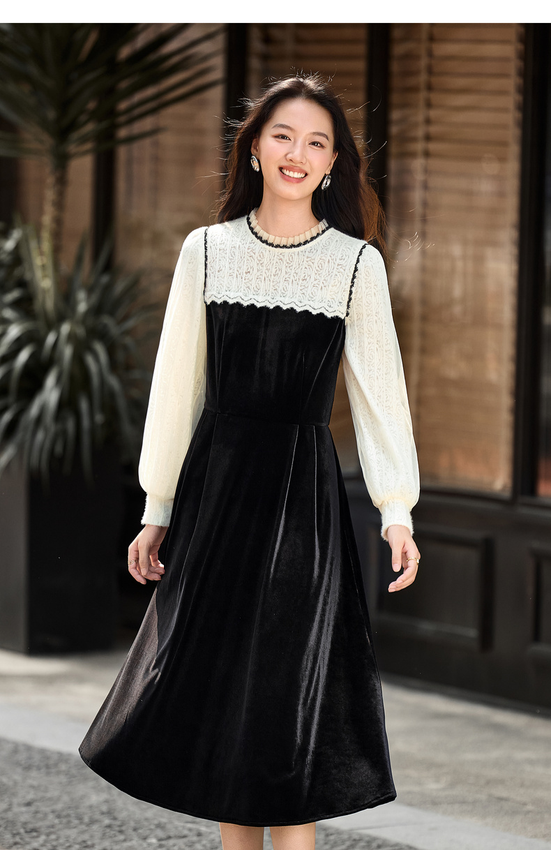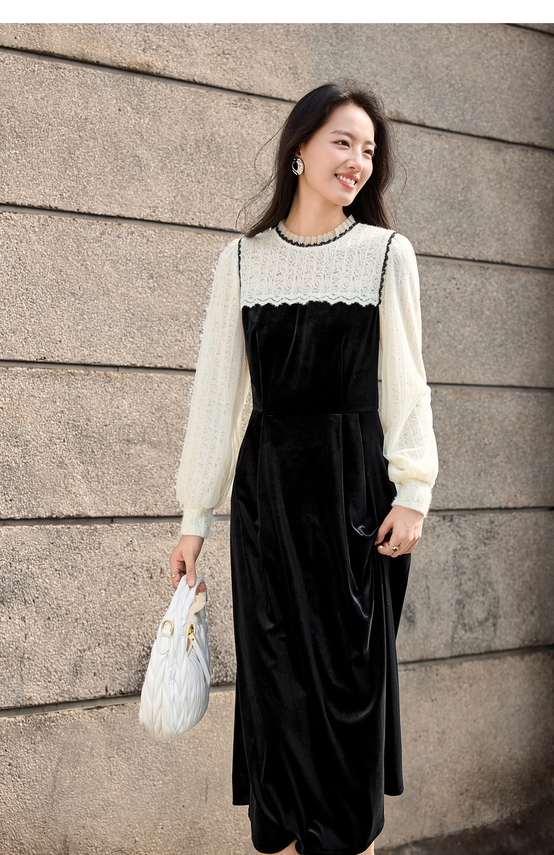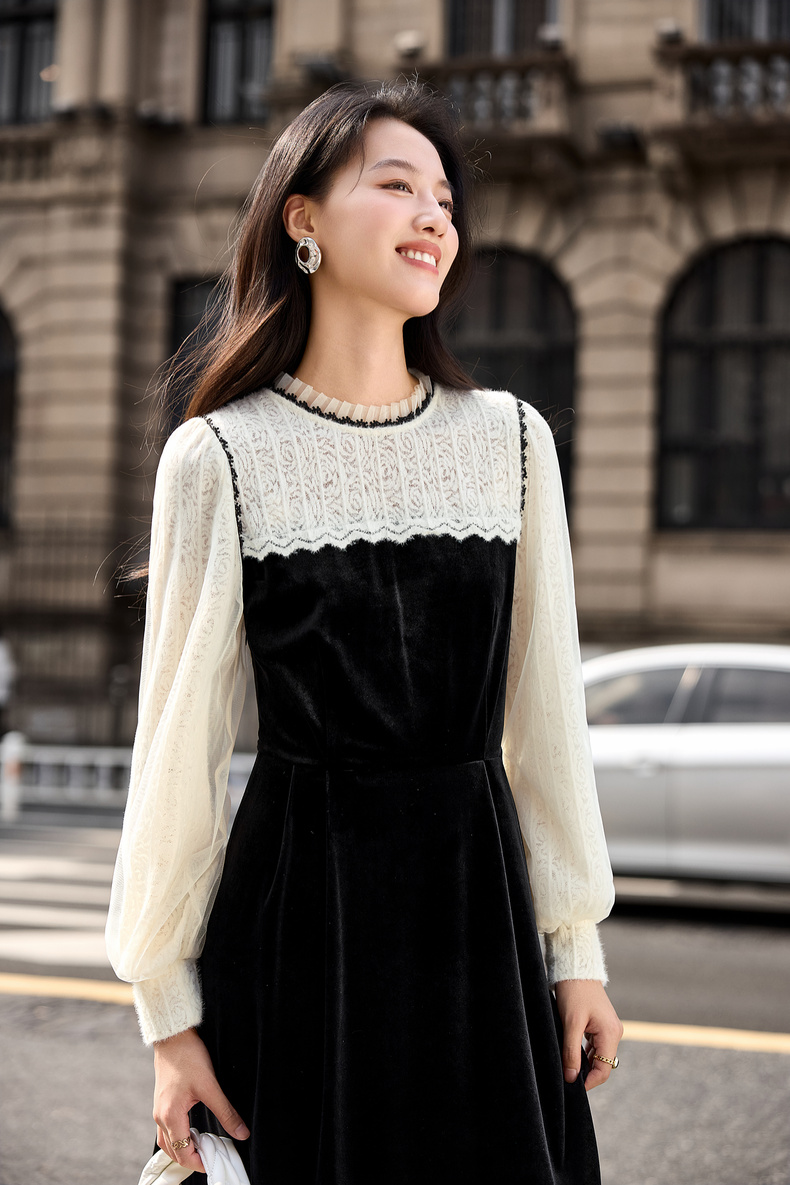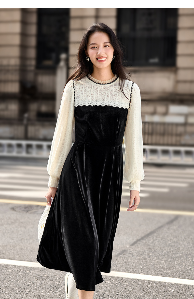 【内购】【假两件】通勤聚会褶艺圆领撞色拼接蕾丝网纱灯笼袖丝绒连衣裙-W54LI3356