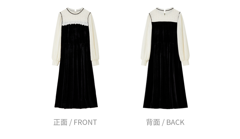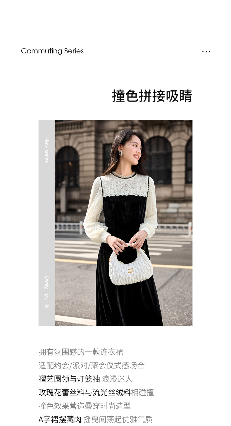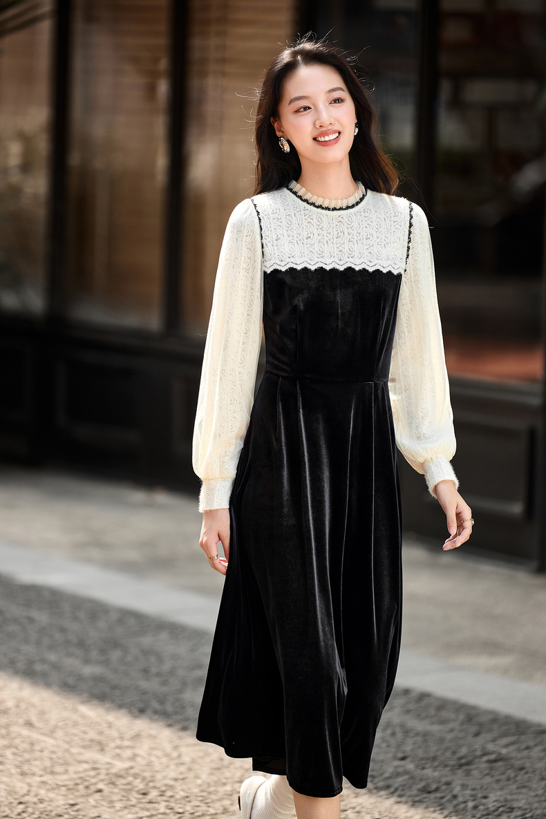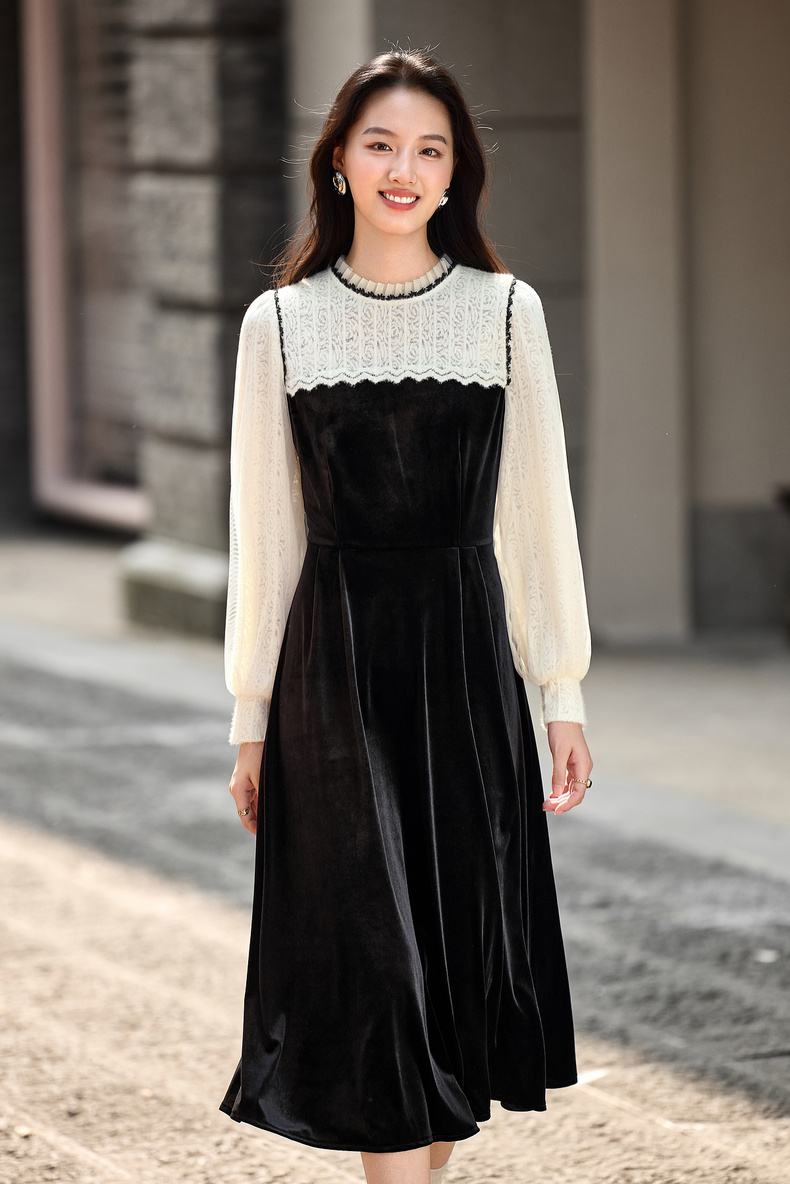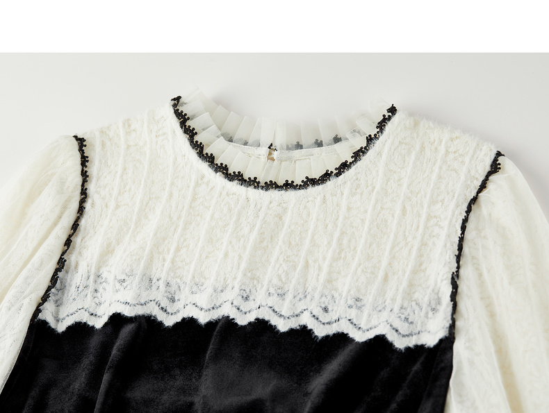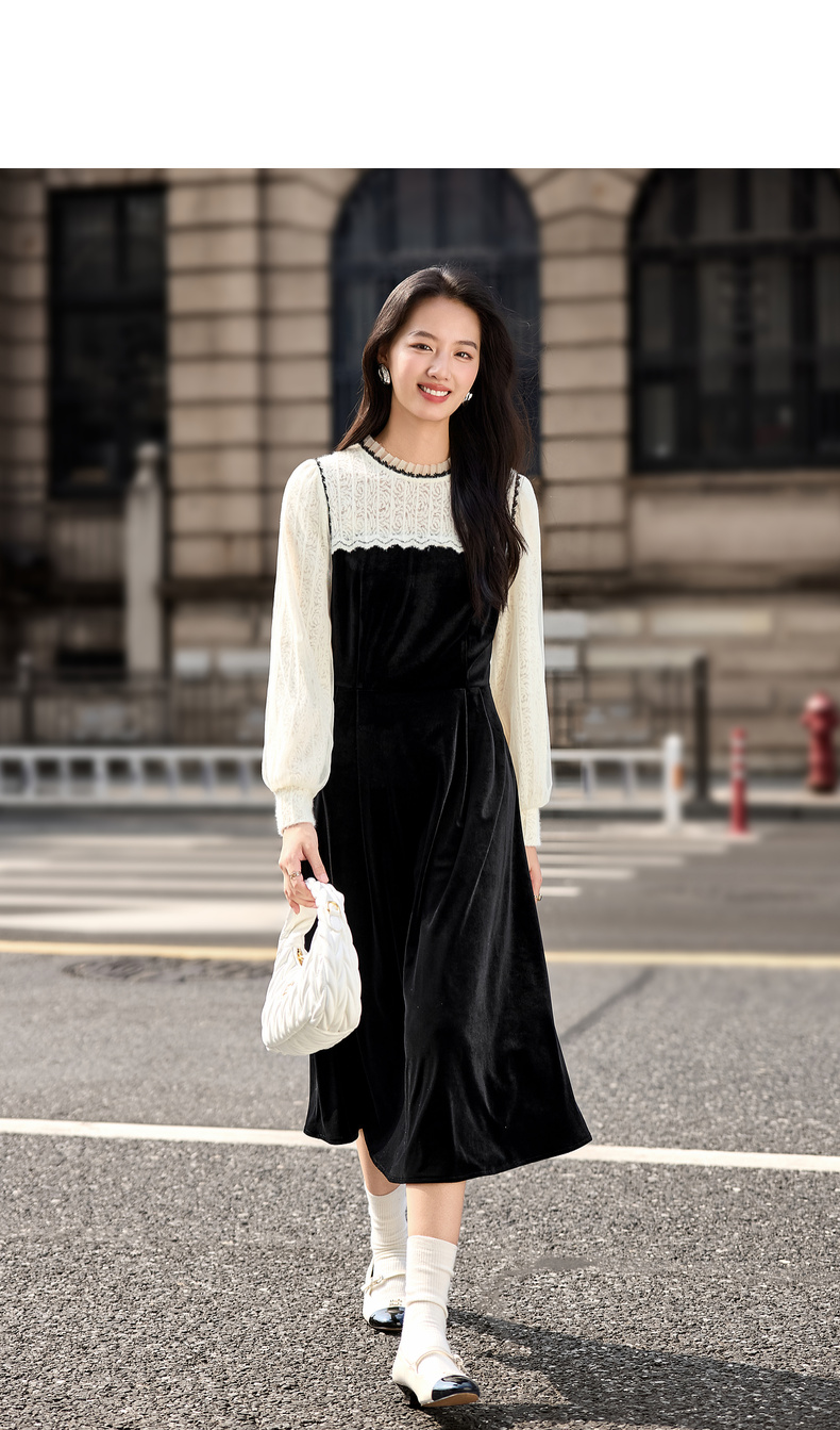 【内购】【假两件】通勤聚会褶艺圆领撞色拼接蕾丝网纱灯笼袖丝绒连衣裙-W54LI3356