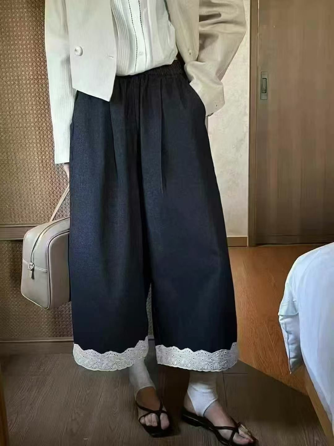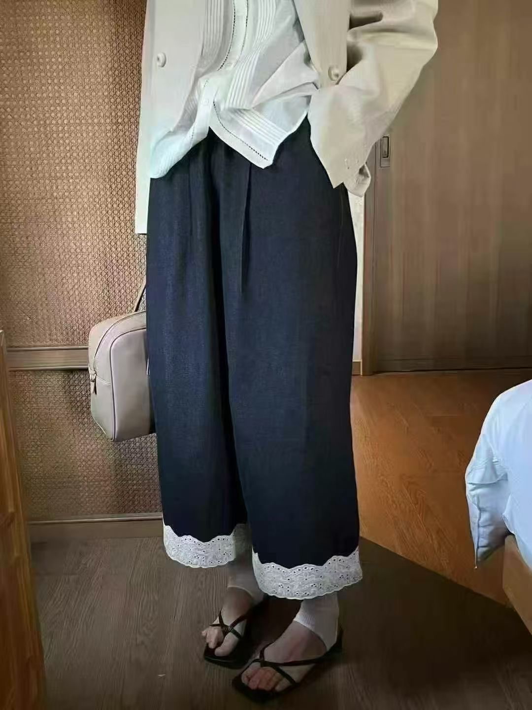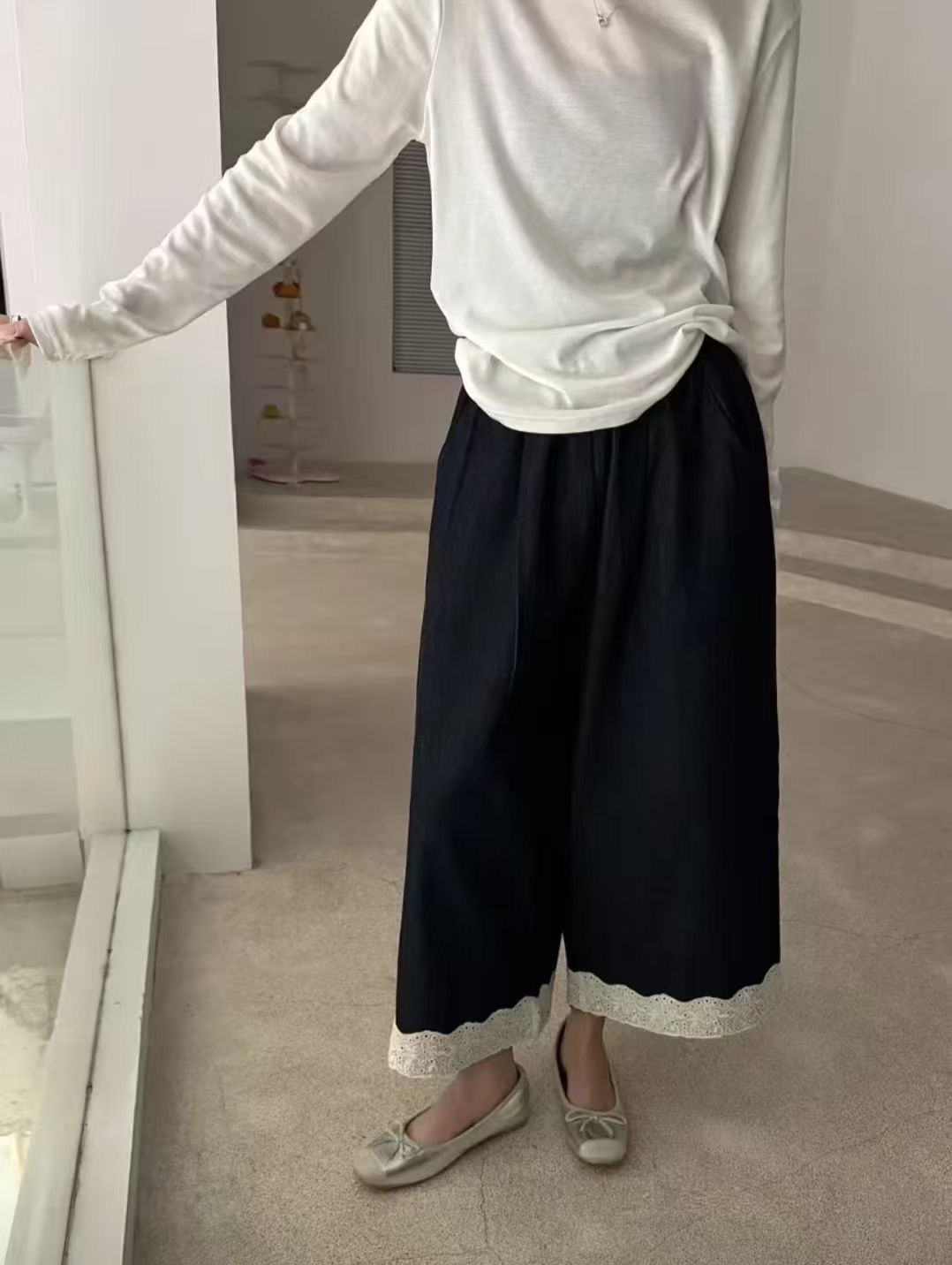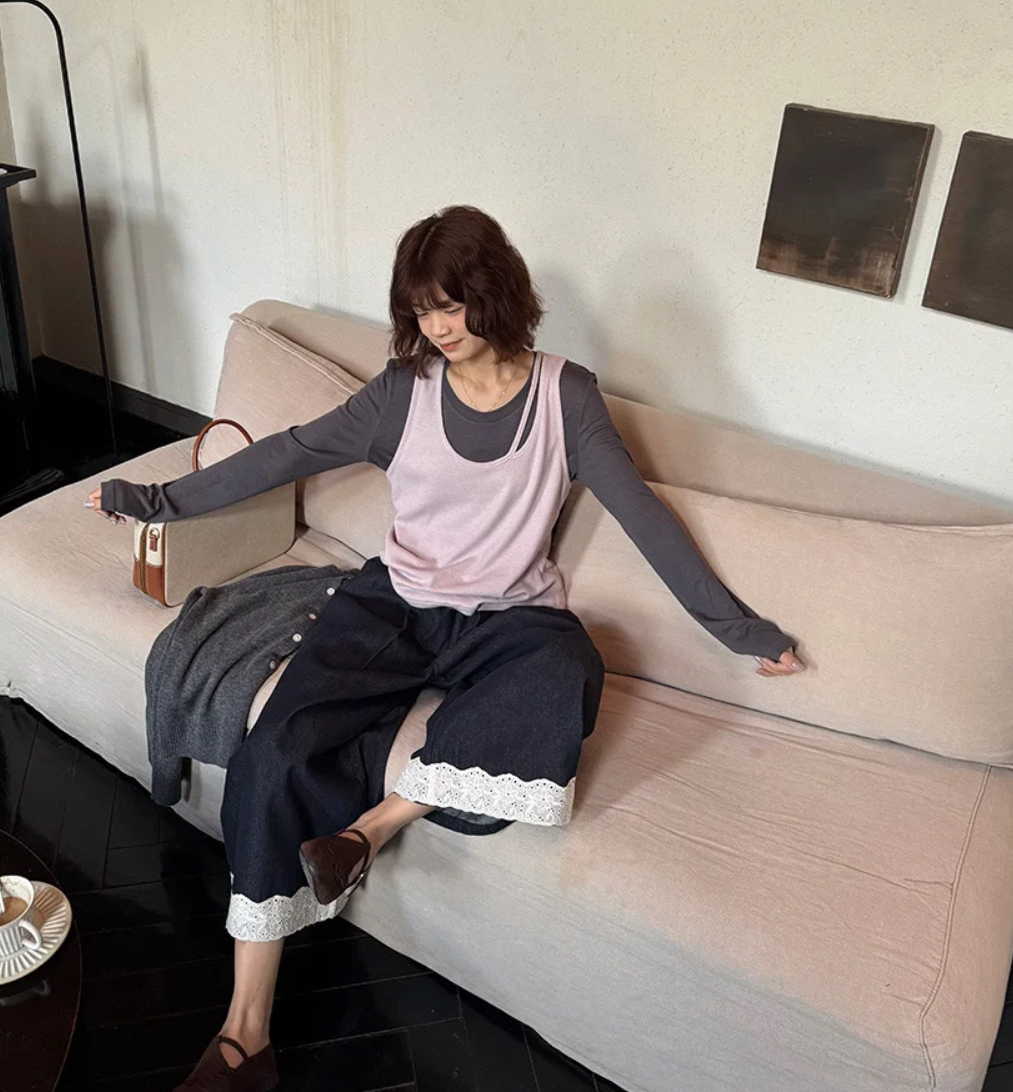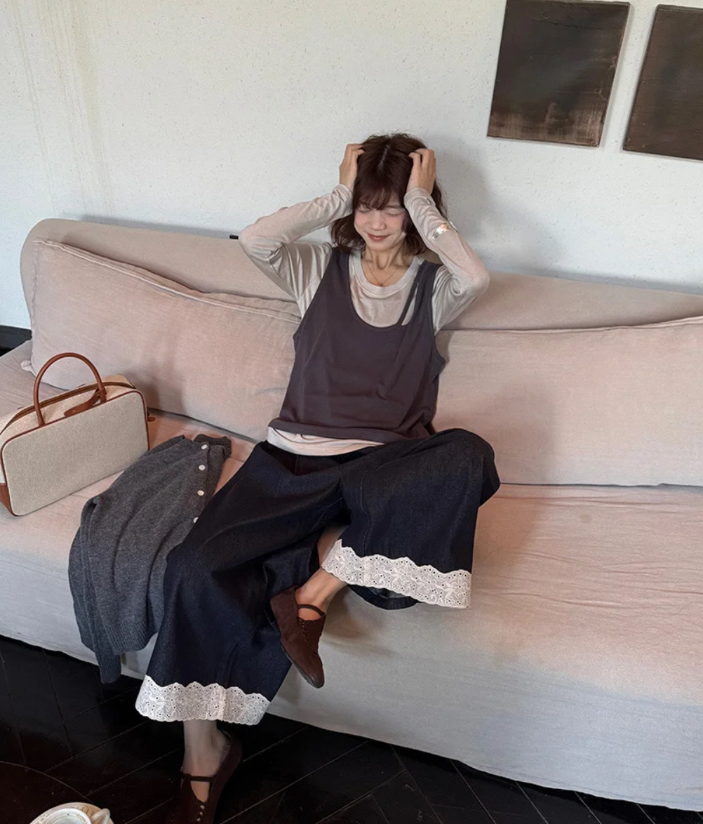 老米优品🎈3-5天!韩代同款《复古单宁色 设计款蕾丝边阔腿牛仔裤》复古系不费力穿搭单品,不经意间的精致。K250311A 下架