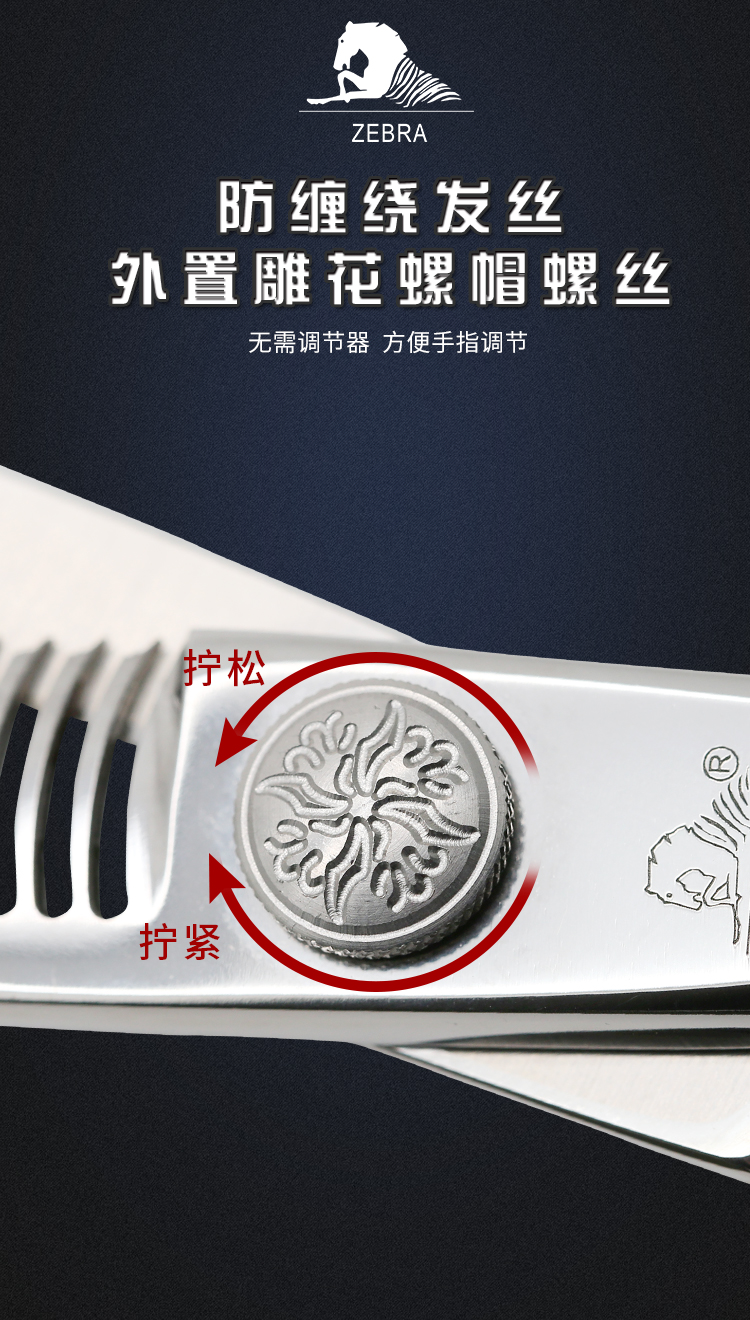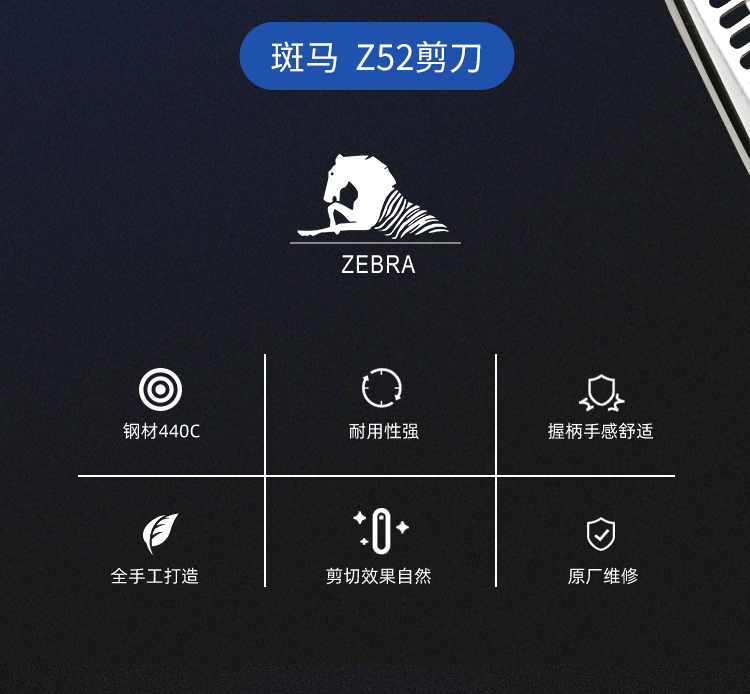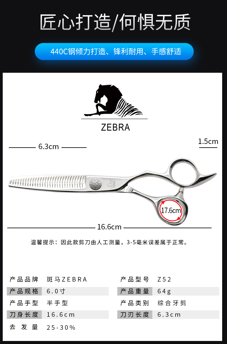ZEBRA斑马 剪刀 Z52 牙剪/调量剪/综合牙剪/打薄剪/去发量20-25%/ 鹿角齿/30根齿/正刃/6寸