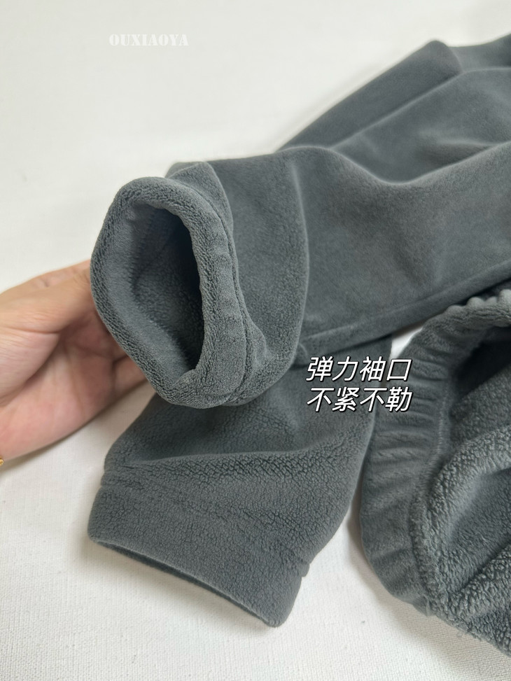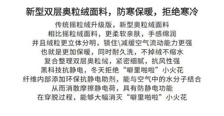 双面奥粒绒 这个秋冬不怕冷 谁能拒绝这么奶呼呼的奥粒绒家居套 暖了又暖的秘密,由内到外合理控温实现热量回流循环 高克重奥粒绒 摸上去的手感细腻柔软,耐磨经穿 肉眼可见的柔糯,快速聚热 亲肤不刺激!穿的安心!不掉毛!不起球!不静电! 聚暖效果超赞,上身柔软又厚实,到手绝对会感叹它的品质