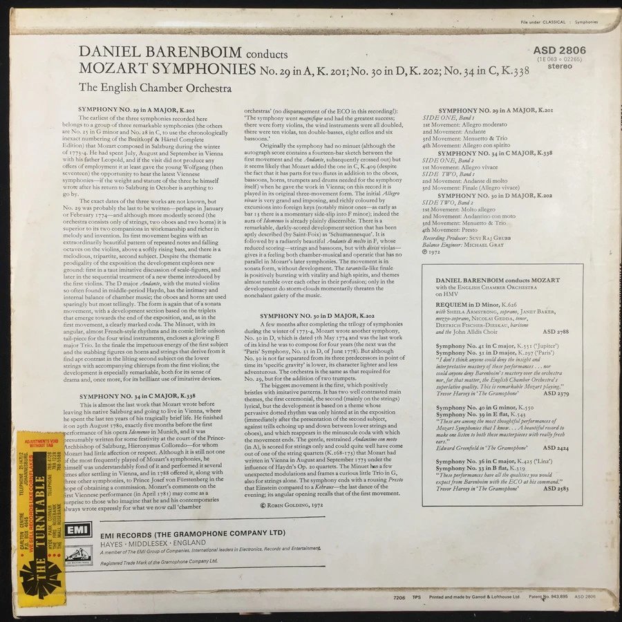 LP黑胶唱片 莫扎特第29. 30. 34交响曲 丹尼尔·巴伦博伊姆指挥