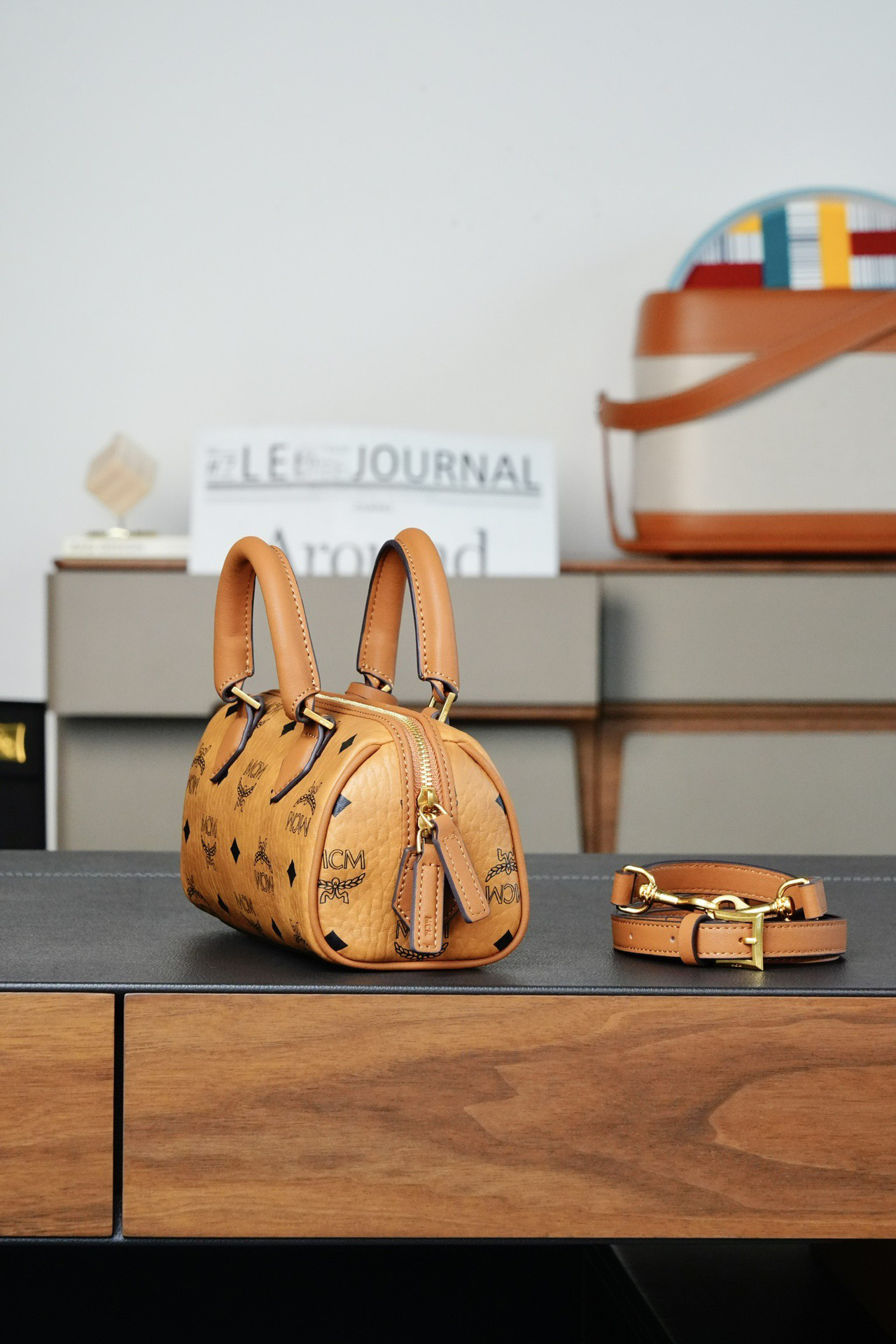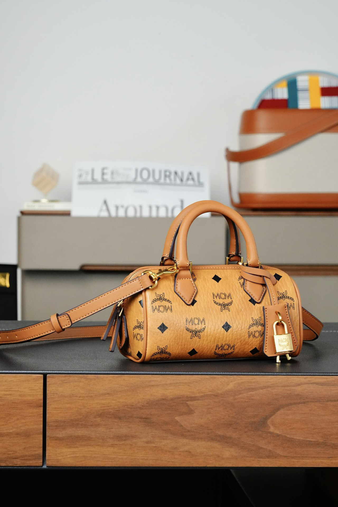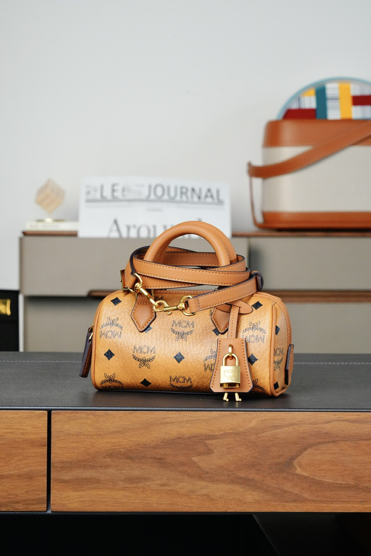 秋冬特惠💰780 原单MCM 原厂皮 干邑色𝙈𝙞𝙣𝙞 波士顿挂锁包MWPCSVI01CO001 Visetos波士顿包