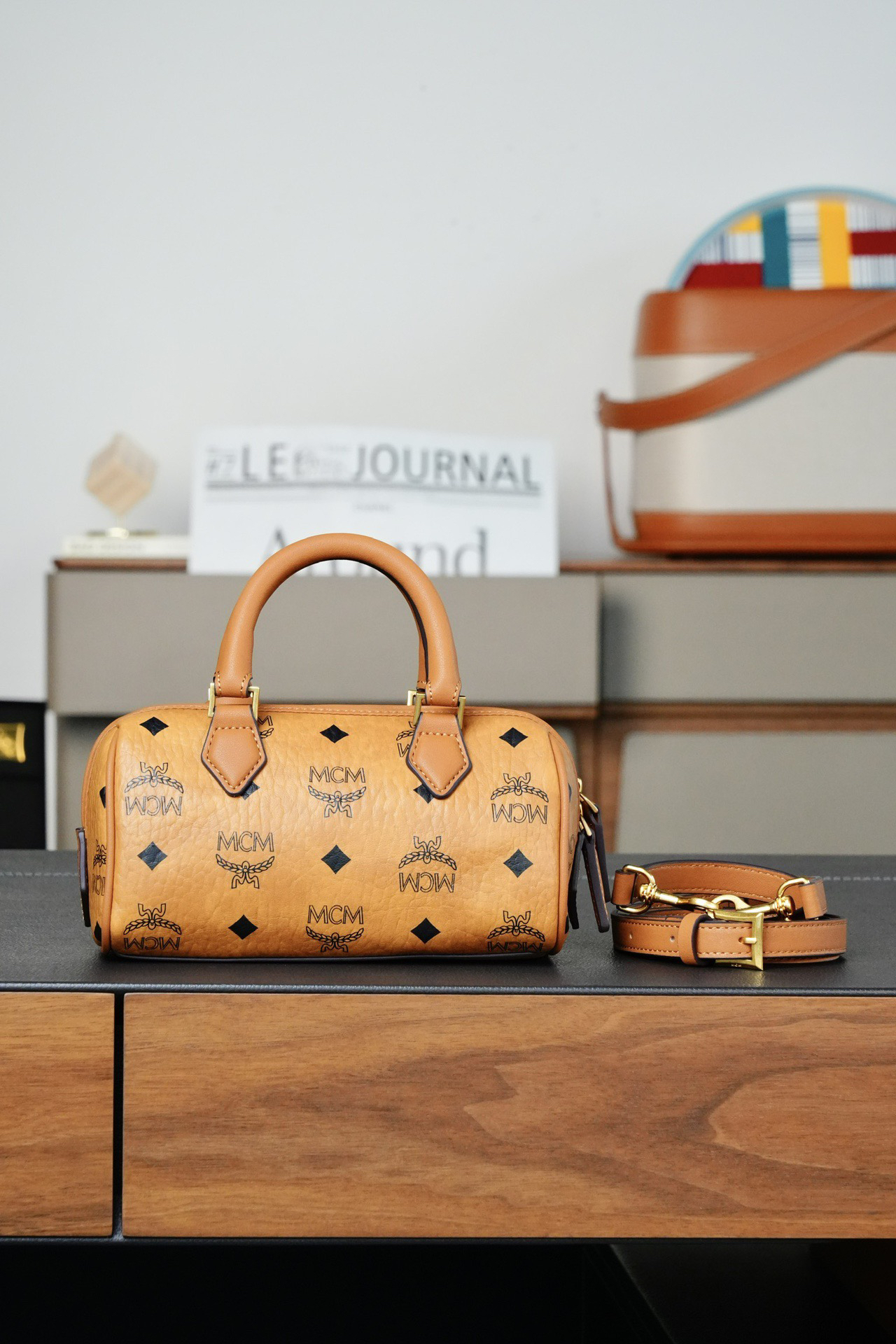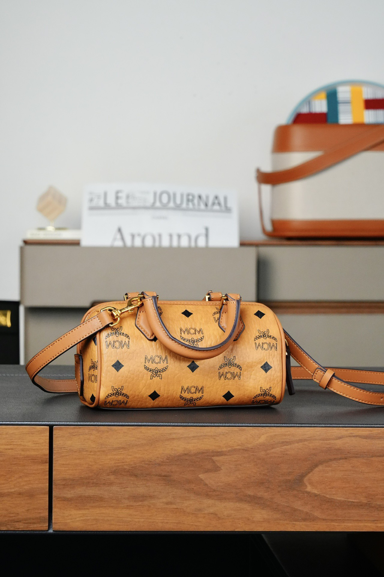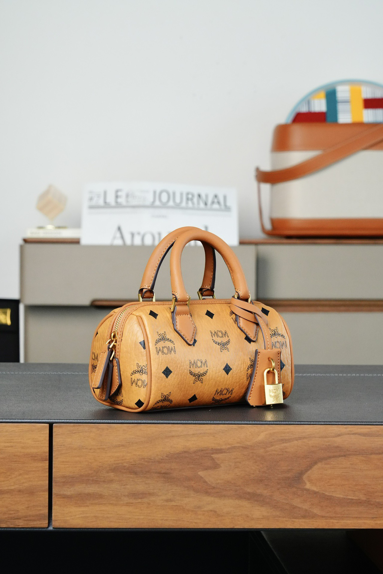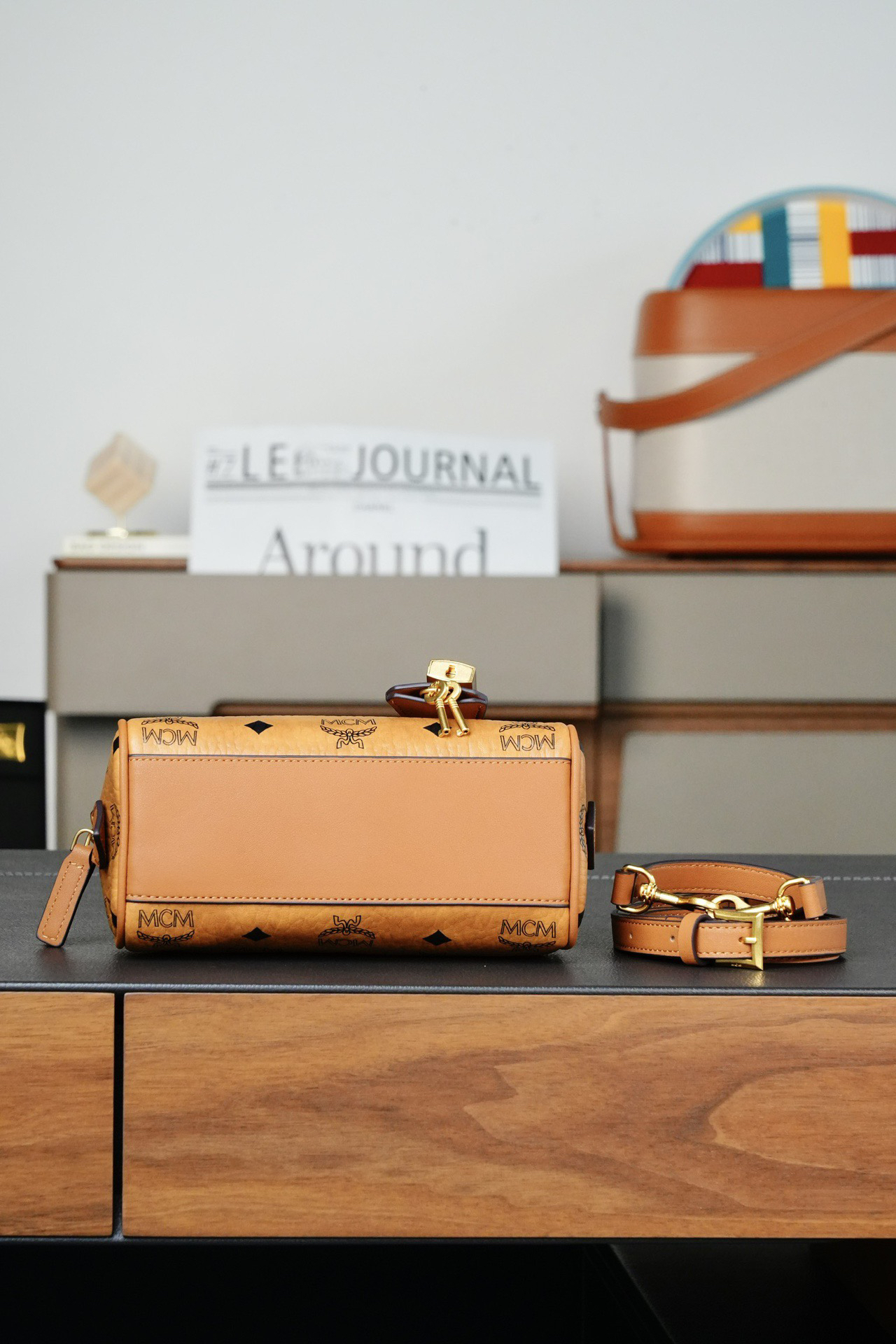 秋冬特惠💰780 原单MCM 原厂皮 干邑色𝙈𝙞𝙣𝙞 波士顿挂锁包MWPCSVI01CO001 Visetos波士顿包